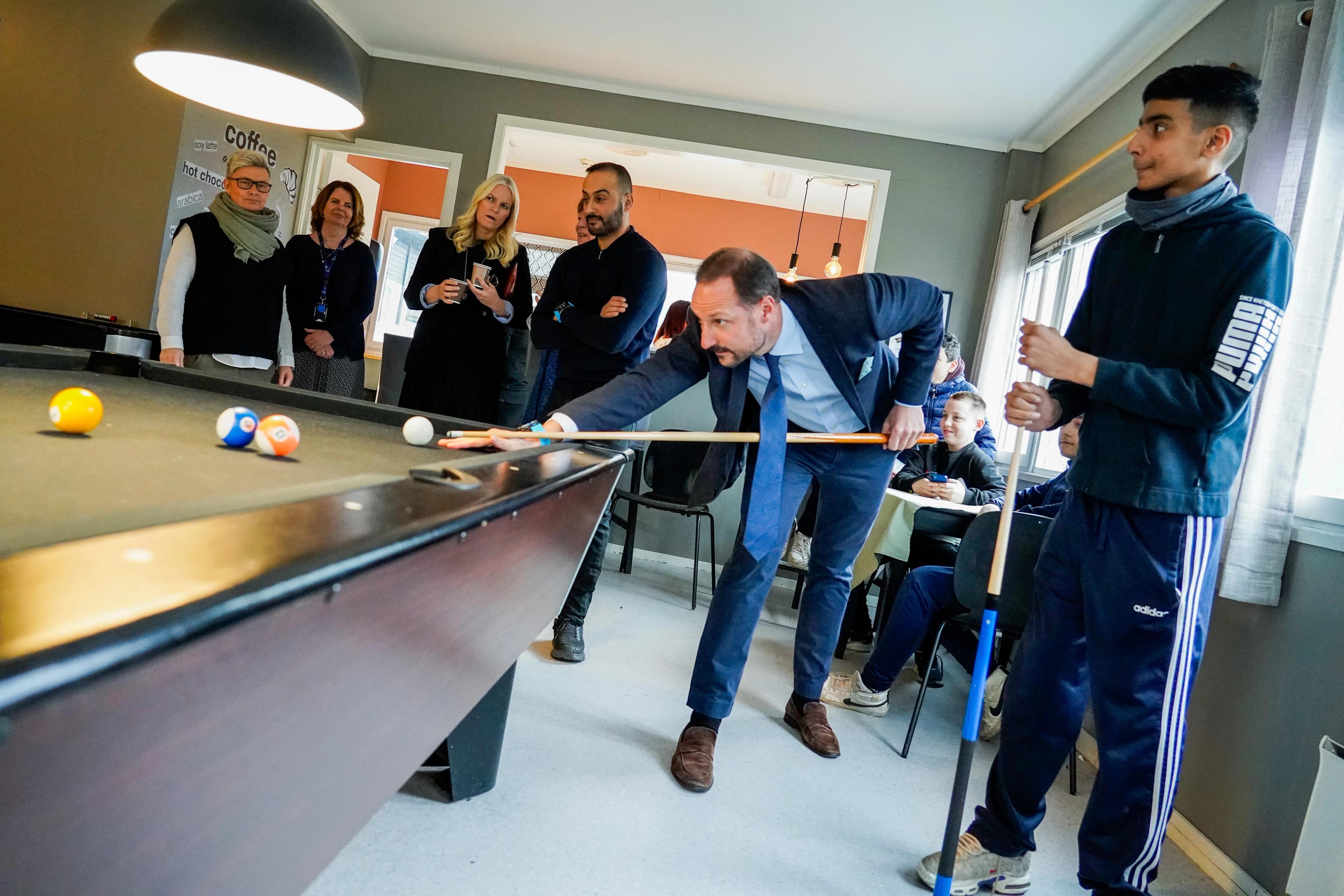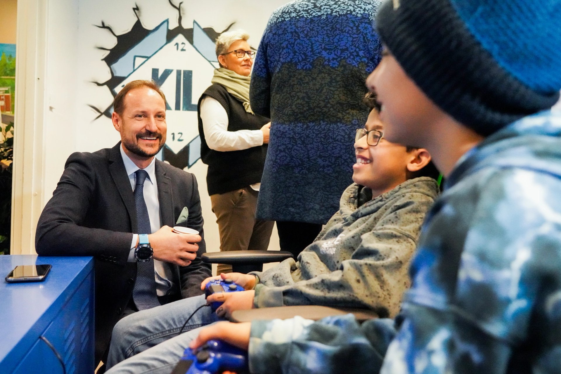 Kronprinsparet satte seg ned sammen med ungdom som benytter seg av Aktivitetshusets tilbud og frivillige som jobber med barn og unge i bydelen, og fikk høre om erfaringene med de ulike tilbudene på Mortensrud.