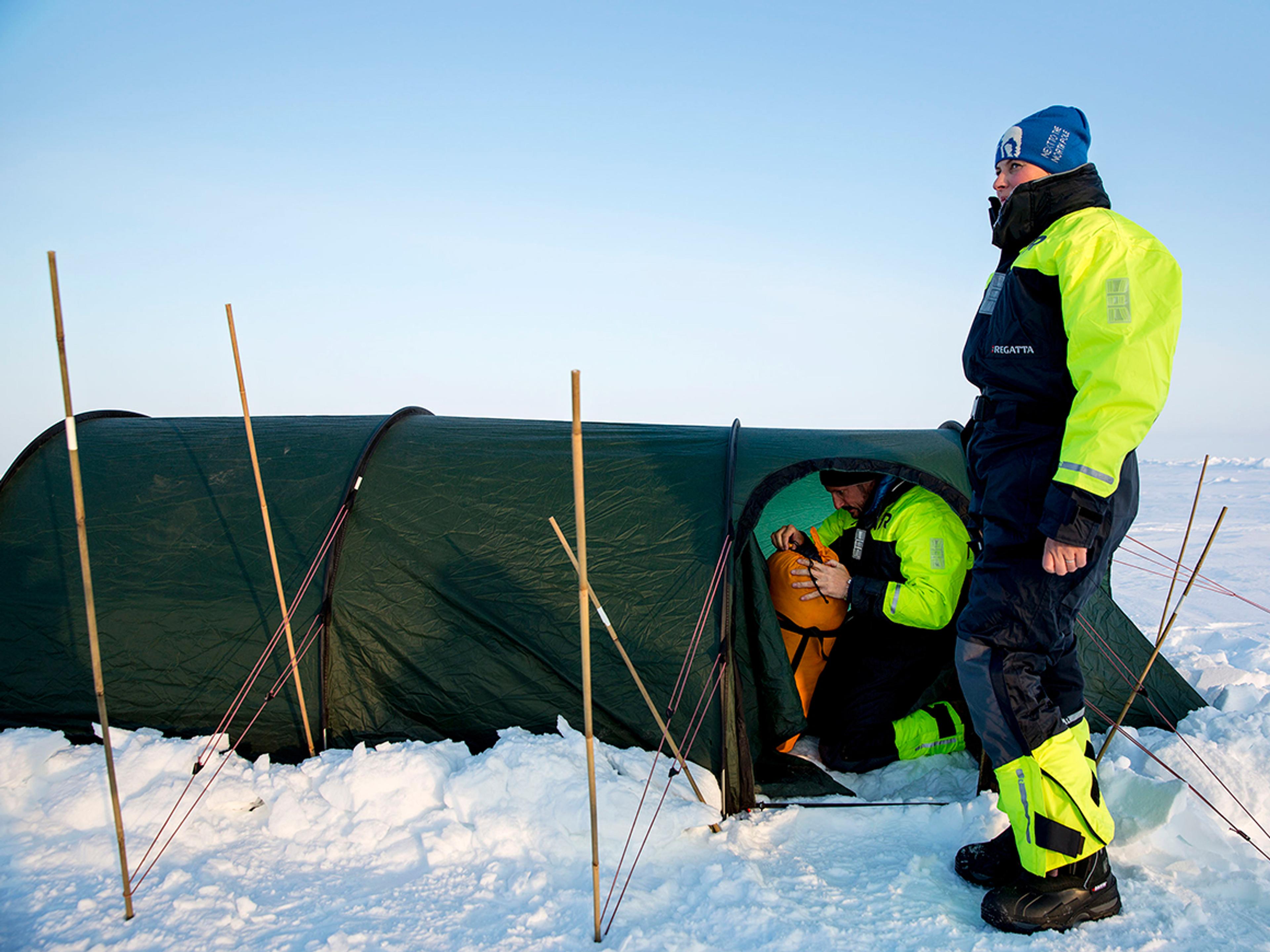I kveld overnattar Kronprinsen og Kronprinsessa på isen ved Lance. Det blir telt og soveposar – og isbjørnvakt.