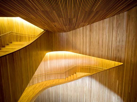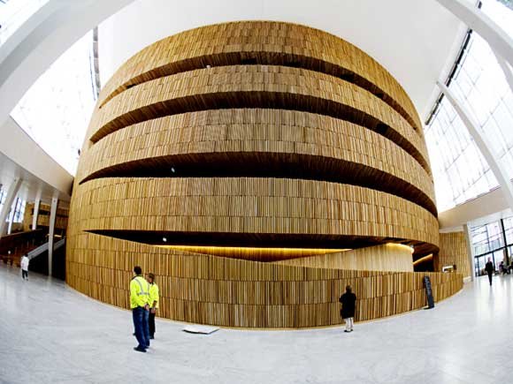 Inne i publikumsfoajeen står den islandske kunsteren Olafur Eliassons garderobevegger, bygget med geometriske, tredimensjonale og belyste former.