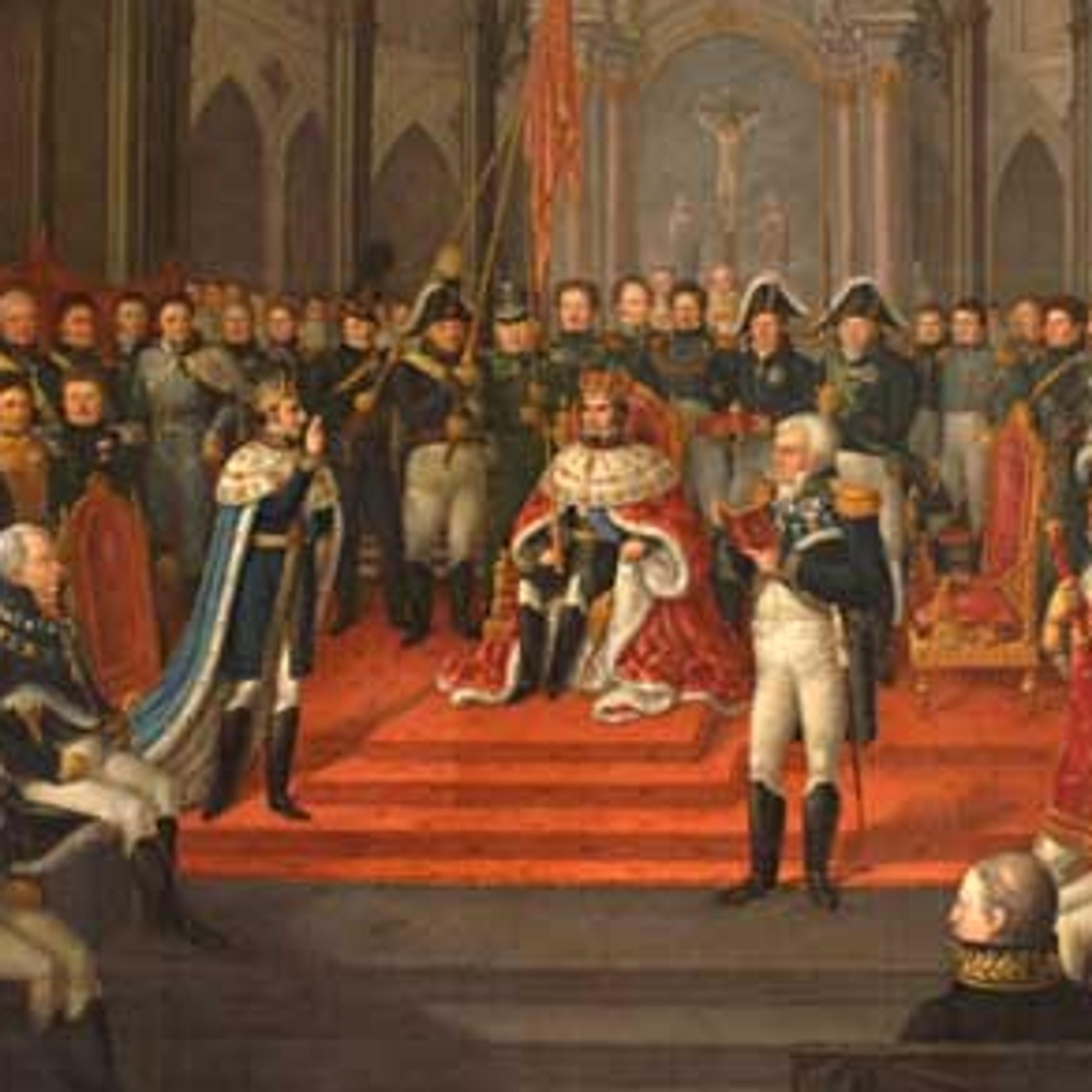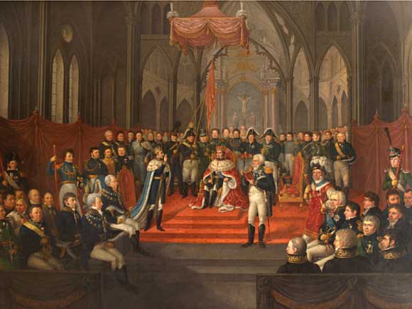 Hovedverket i utstillingen er Jacob Munchs maleri fra kroningen av Kong Carl Johan i 1818 – øyeblikket da Kronprins Oscar avlegger sin ed som Kronprins. Til daglig henger maleriet i Speilsalen på Slottet.