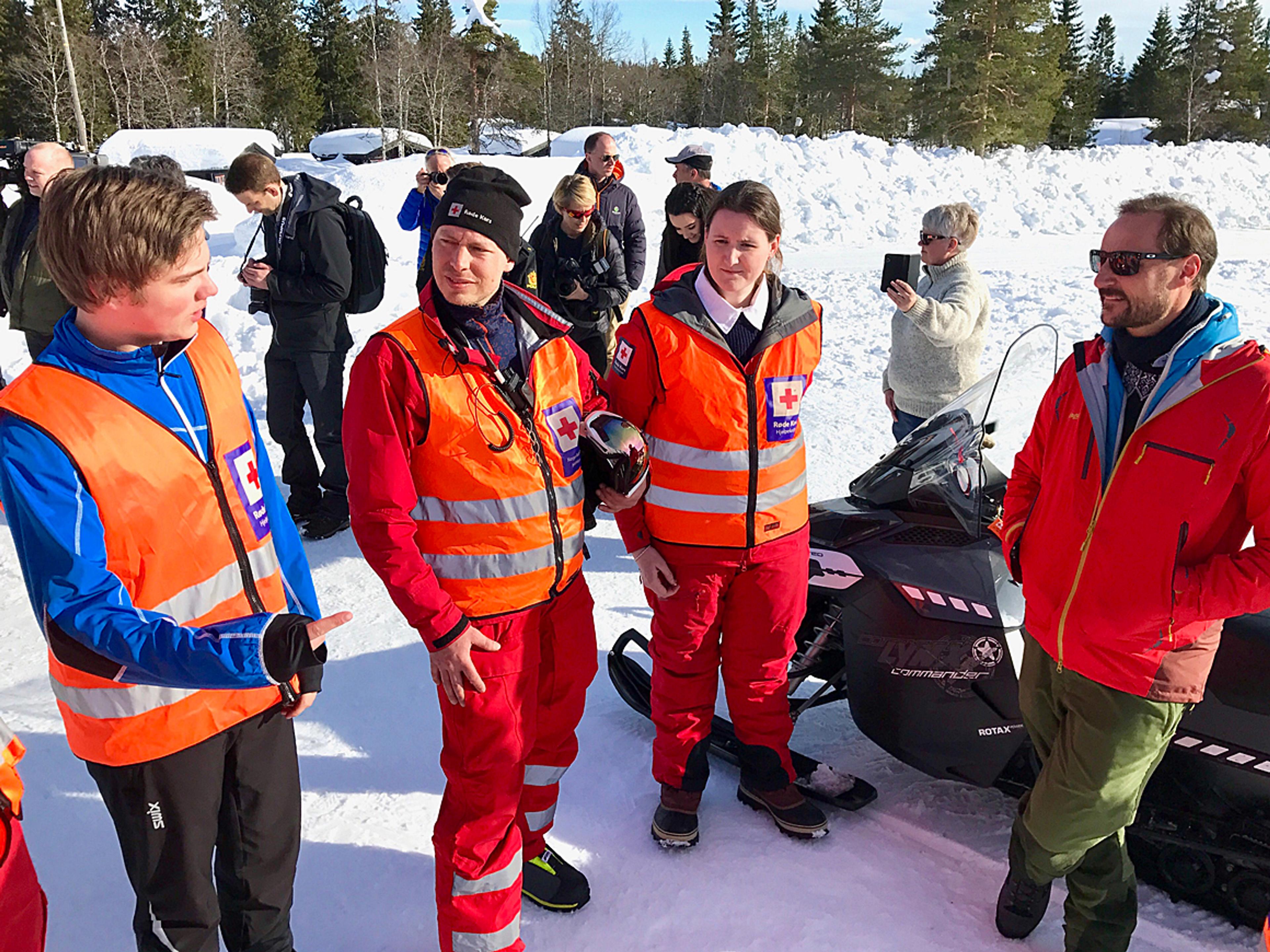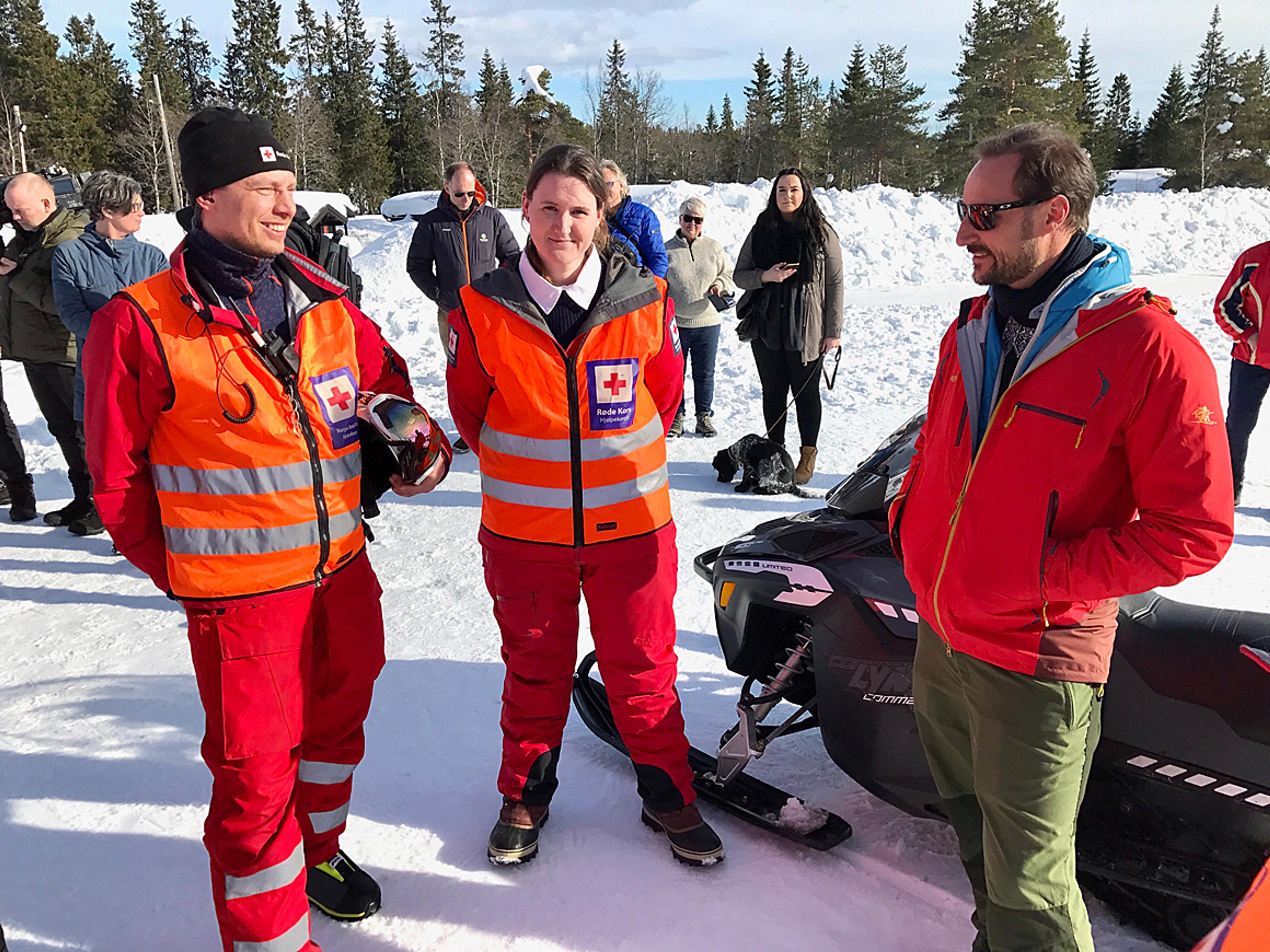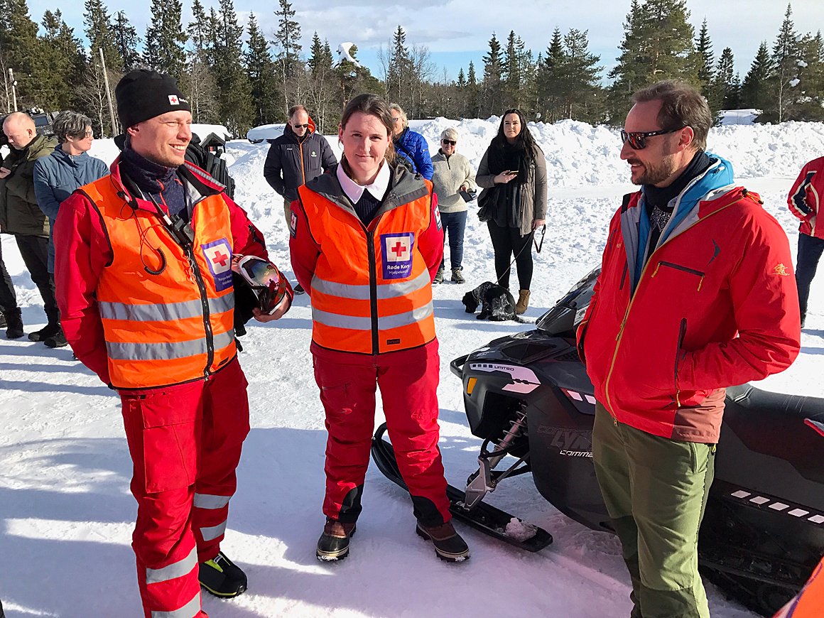 Kronprinsen fikk også overvære en redningsøvelse under besøket. Øvelsen gikk ut på å frakte en skadet skigåer til behandling ved bruk av snøscooter.