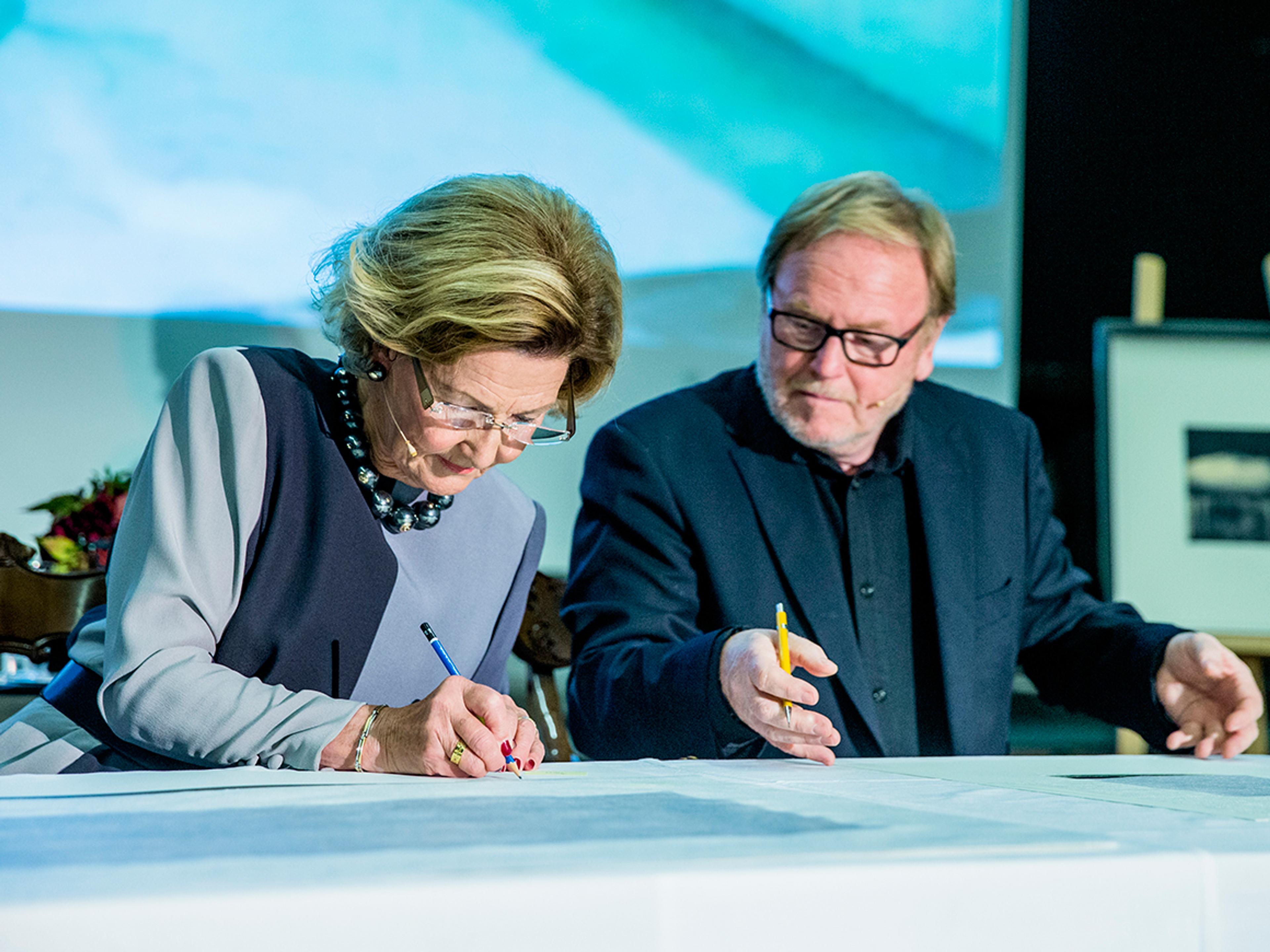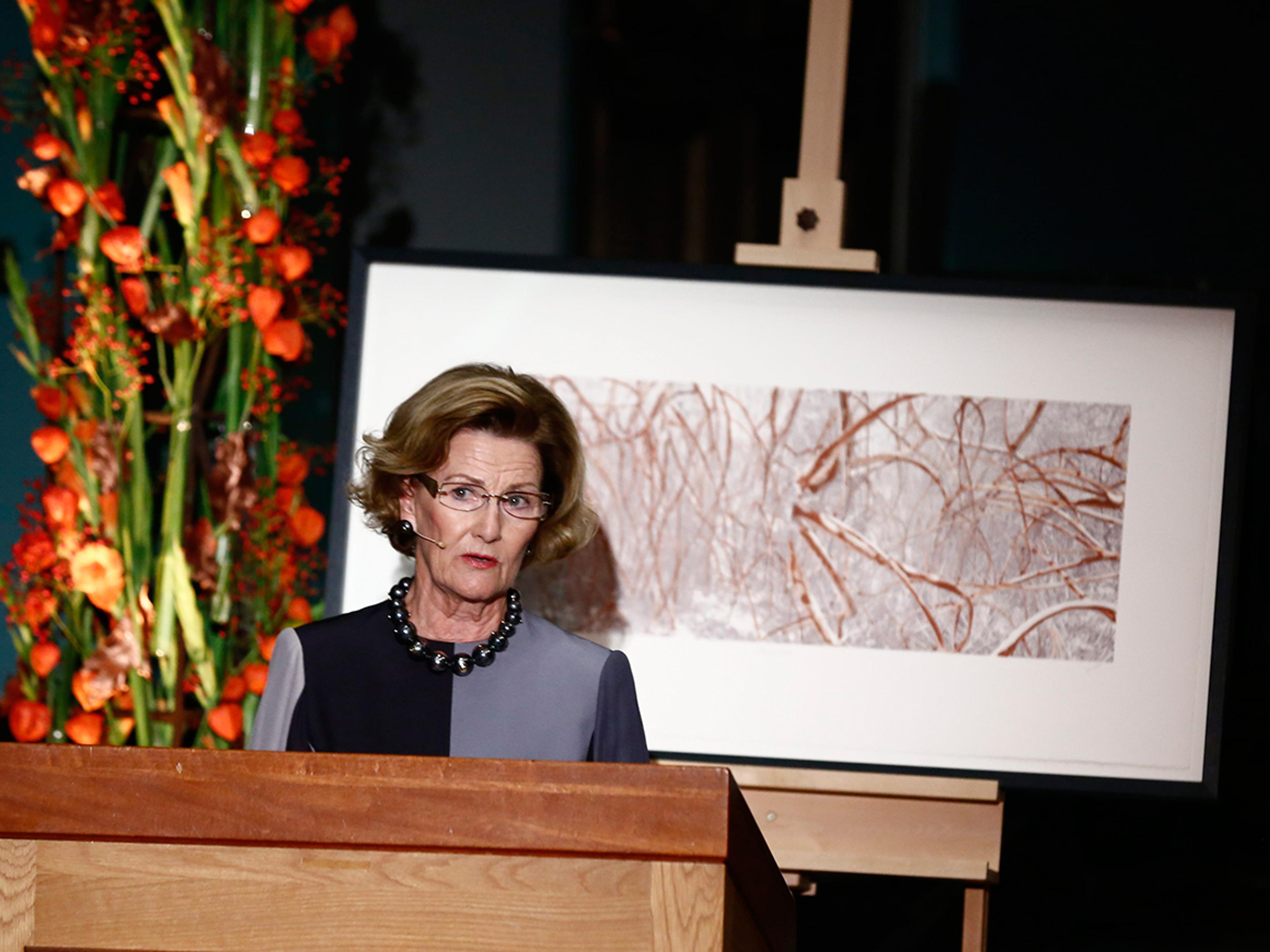 Dronningen og Ørnulf Opdahl presenterte også nye grafikkarbeider, utviklet i samarbeid med ULAE i New York. I USA er det en utbredt tradisjon at kunstnere inviterer til signeringsarrangement, og Dronning Sonja og Opdahl signerte sin nye grafikk fra scenen i Nasjonalgalleriet i kveld.