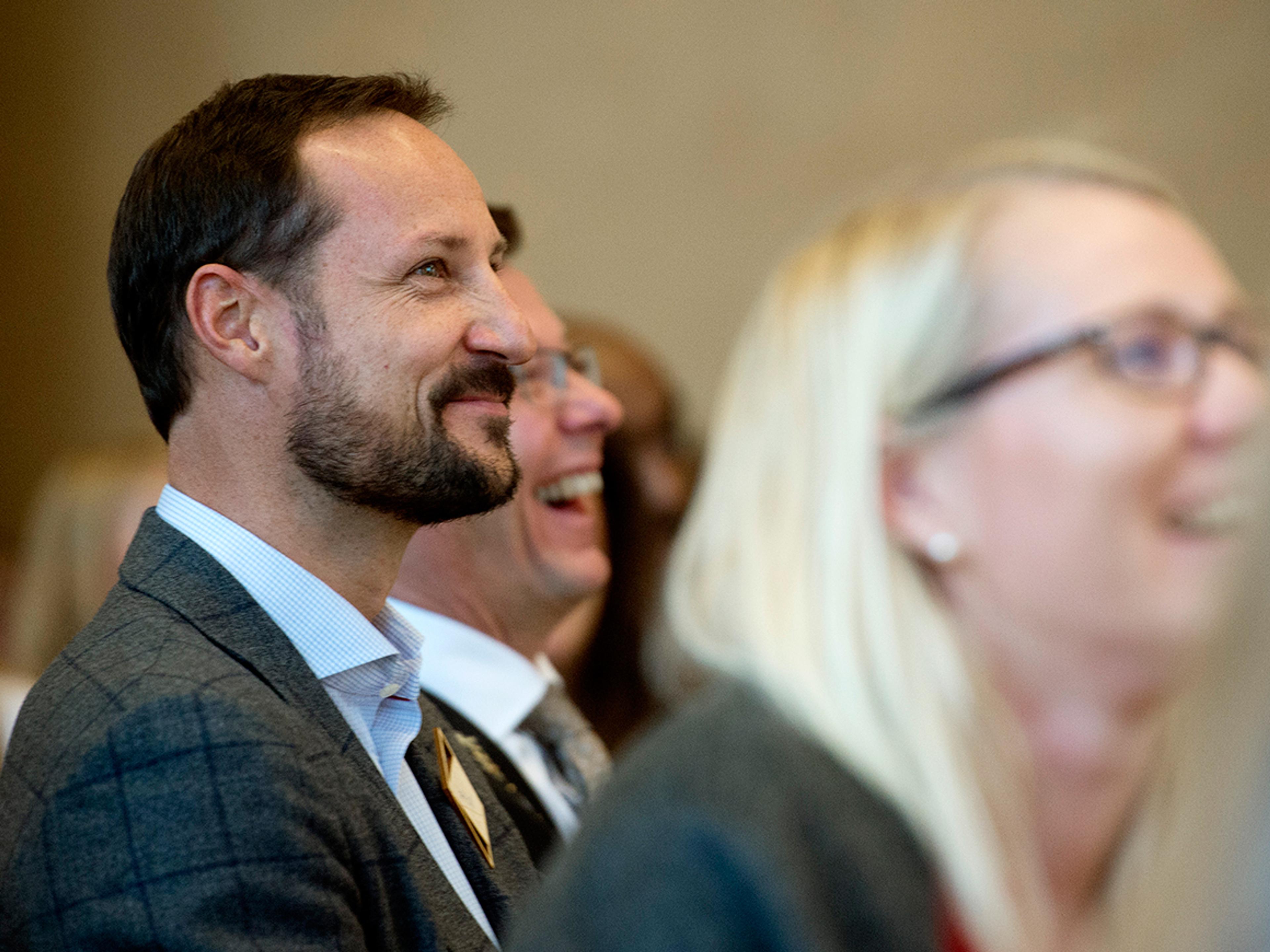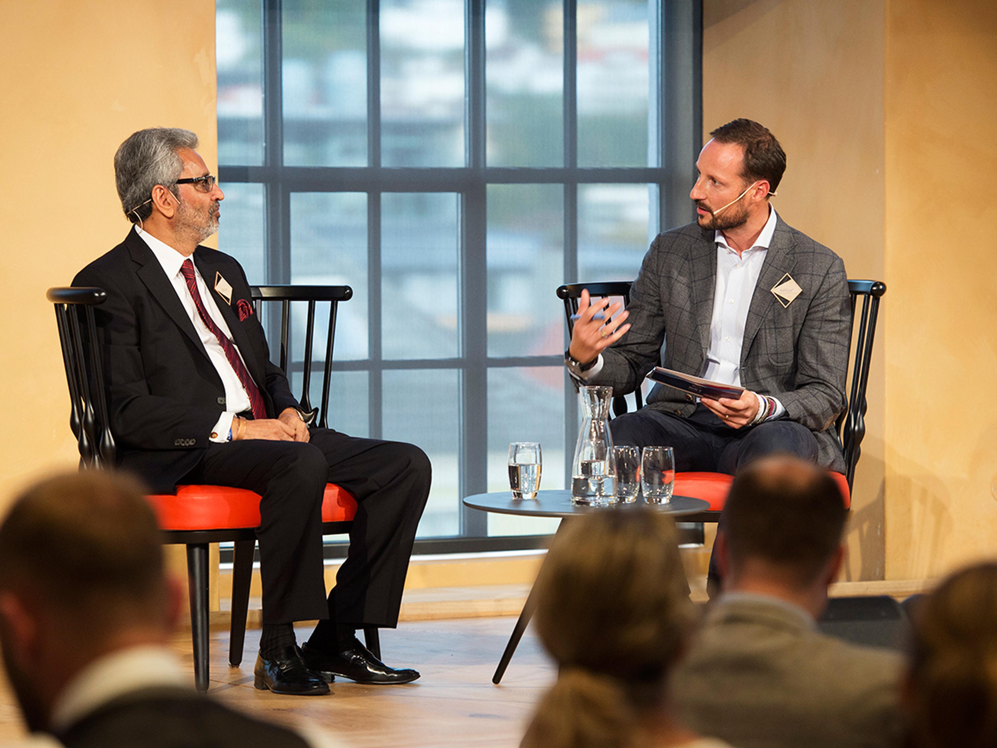 Kronprins Haakon var selv i samtale på podiet, med Bawa Jain - generalsekretær i World Council of Religious Leaders.