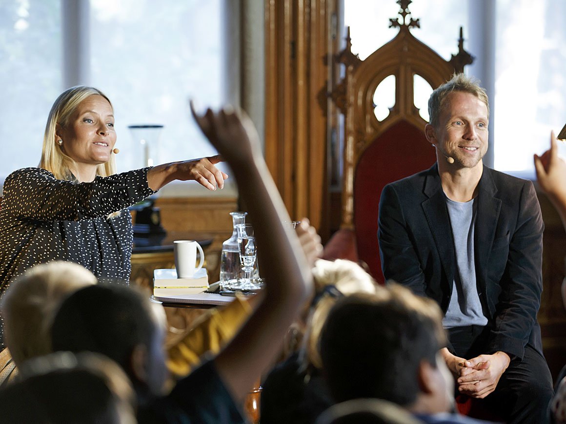 Kronprinsessen introduserte Lars Joachim Grimstad som leste fra sine to barnebøker «Barna som forsvant» og «Solkongen». Femteklassingene fulgte spent med, lo av morsomme poeng i bøkene og stilte spørsmål til forfatteren om hva som kom til å skje videre.