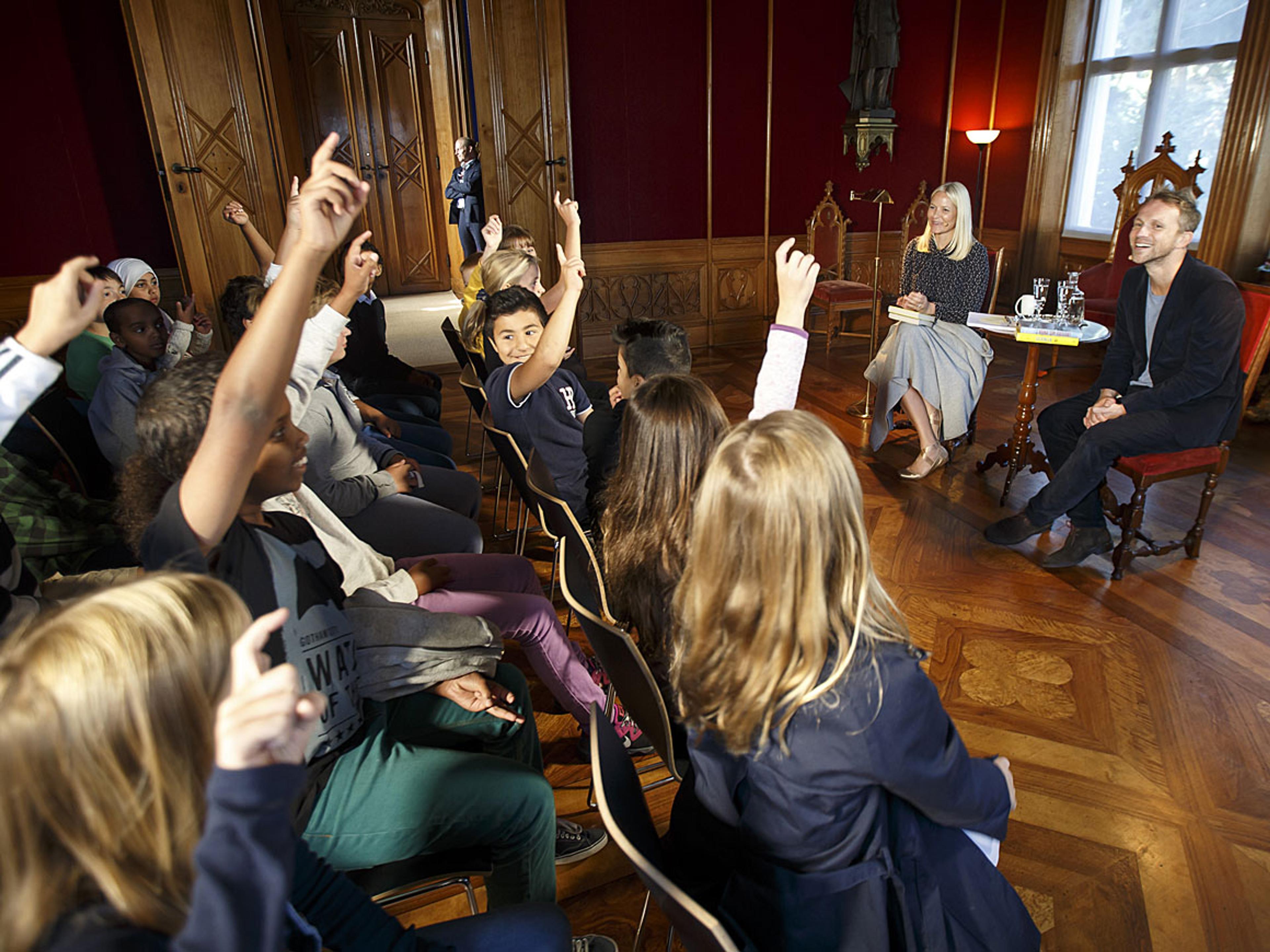 H.K.H. Kronprinsesse Mette-Marit og forfatter Lars Joachim Grimstad holdt lesestund på «leselystslottet» Oscarshall på Bygdøy i dag. I salen satt rundt 40 engasjerte elever fra 5. klasse ved Ruseløkka skole i Oslo.