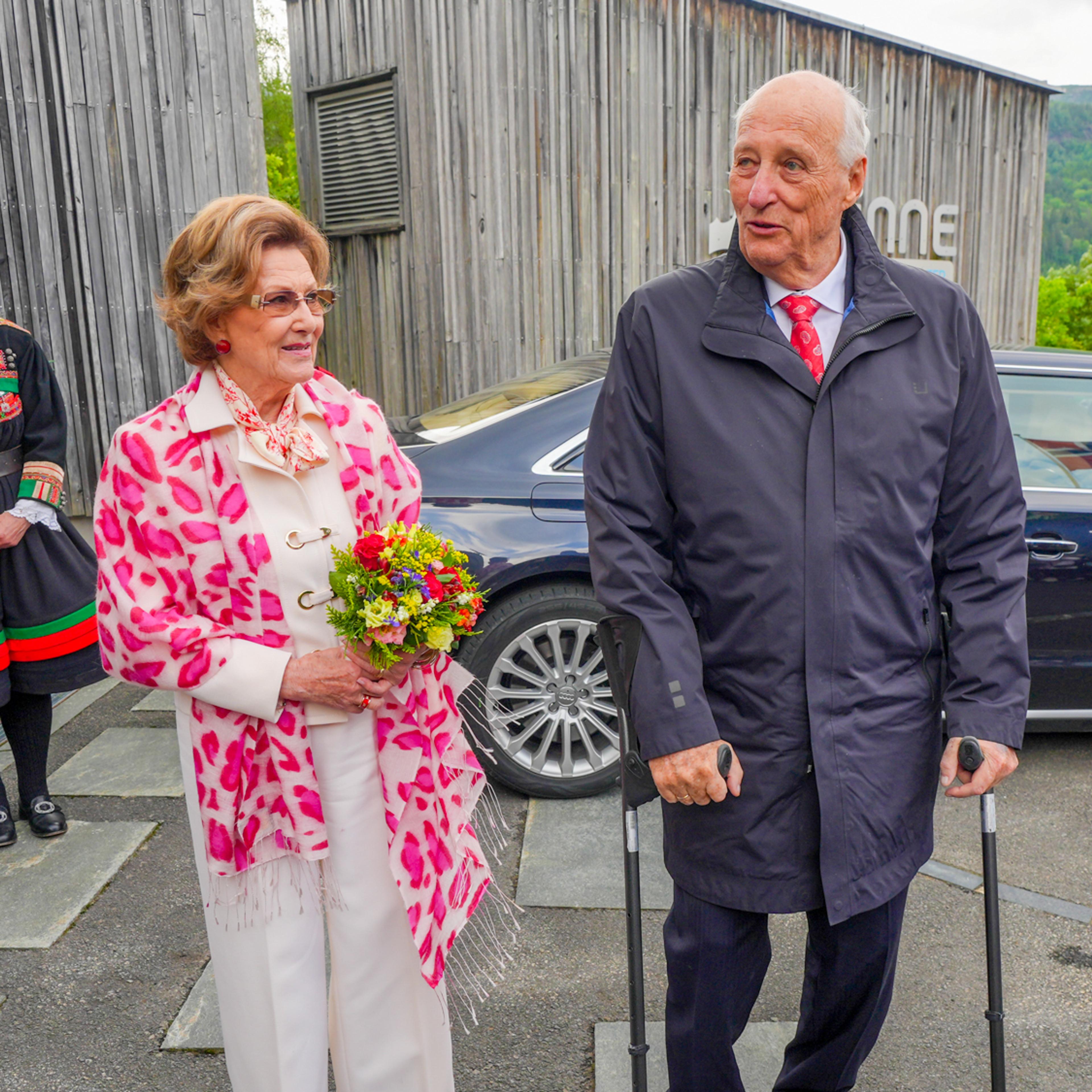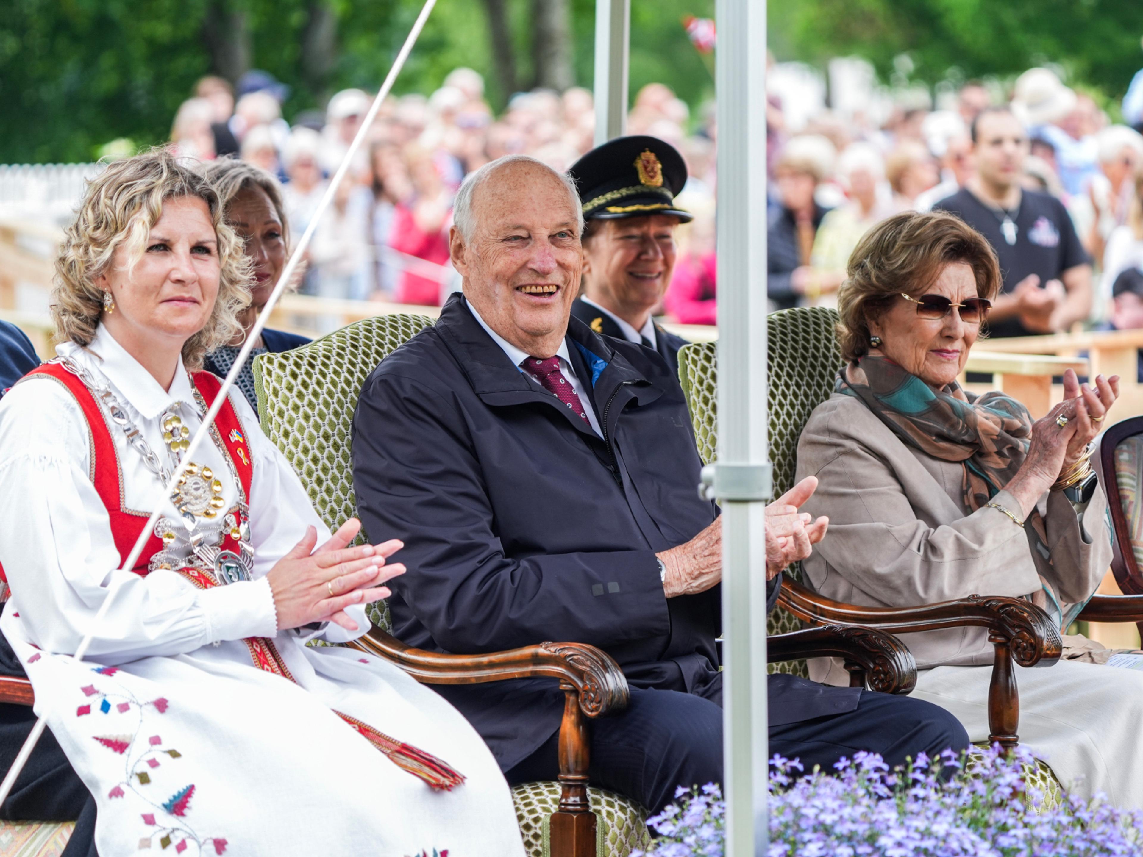 – Når vi er på fylkestur, er det alltid hyggeleg å treffe kjentfolk, innleidde Kong Harald talen med å seie – og sikta mellom anna til den eine av konferansierane, Marte Olsbu Røiseland, som er verdas mestvinnande kvinnelege skiskyttar – og frolending.