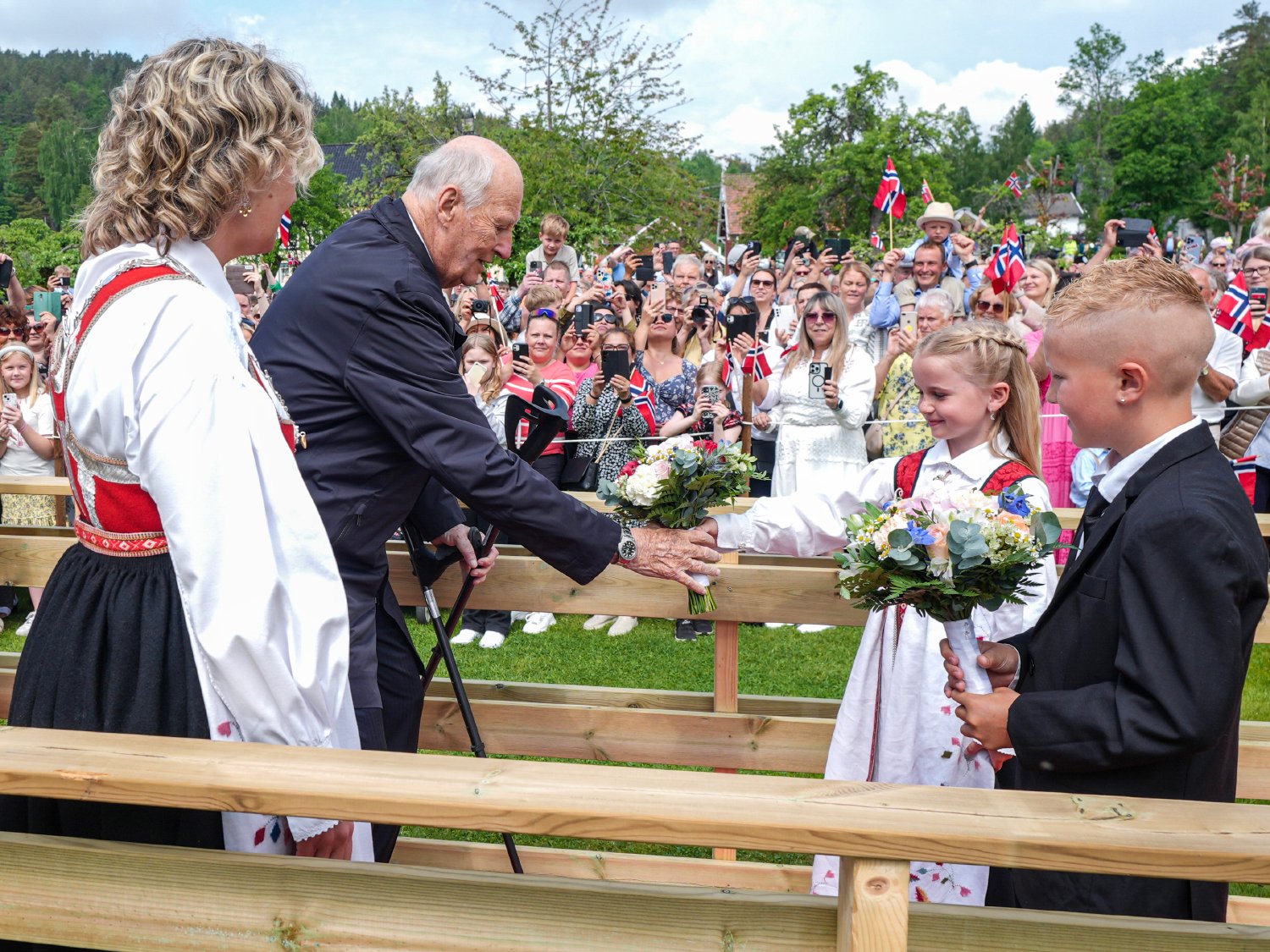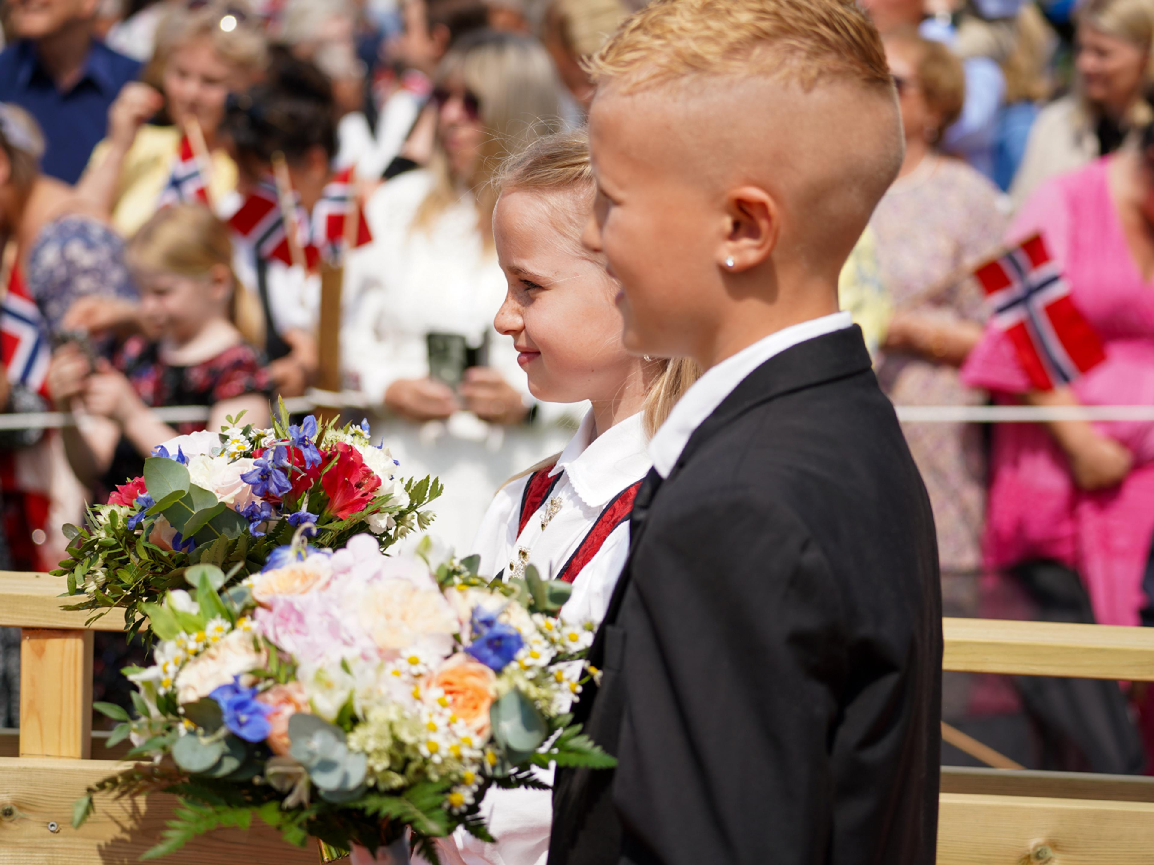 Froland var første stopp på fylkesturen. I hagen til flotte Frolands verk venta niåringane Ella Tveit og Mikkel Råna med blomstrar til Kongeparet. Froland skulekorps spelte og langt over 1000 av innbyggjarane i kommunen hadde møtt fram. Det var mange norske flagg, bunader, dresser og fine kjolar å sjå.