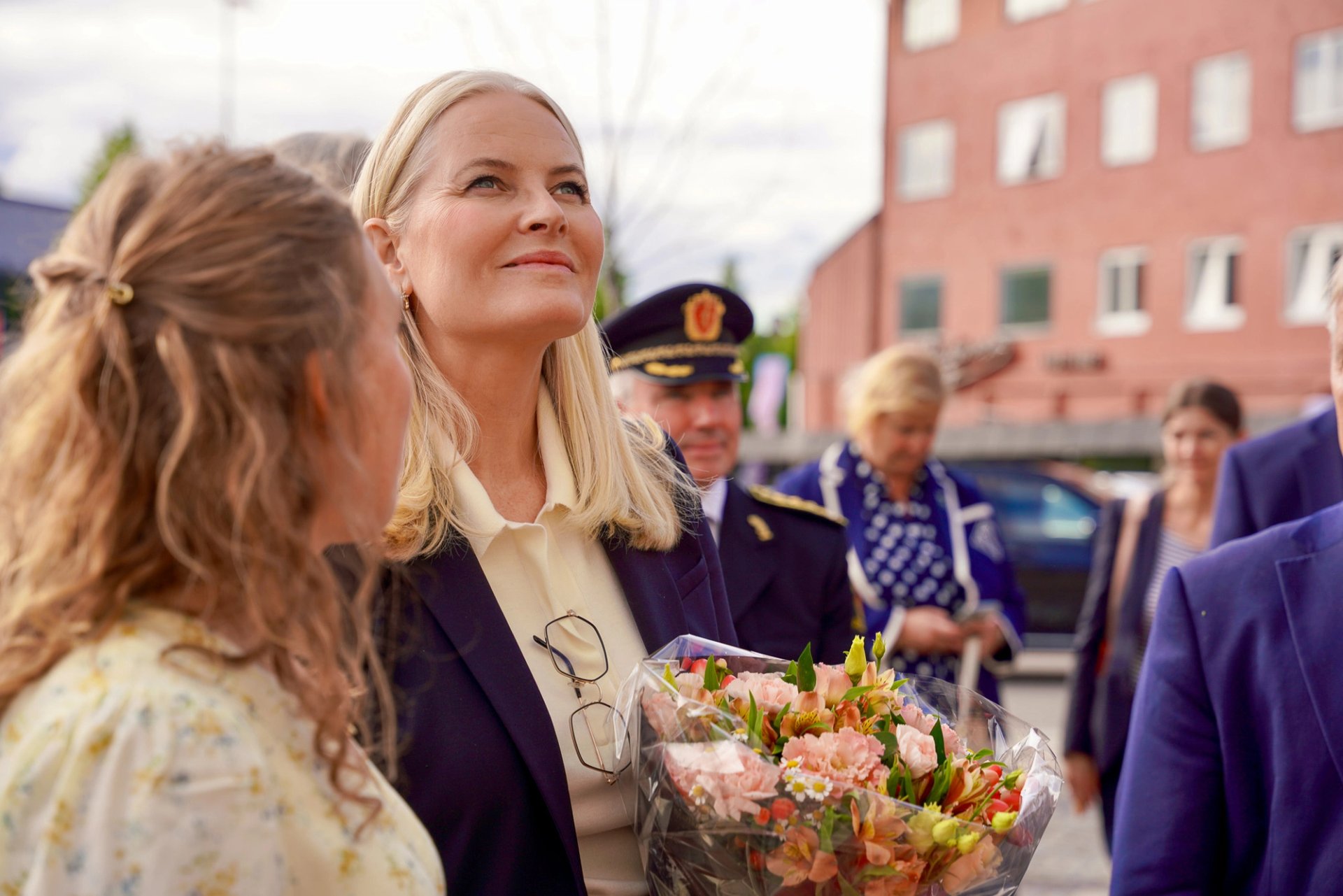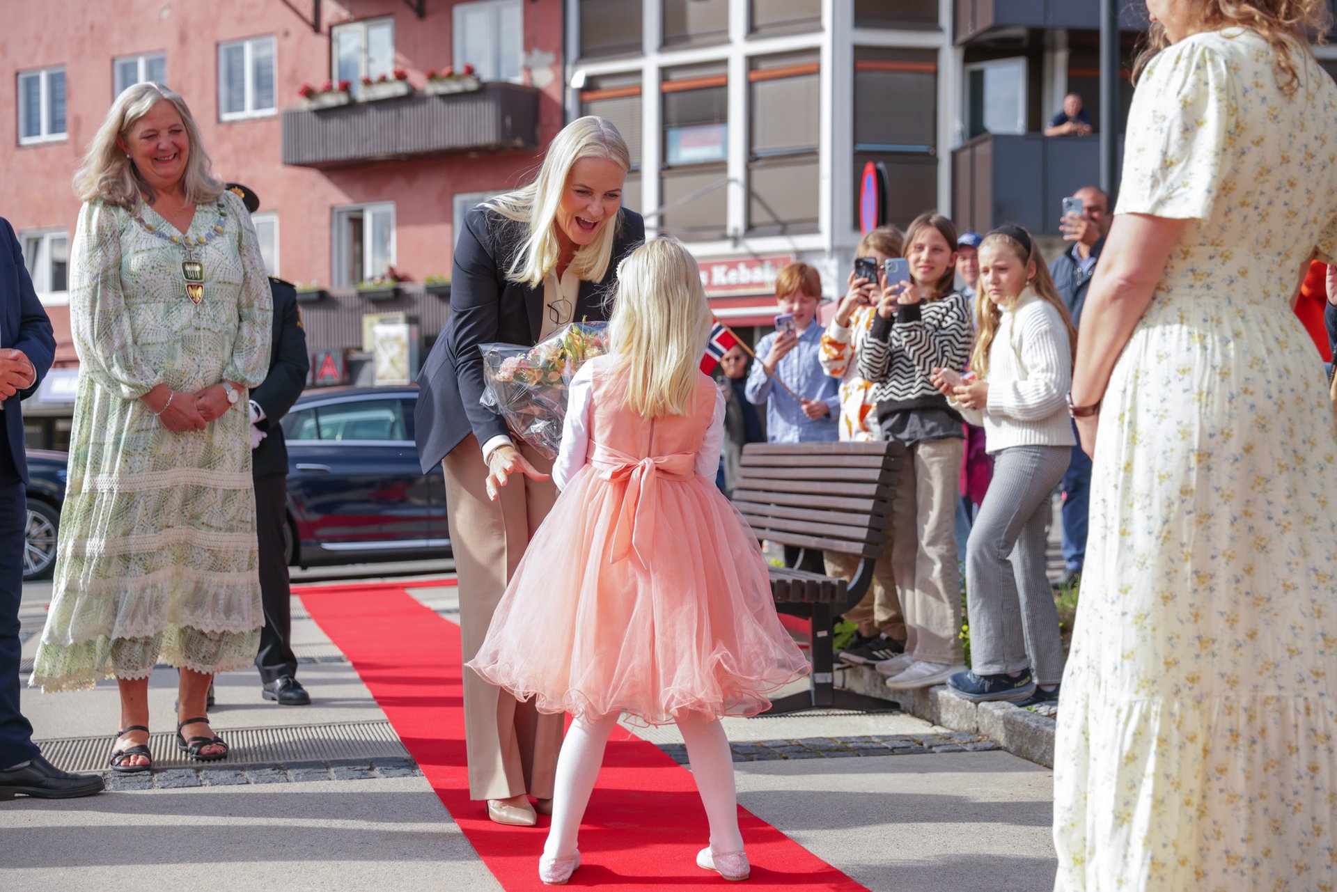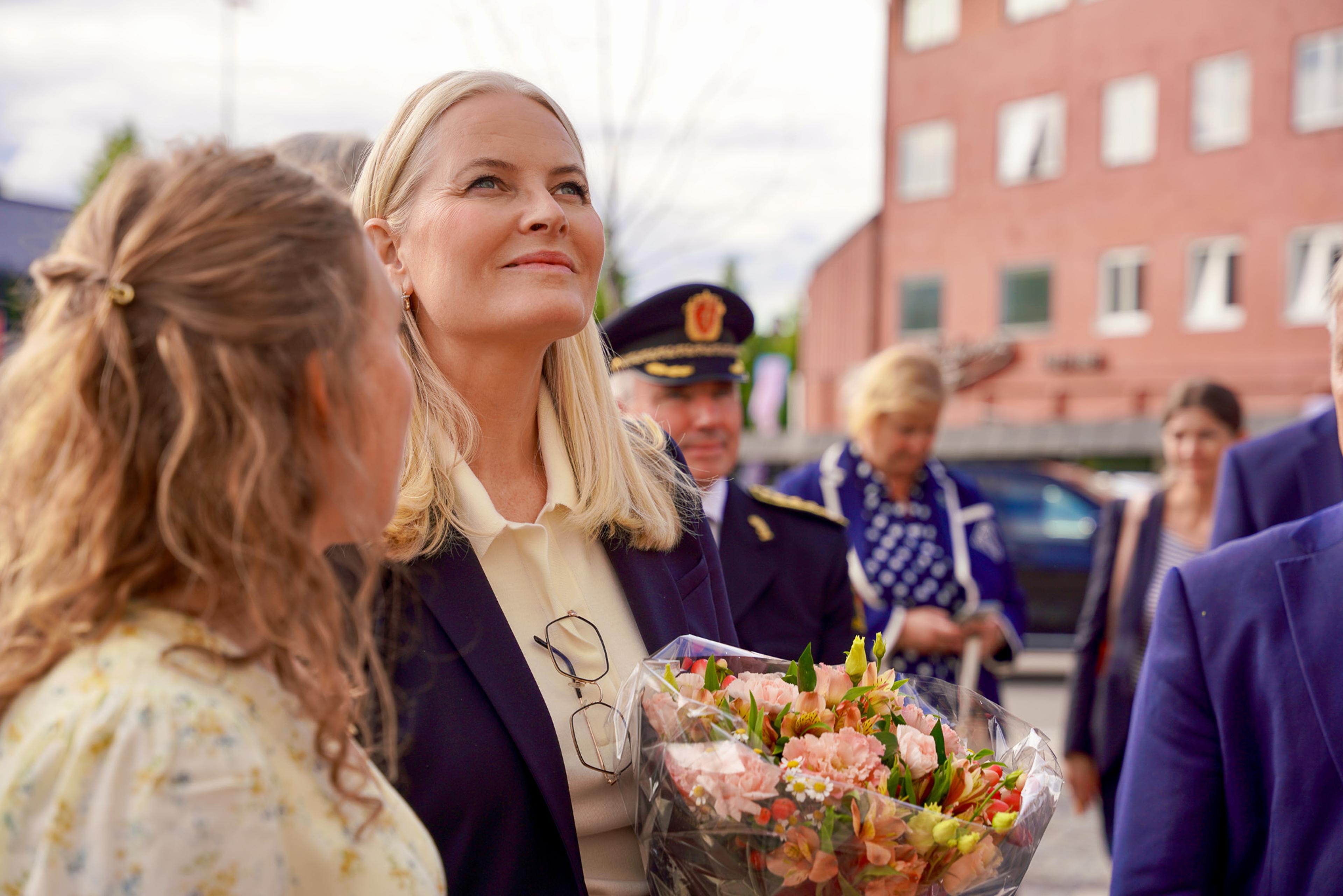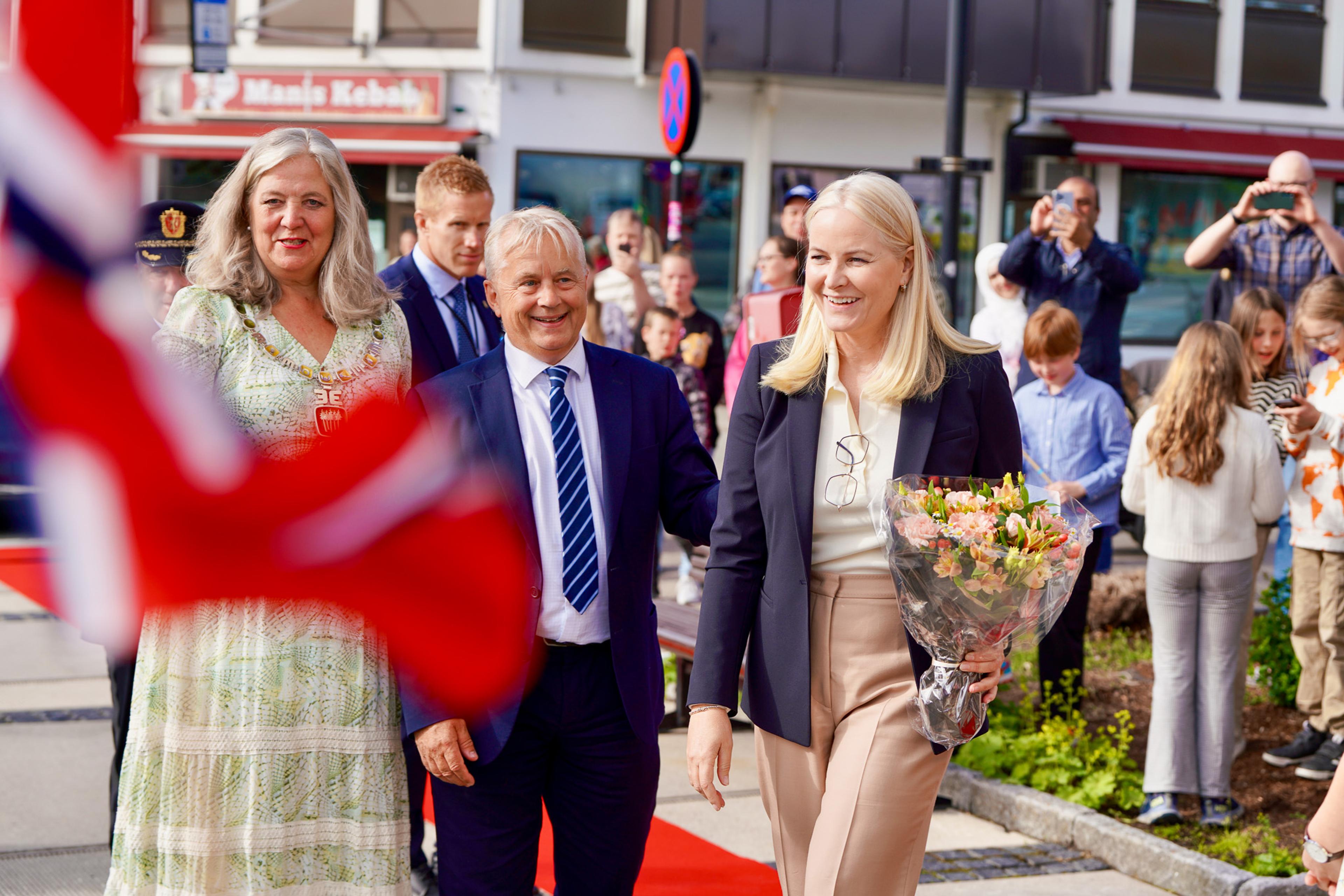På togets første stoppested ble Kronprinsessen møtt av statsforvalter Knut Storberget, ordfører Lillian Skjærvik og fungerende politimester Tom Johnsen.