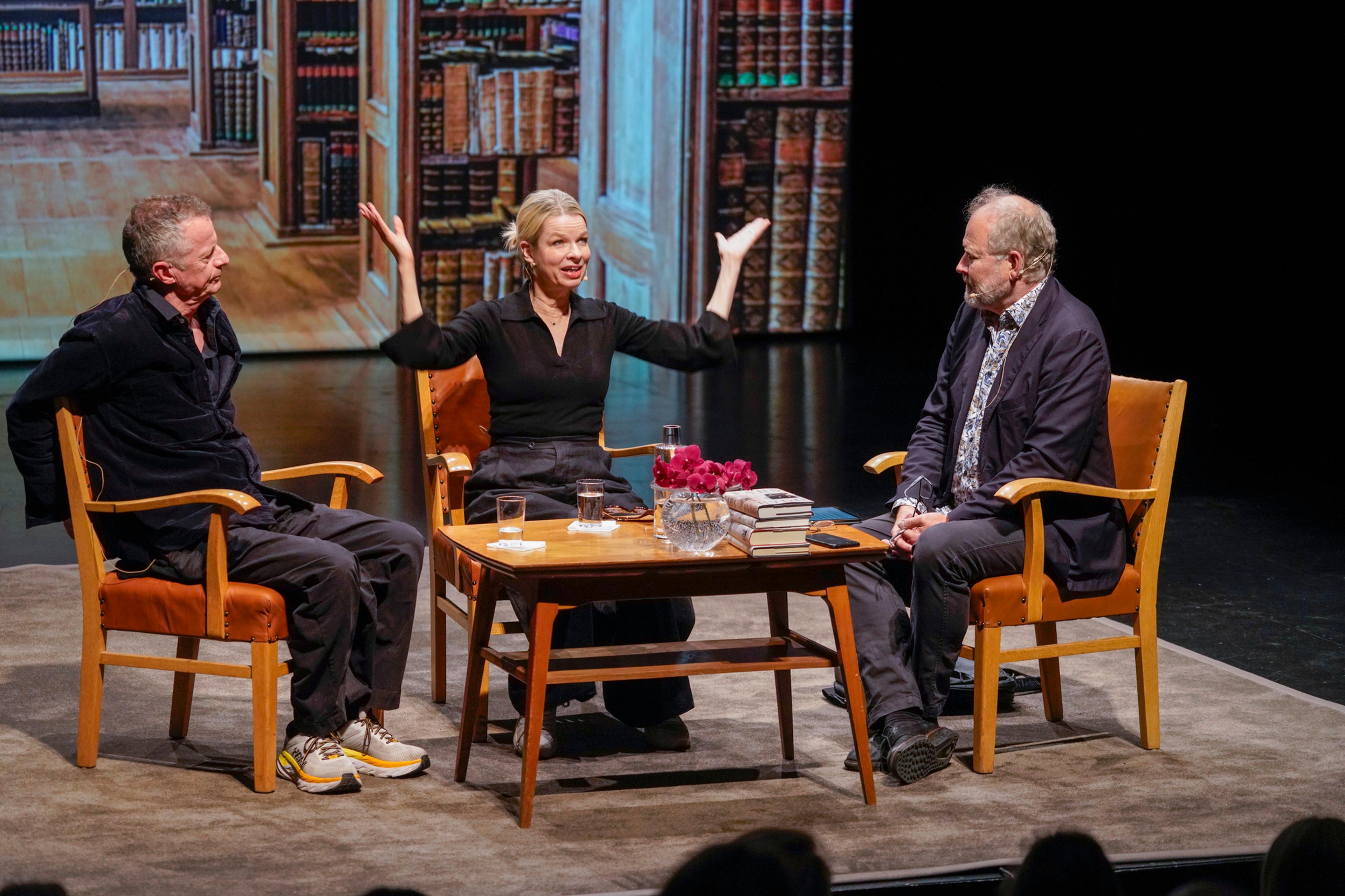 Deretter gikk turen til Elverum kulturhus og Litteraturtogets første litteraturarrangement. På scenen deltok det etablerte norske forfatterparet Linn Ullmann og Niels Fredrik Dahl i samtale med biografen Alf van der Hagen.