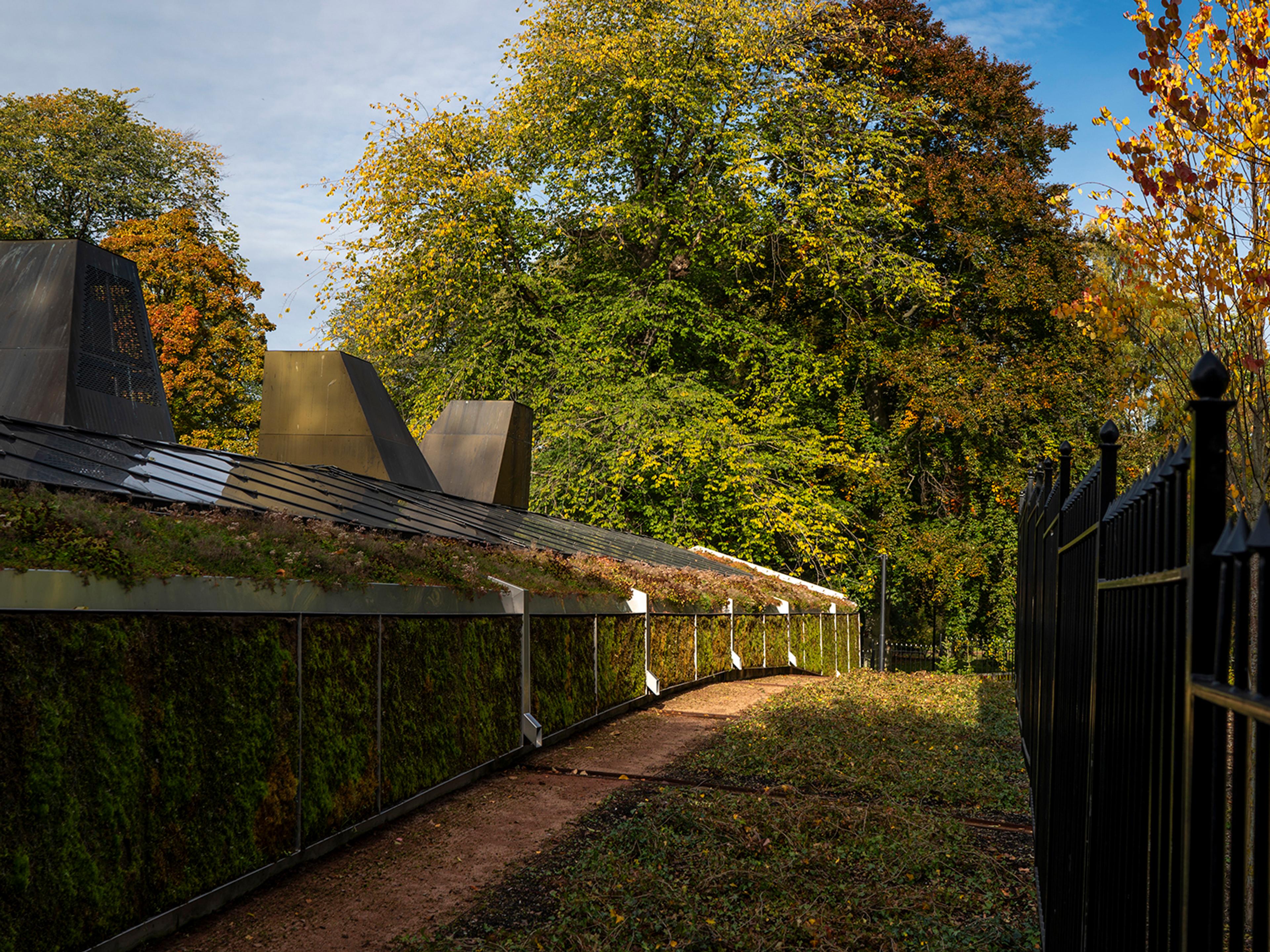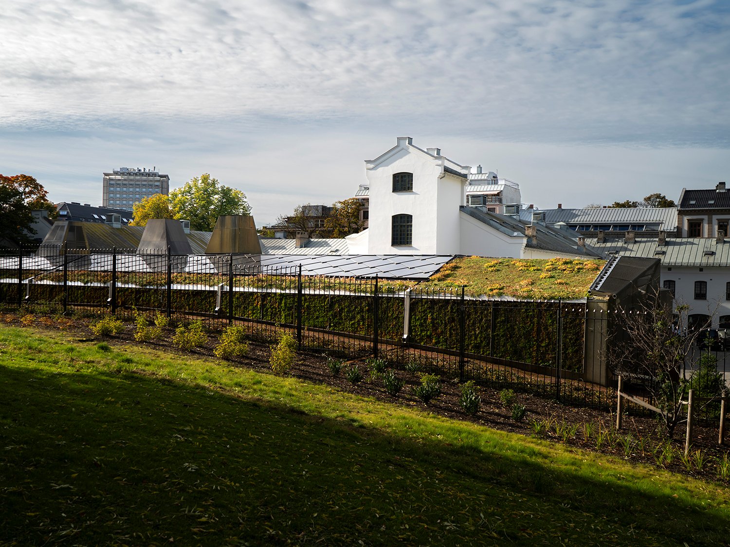 - Solcellepanel på deler av taket genererer energi til bygget.