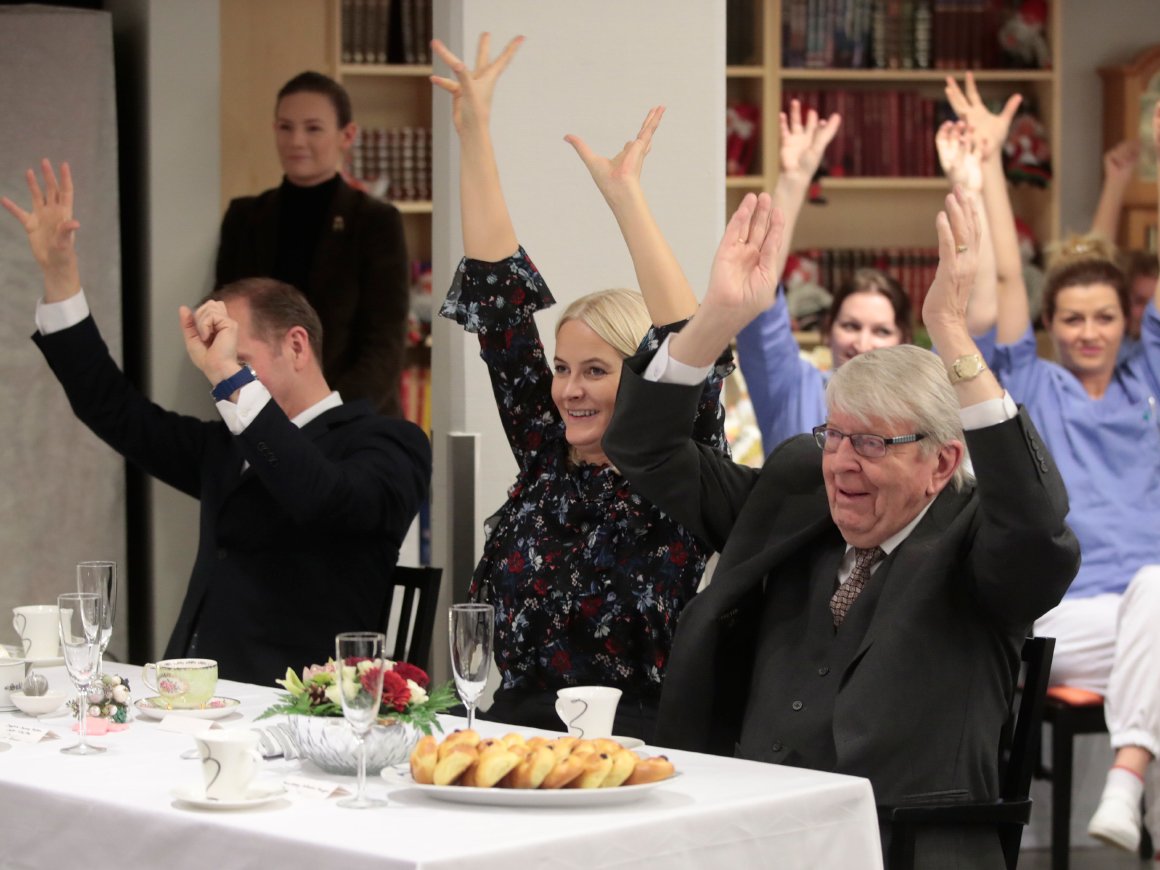 Sykehjemmet er et såkalt syngende sykehjem og Kronprinsparet fikk også være med på dagens korøvelse.