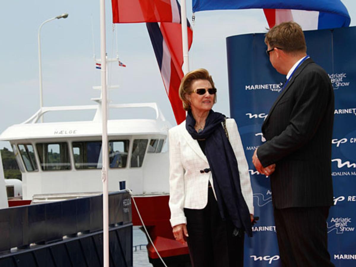 Fra iNAVIS reiste Kongeparet til Prgin nautiske senter, der Dronning Sonja døpte de norske båtene ”Hedda” og ”Hælge”.