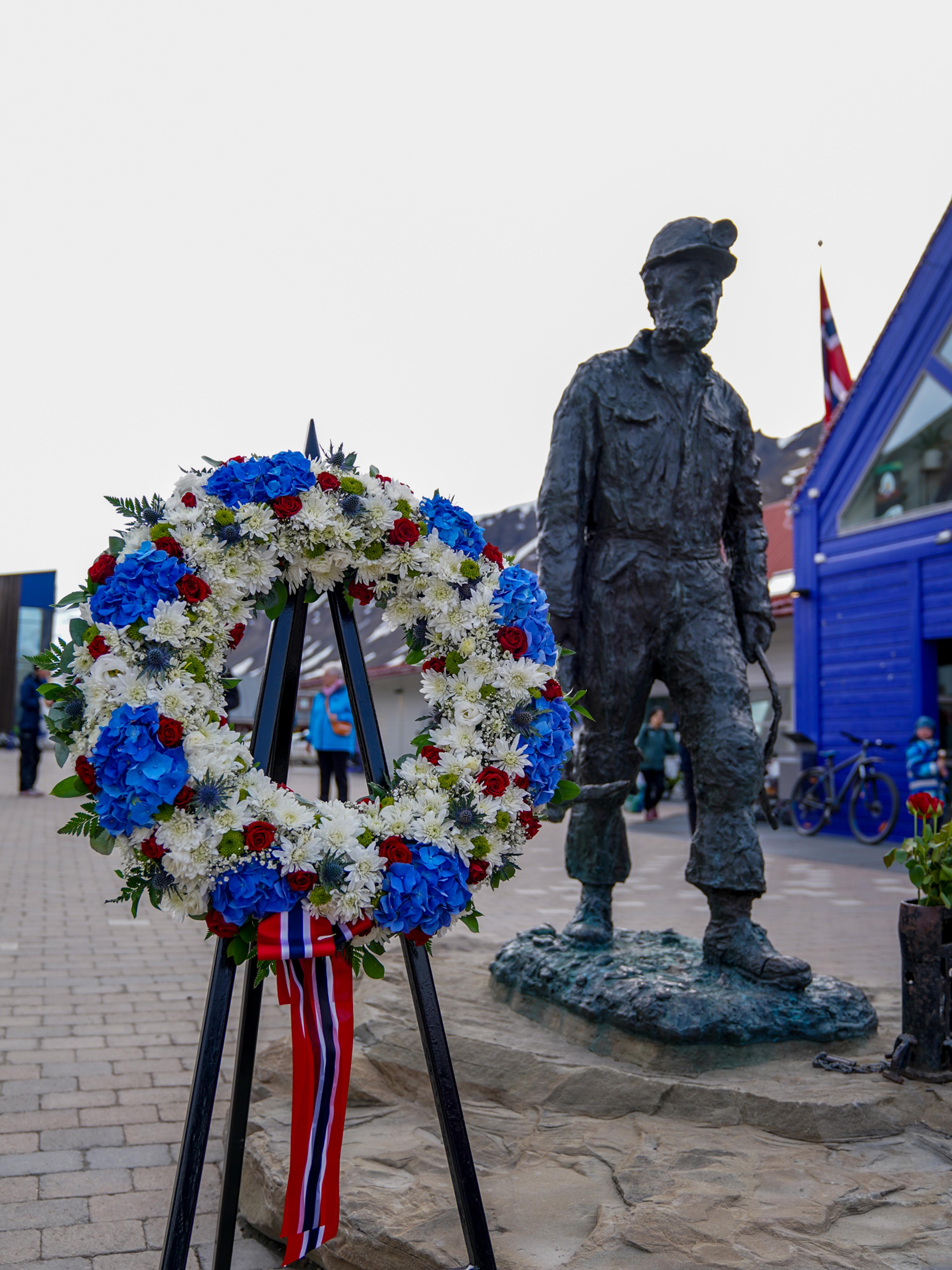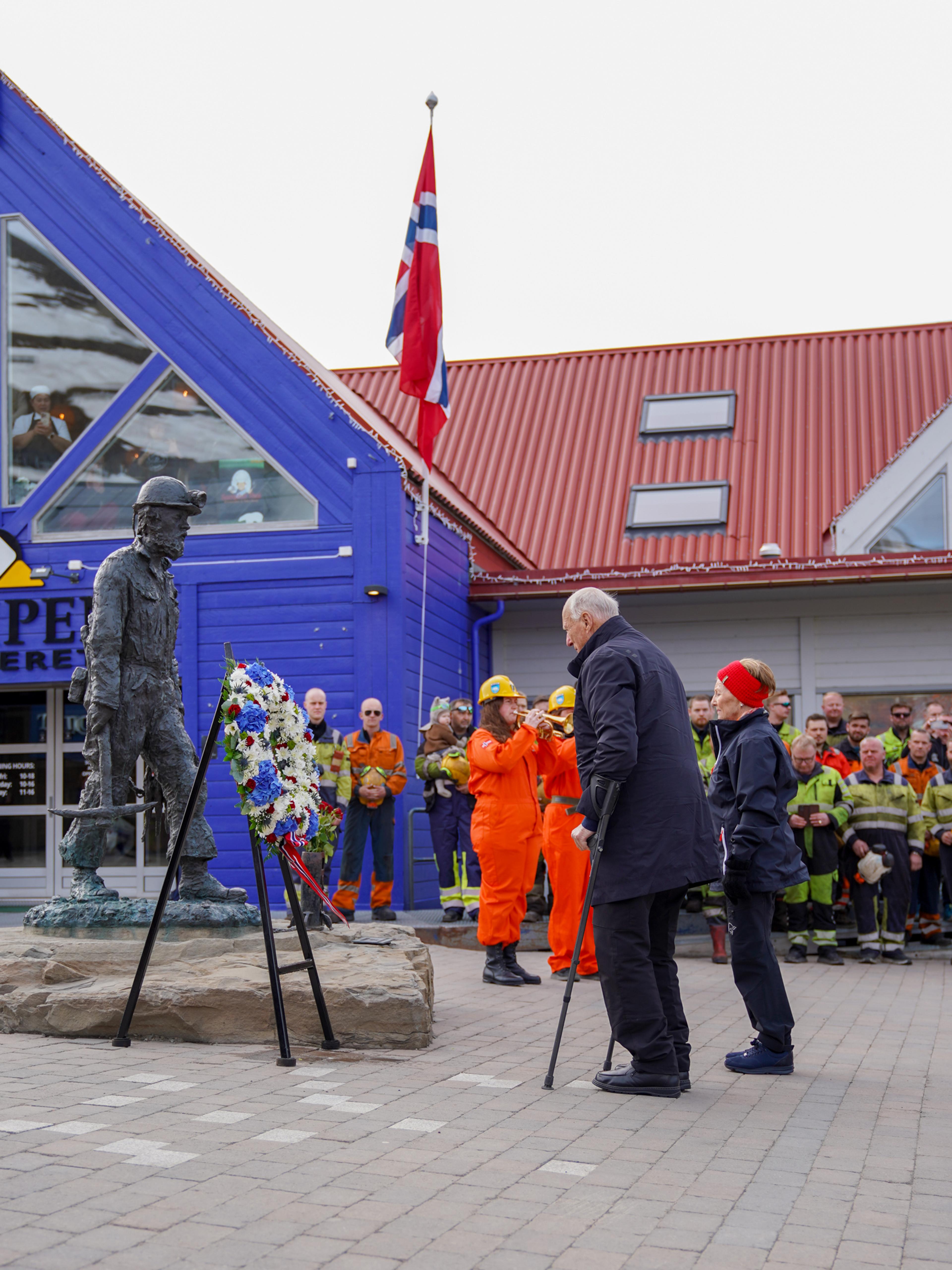 Etter besøket reiste Kongeparet videre til torget i Longyearbyen der det var kransenedleggelse ved statuen av Gruvebusen – til minne om de 124 omkomne i gruvedrift for Store Norske fra 1916 – og etterfulgt av ett minutts stillhet med trompetfanfare.