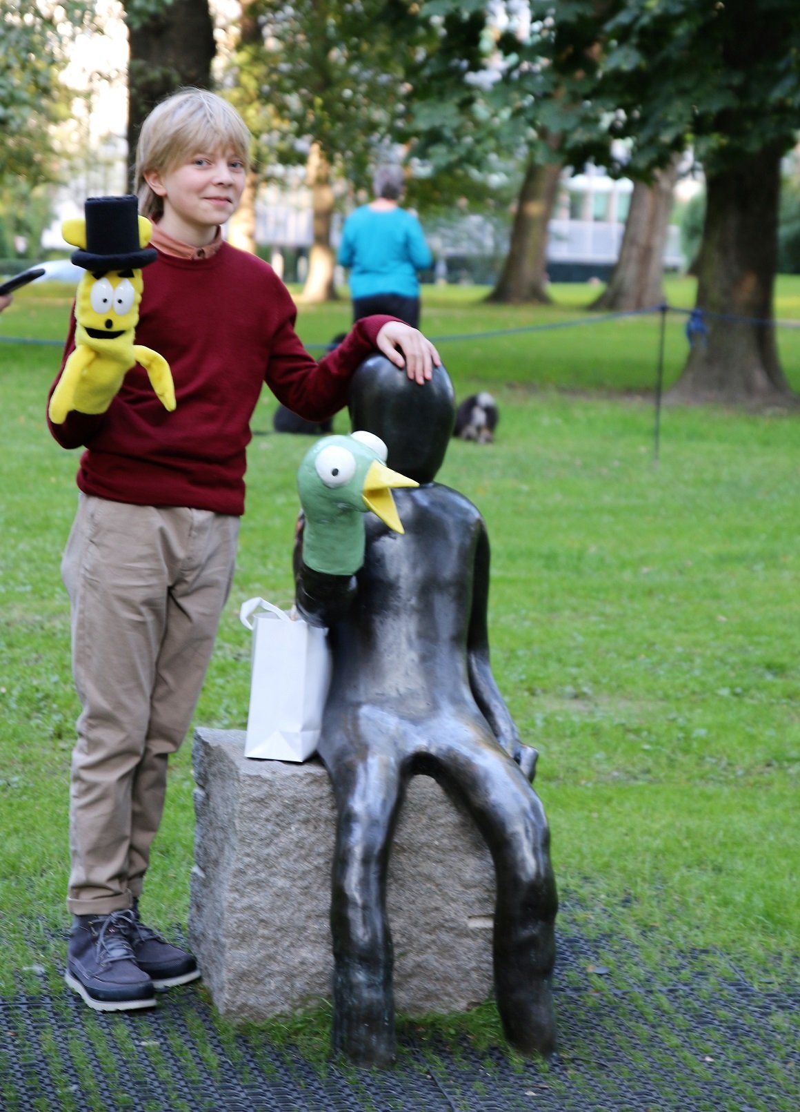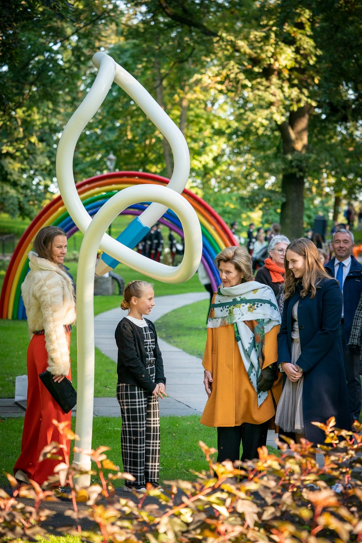- De er her for dere, de er til å ta på, og ikke bare til pynt, sa Hans Majestet Kongen om skulpturene da han åpnet skulpturparken sammen med Prinsesse Ingrid Alexandra. Tusen barnehagebarn var invitert på boller og saft i Slottsparken i anledning åpningen.