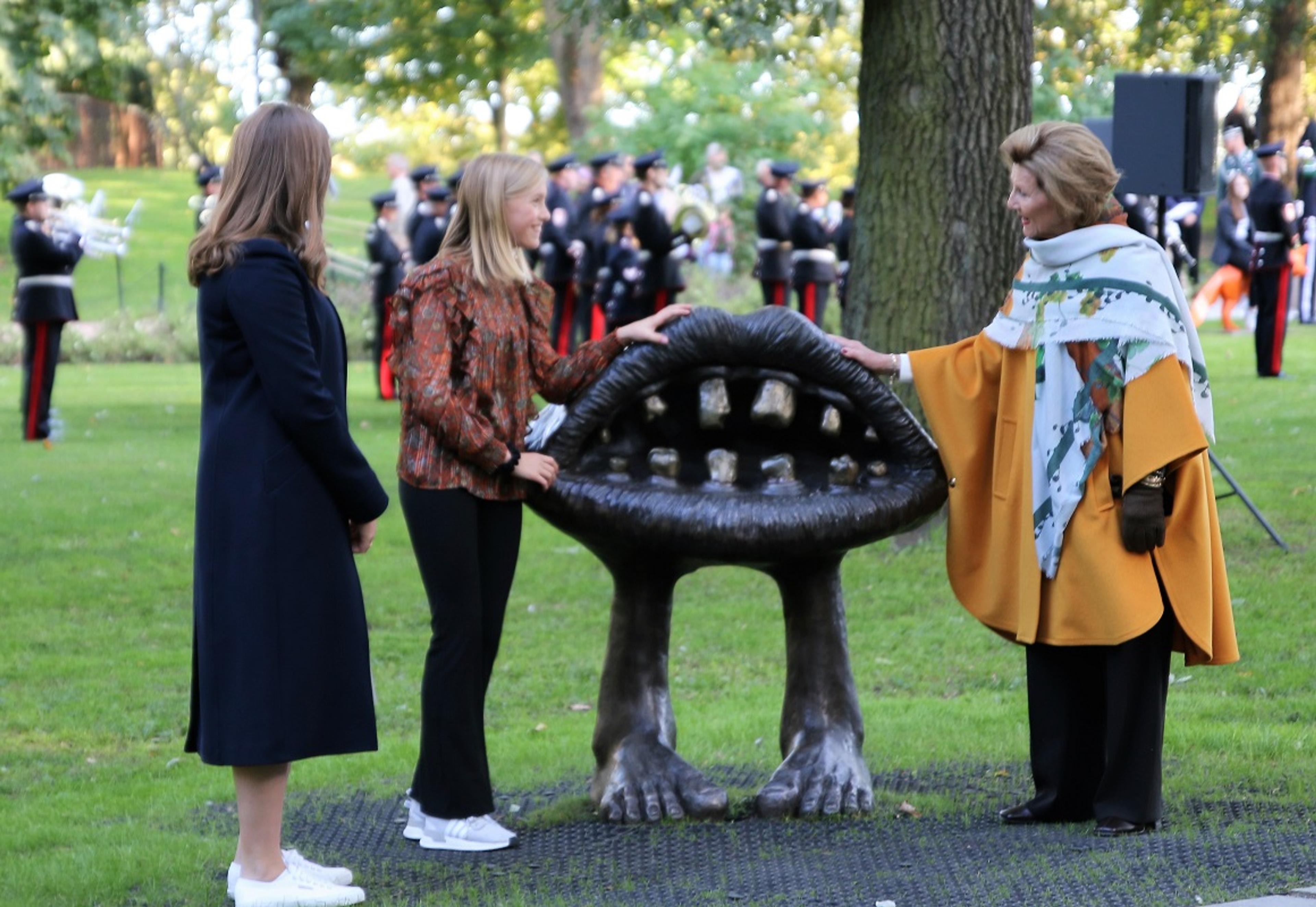 Dronningen og Prinsesse Ingrid Alexandra fikk også se nærmere på de siste og nyeste tilskuddene til parken. "Tallblyant på rømmen" av Lise M Kvernvold, "Rar benk" av August Kristoffer Mortensen Vassdal og "Munnben" av Eva Torgersen har alle kommet på plass i løpet av sommeren. Formgiverne kunne stolt vise frem og fortelle om skulpturene.