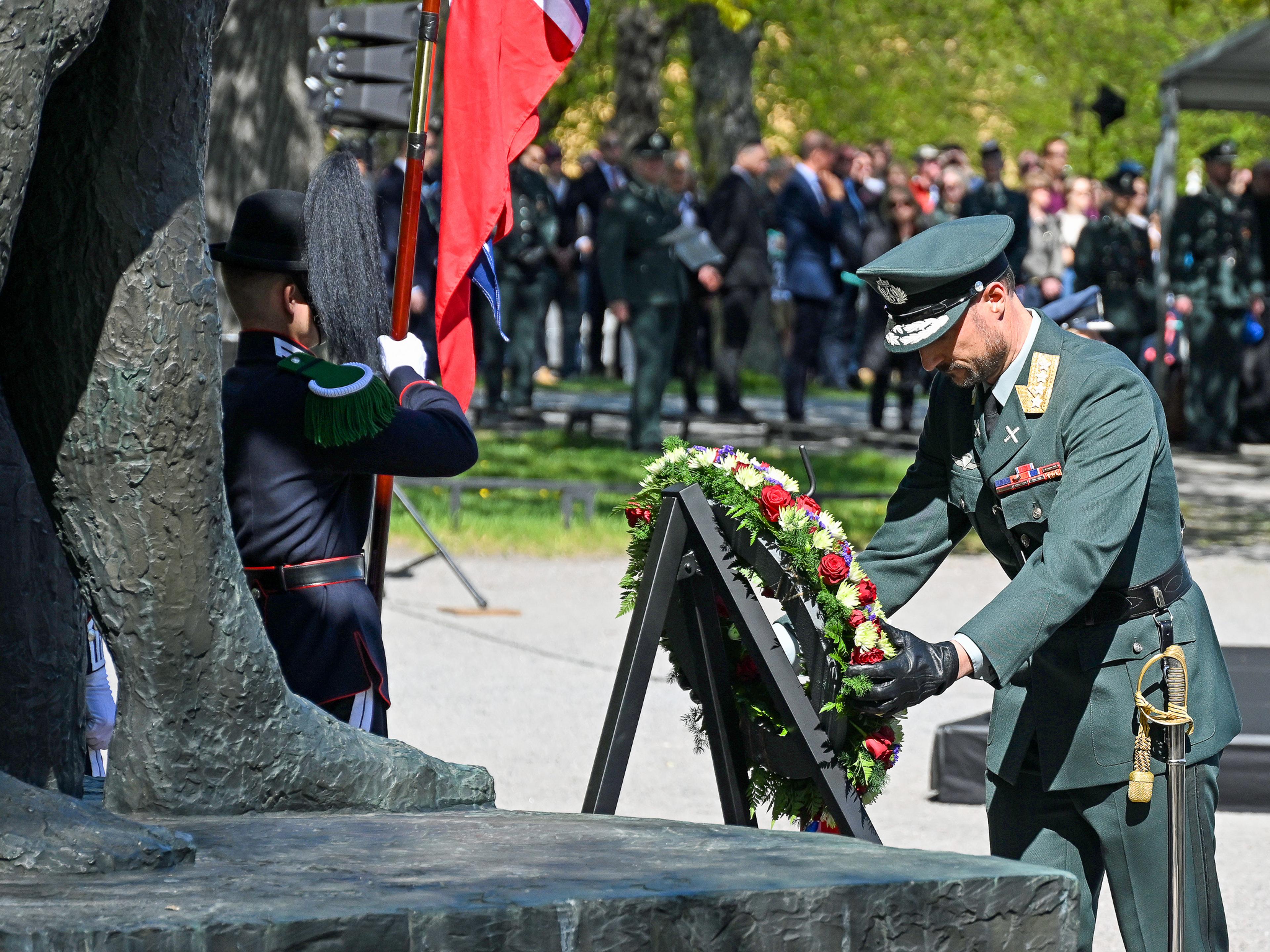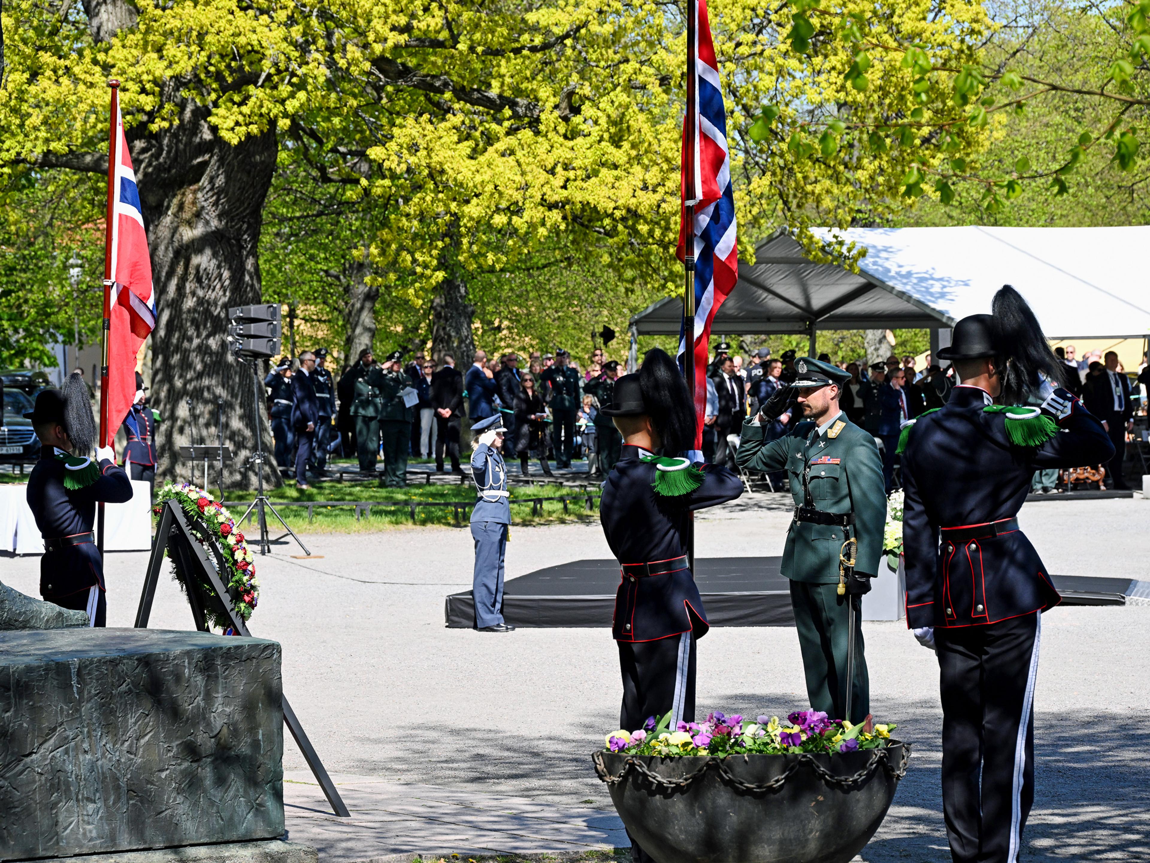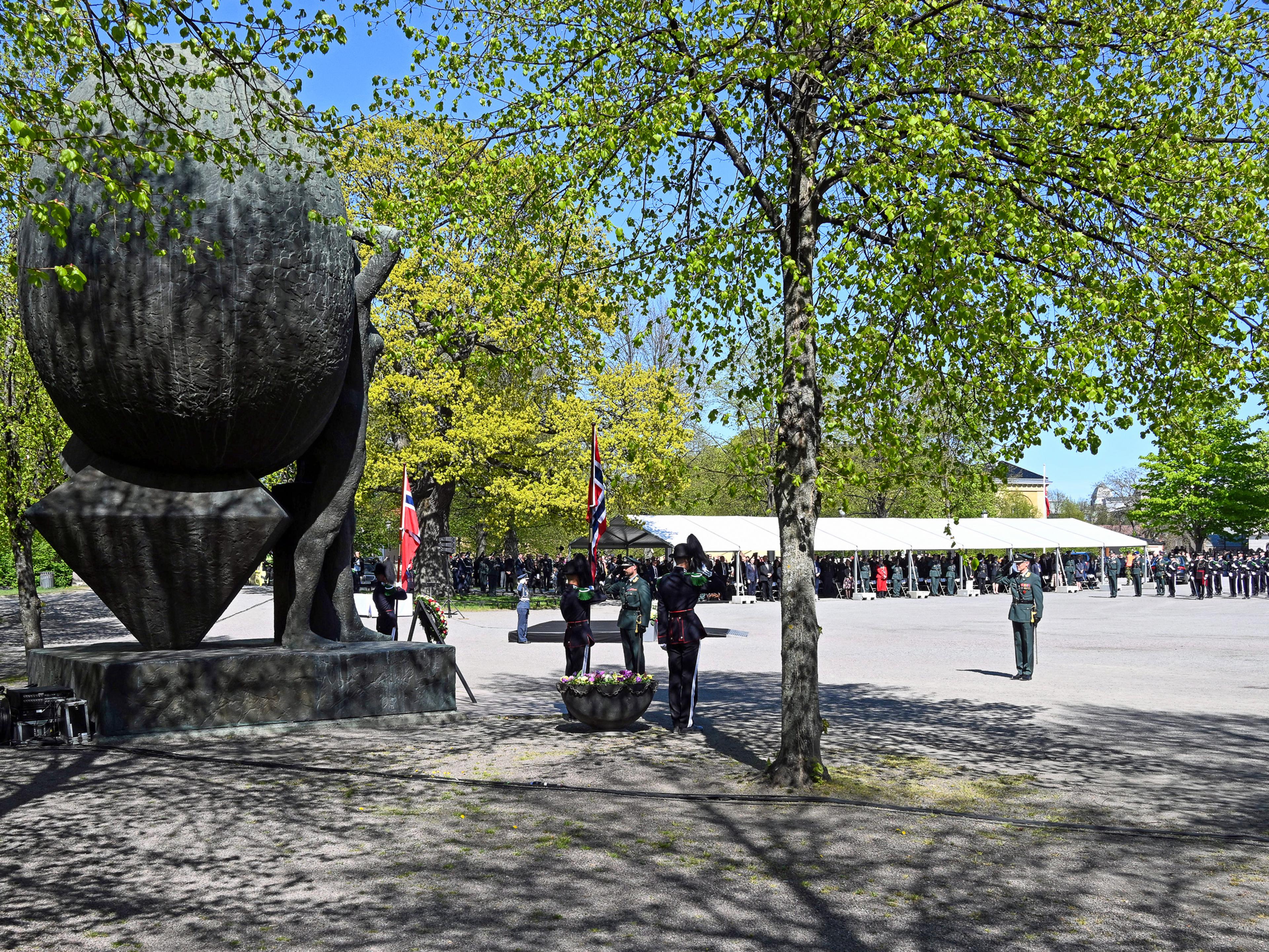 Dei frammøte song første vers av «Ja, vi elsker», og Kronprins Haakon la ned krans ved monumentet for offera for krigen 1940–45, ofte berre omtalt som Nasjonalmonumentet.