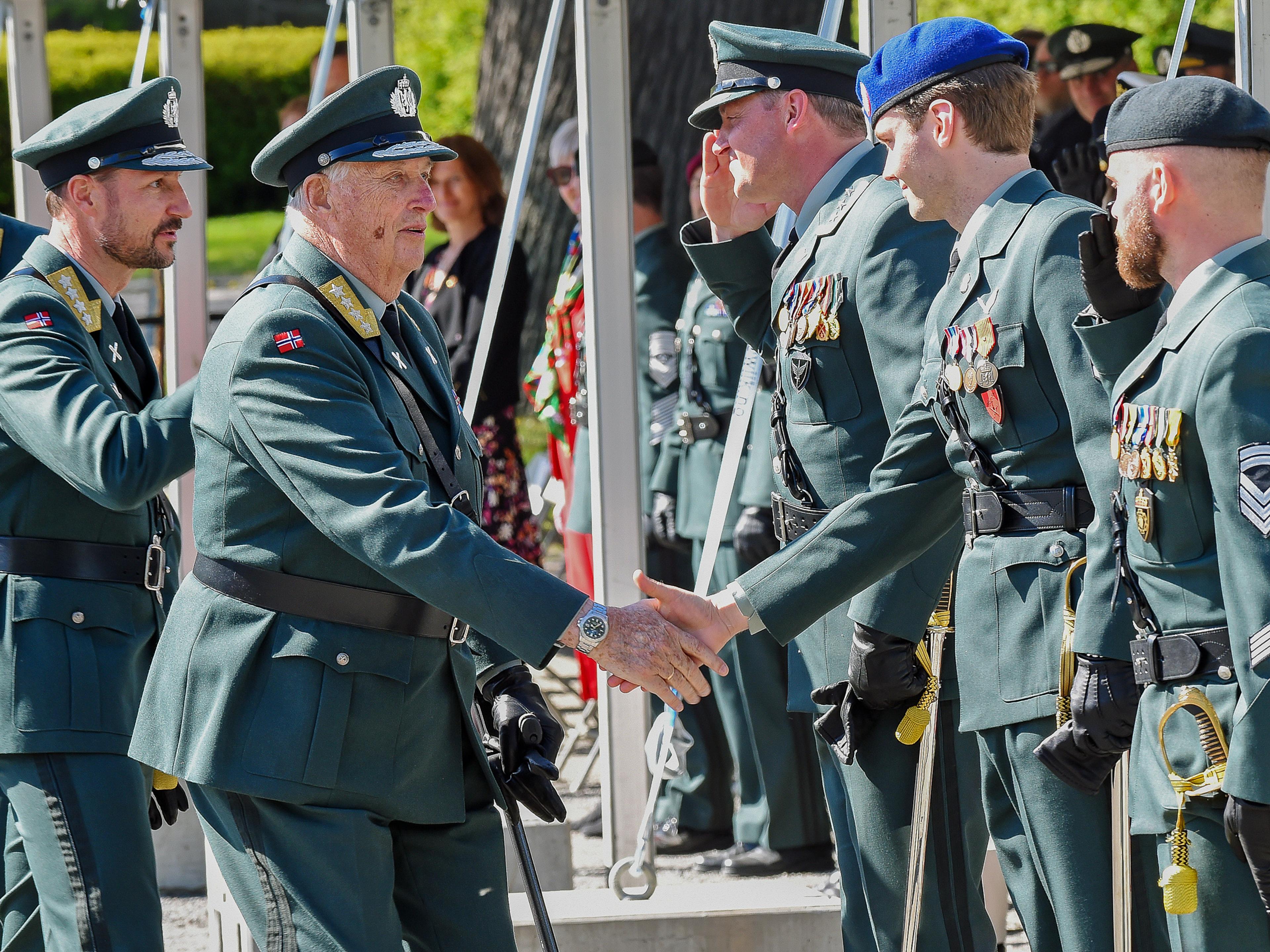 Hans Majestet Kongen gratulerte i ettermiddag tre soldatar som vart dekorerte med Forsvarets innsatsmedalje. Den Høgvørde Kronprinsen deltok òg på markeringa av Noregs frigjeringsdag og nasjonale veterandag på Akershus festning.
