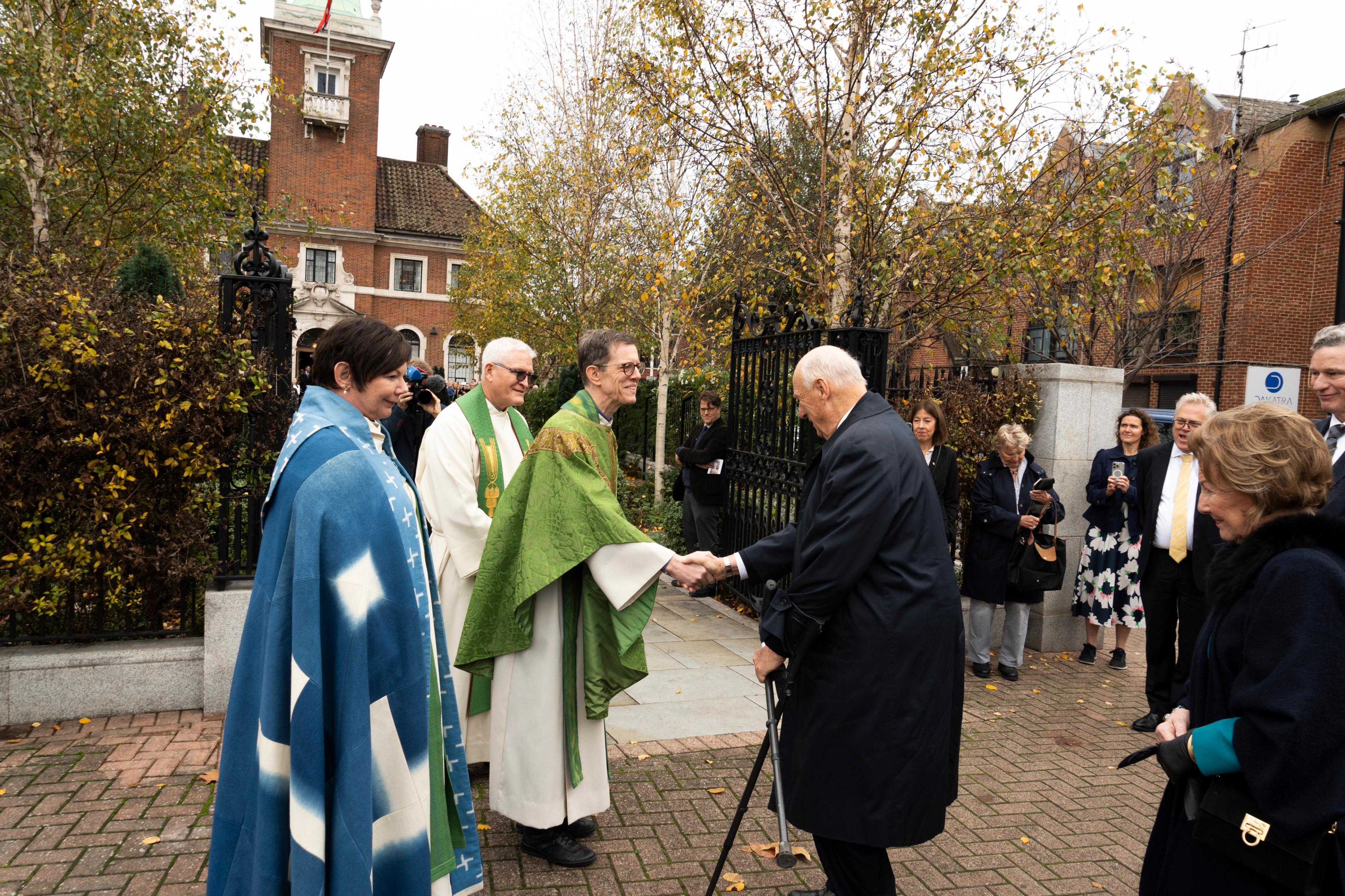 Deres Majesteter Kongen og Dronningen var til stede under en markering av frigjøringsjubileet i Sjømannskirken i London.