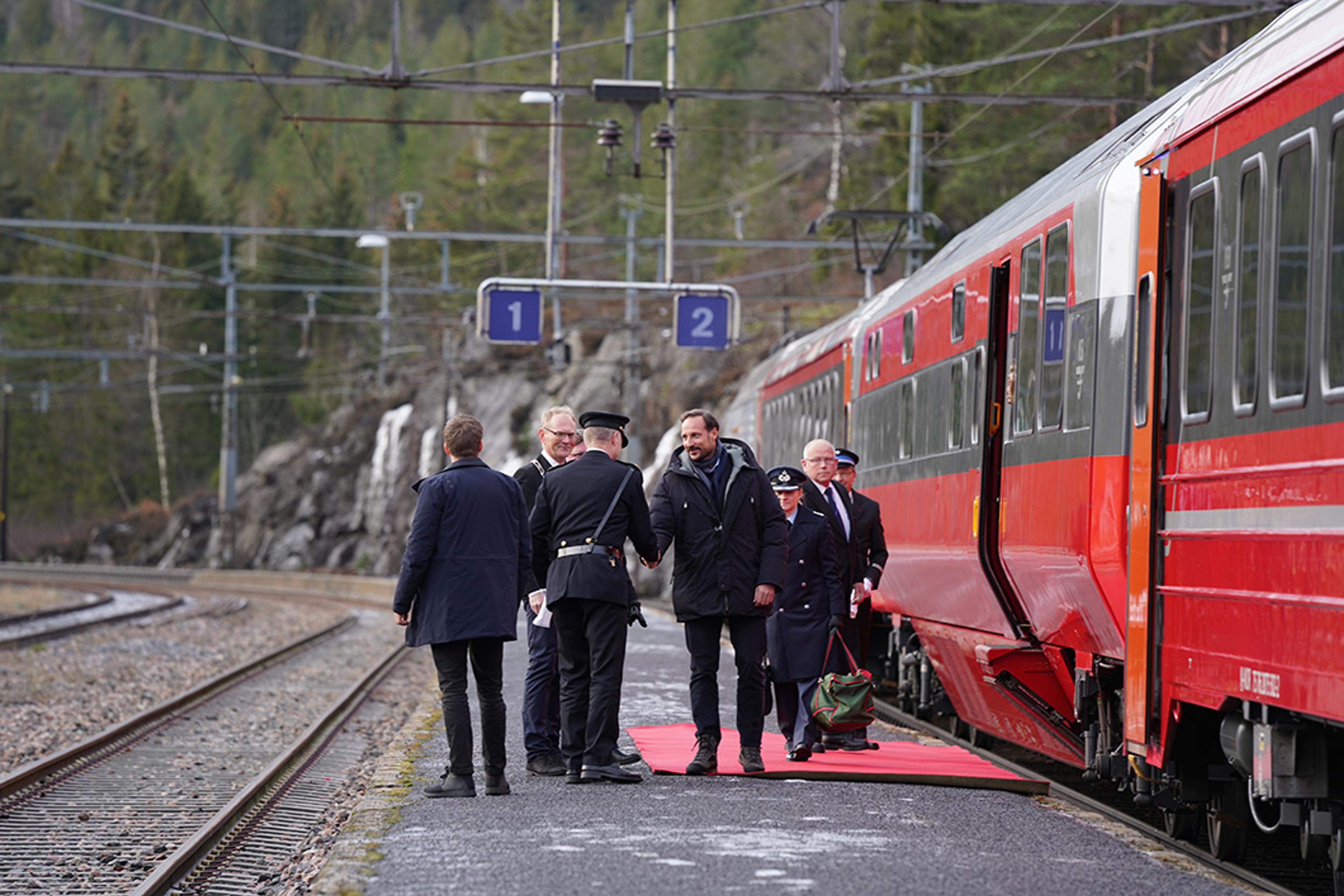 Kronprinsen kom til Vegårshei med tog og vart ønskt velkommen av fylkesmannen i Agder, Stein A. Ytterdal, og ordførar i Vegårshei kommune Kjetil Torp.