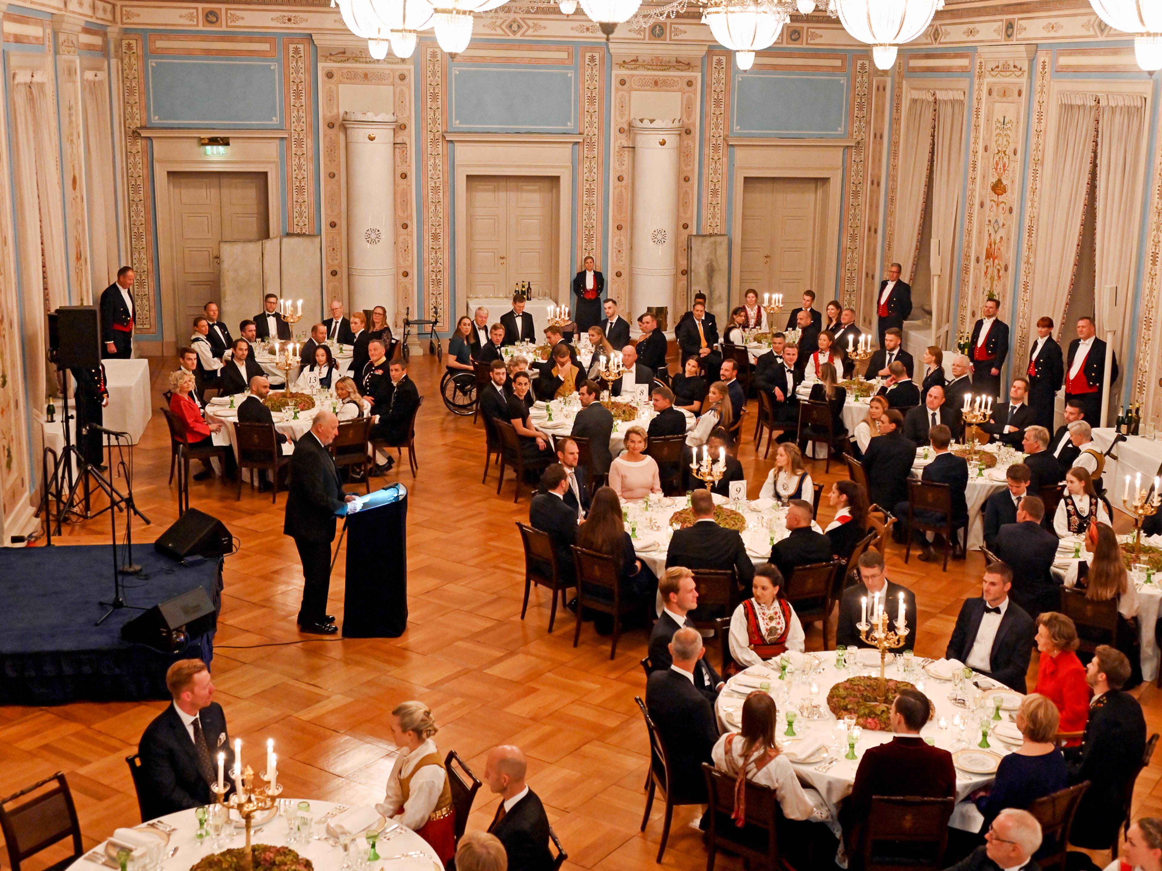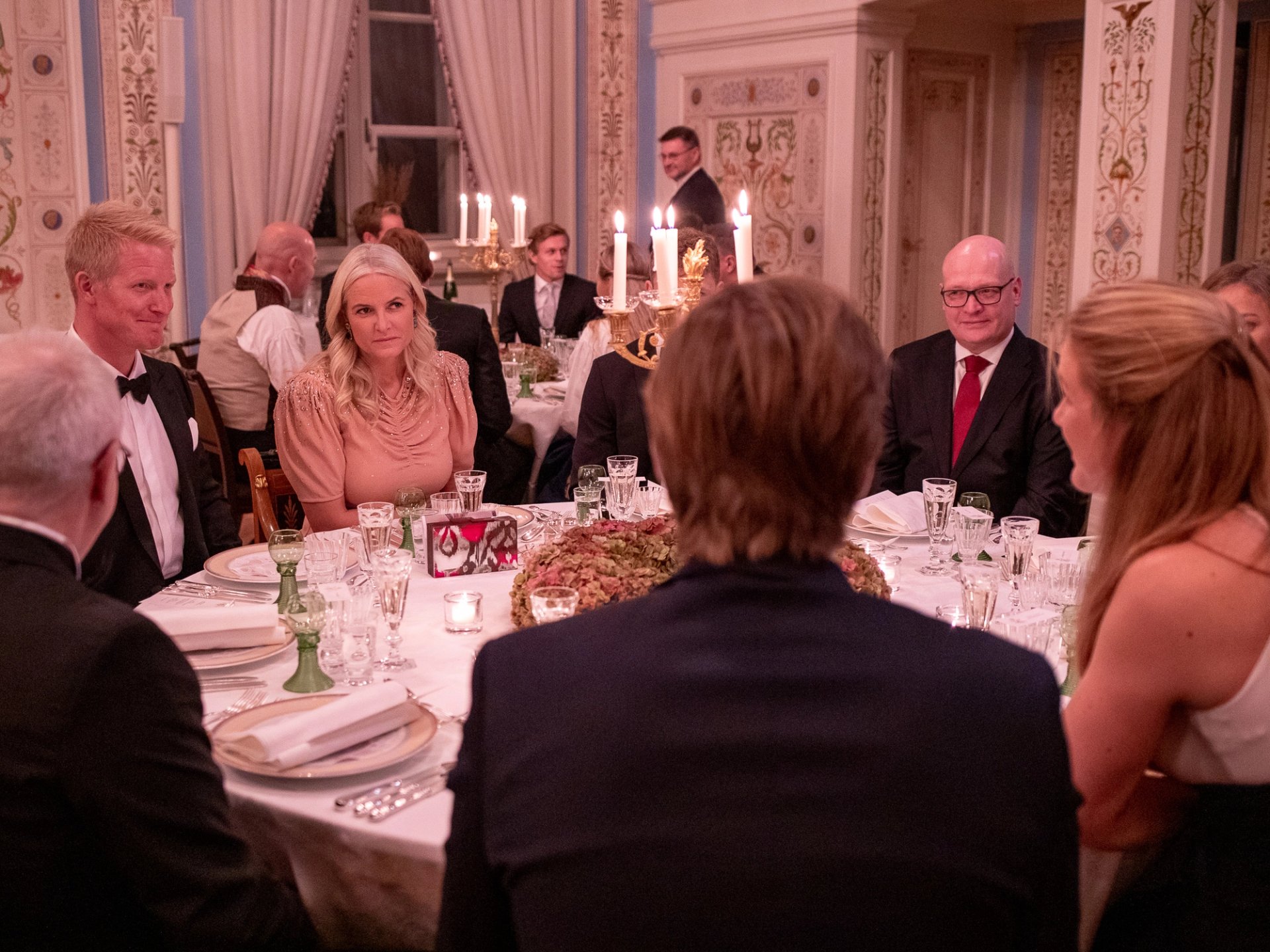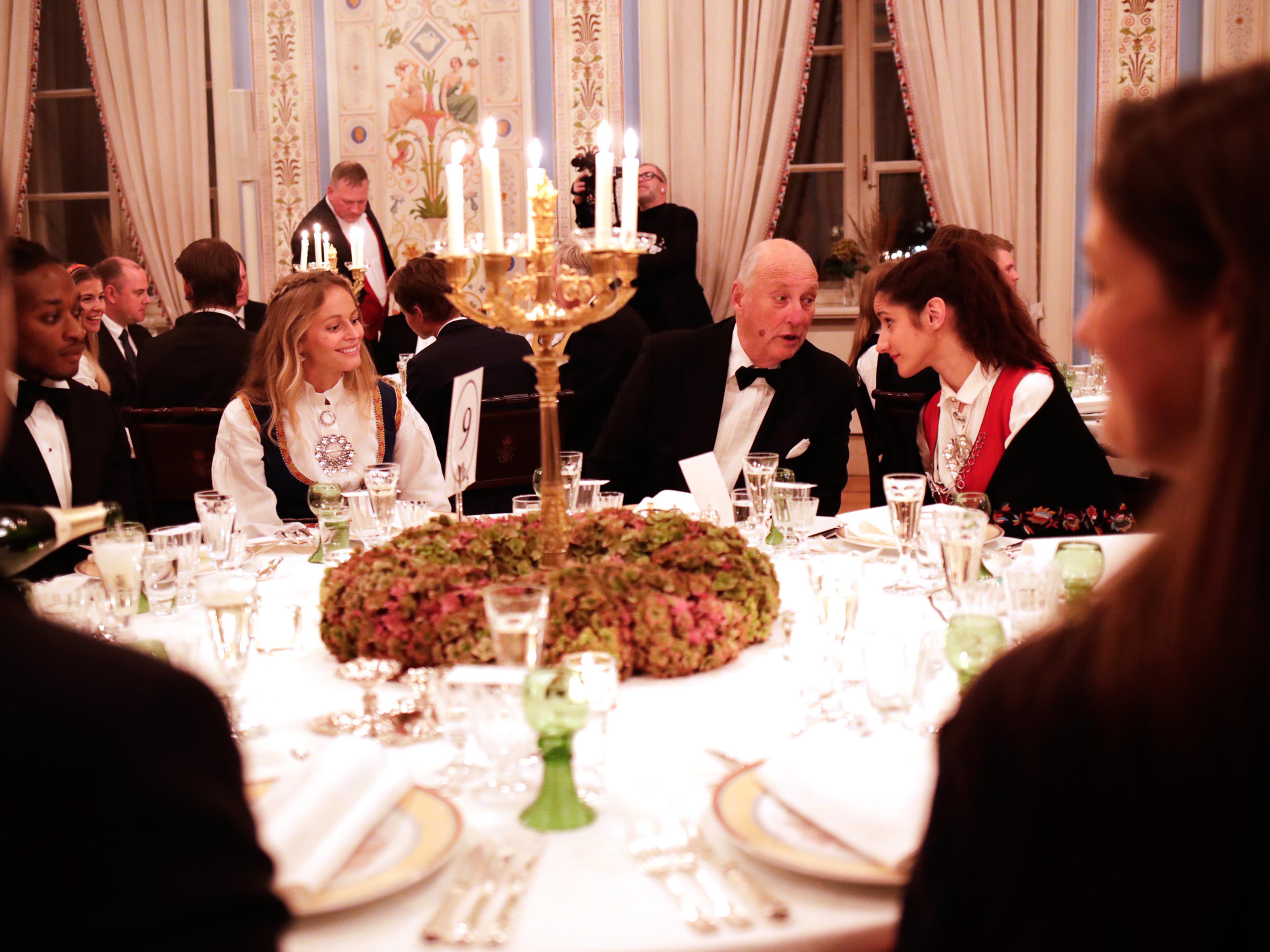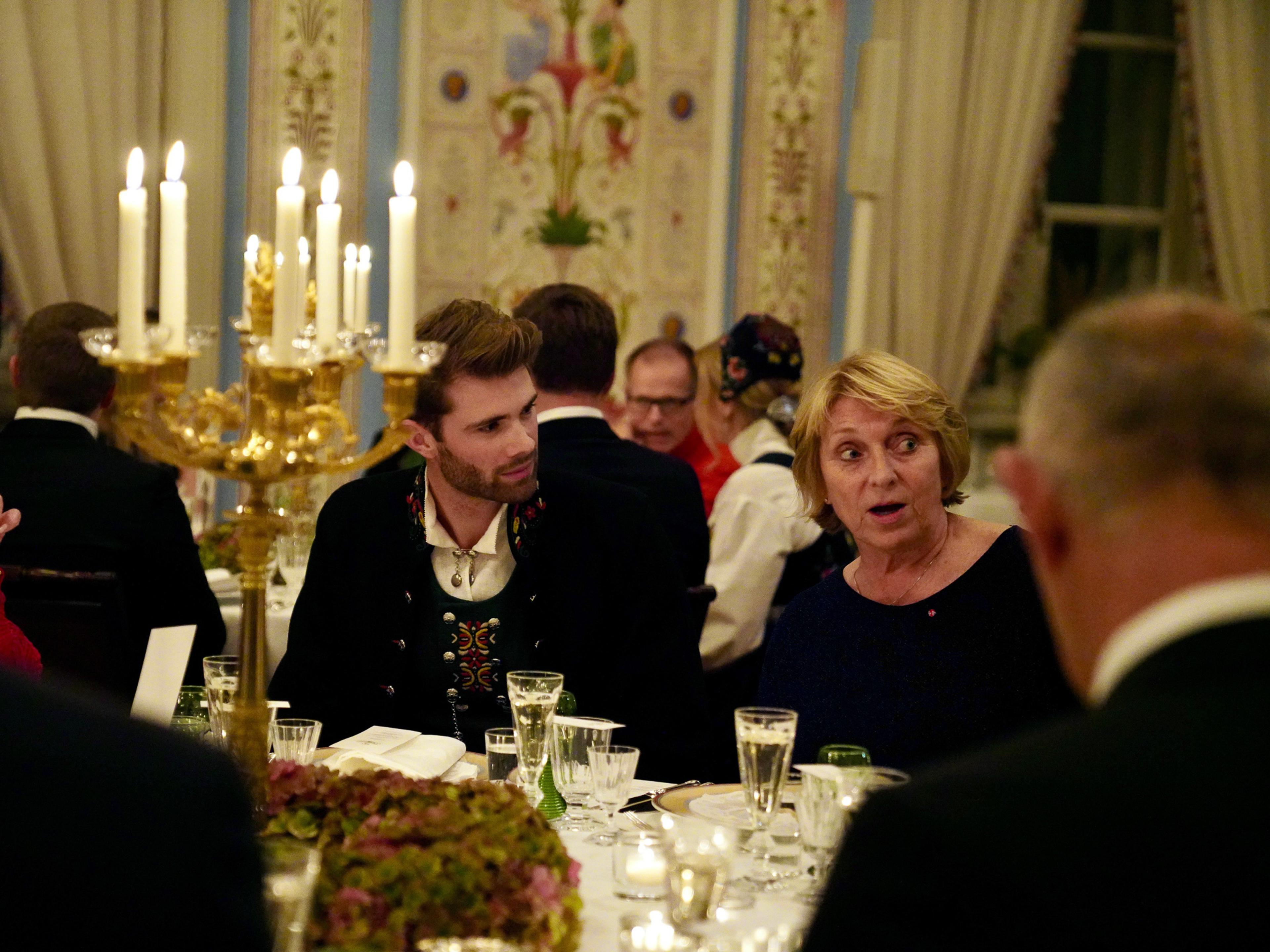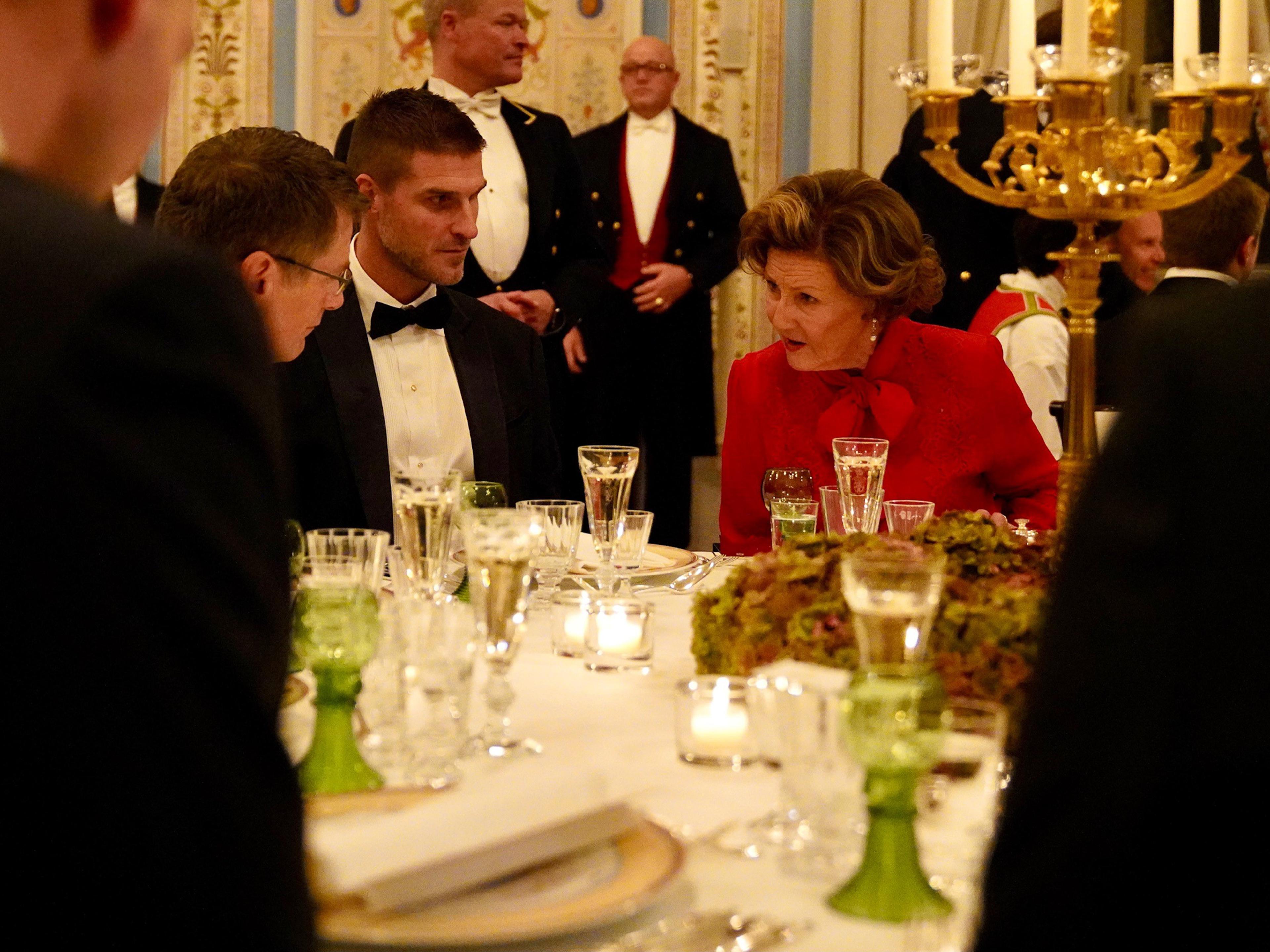 Det var 129 til bords i Store spisesal, inkludert Deres Majesteter Kongen og Dronningen, Deres Kongelige Høyheter Kronprinsen og Kronprinsessen, og Prinsesse Märtha Louise.