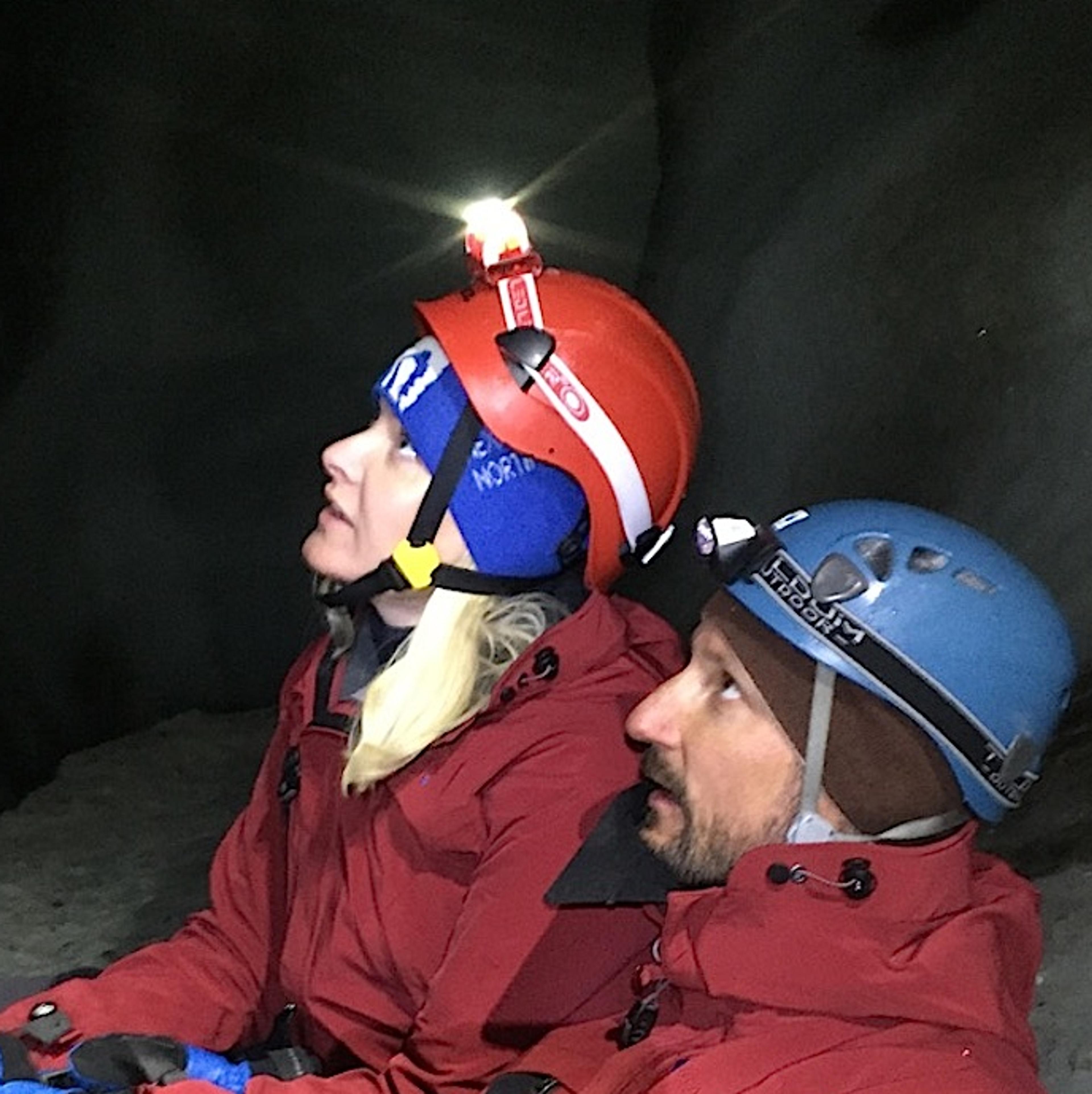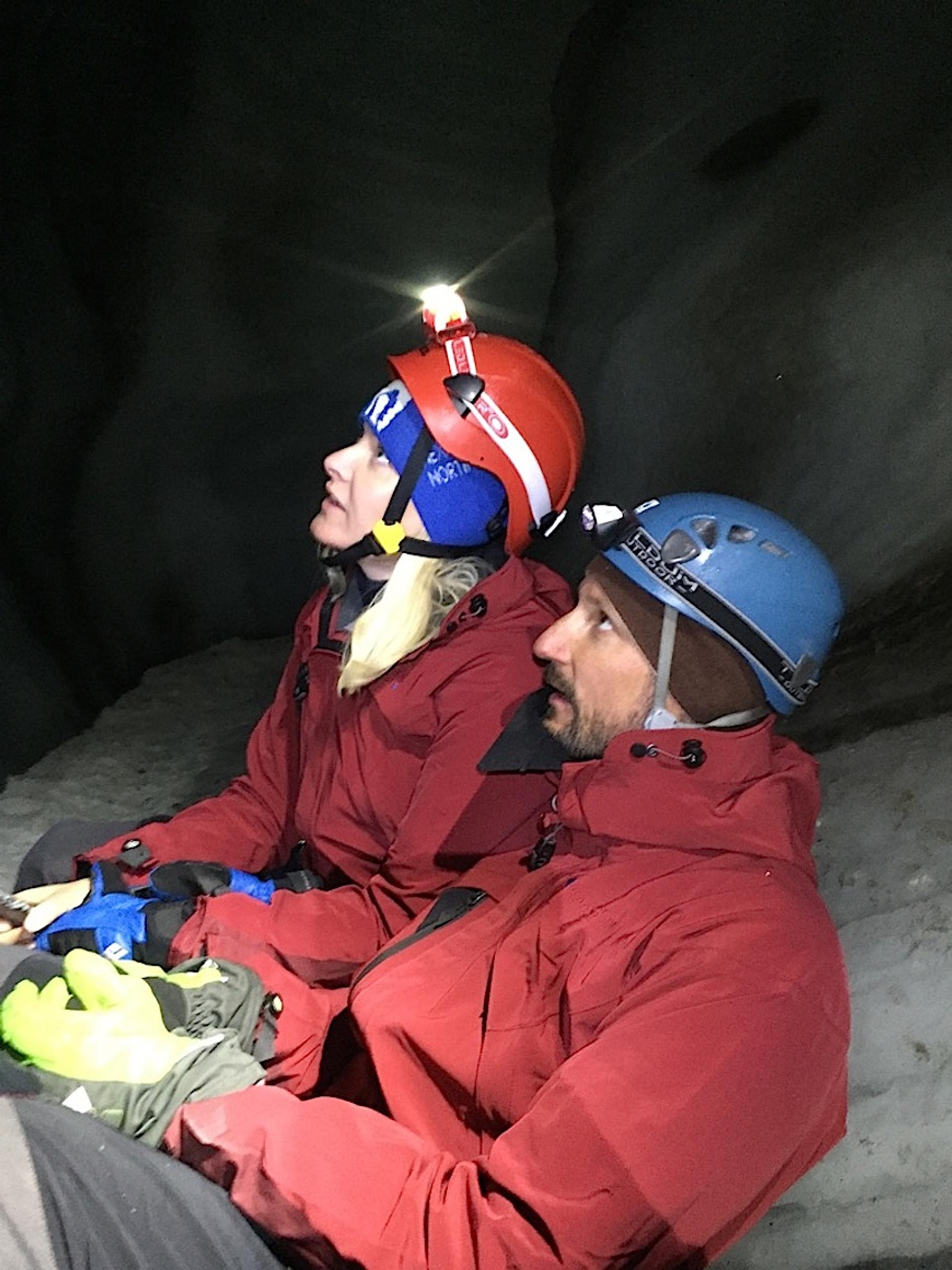 Så ledet mastergradsstudenten Silje Smith Johansen Kronprinsen og Kronprinsessen inn i bregrotten. Flere hundre meter inn i isen fikk Kronprinsparet førstehånds innføring i hvordan endringer i klima og miljø påvirker isbreene her.