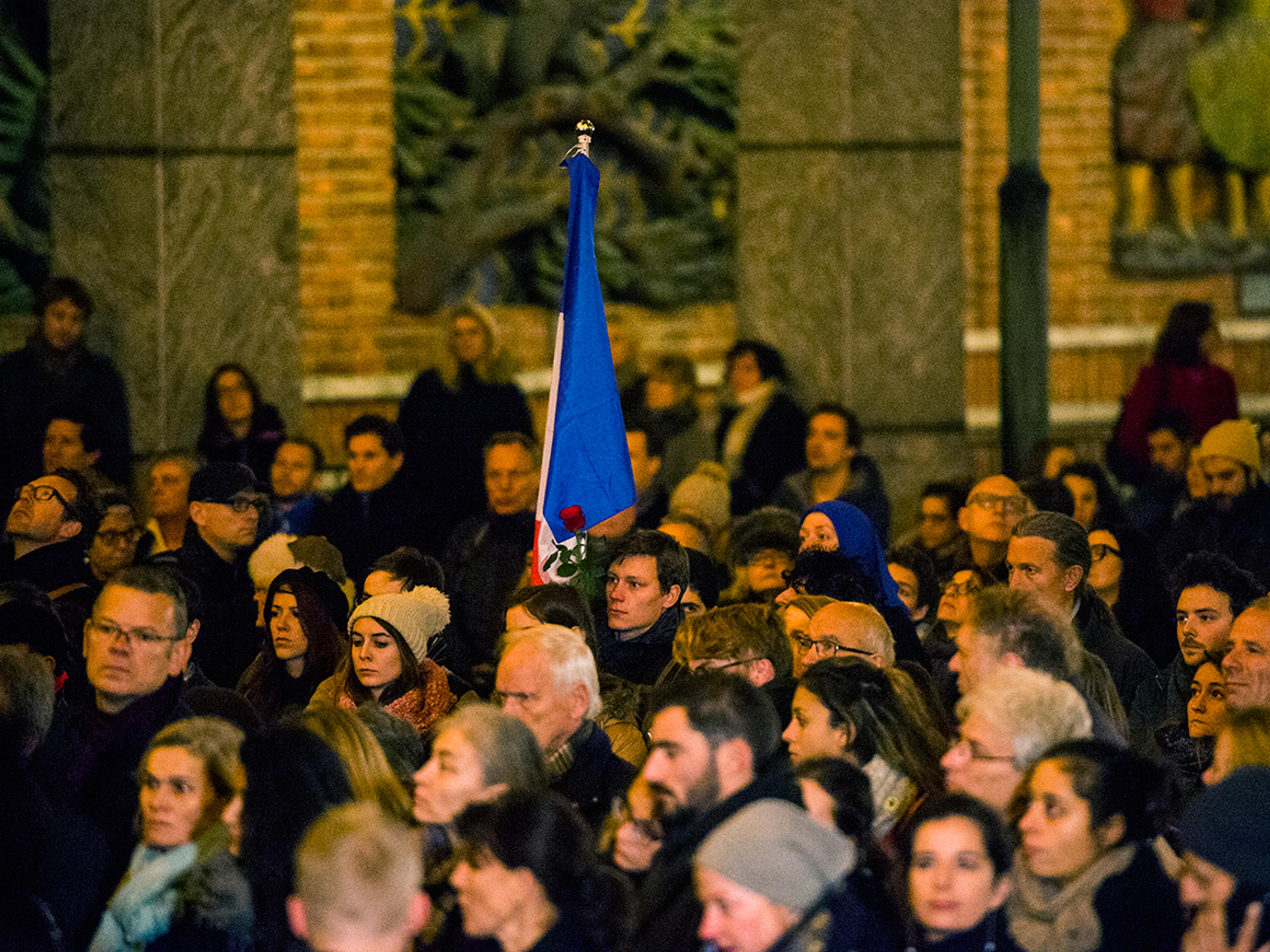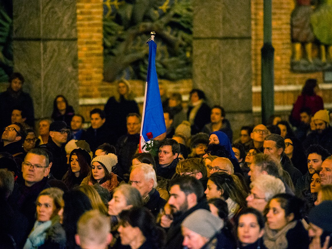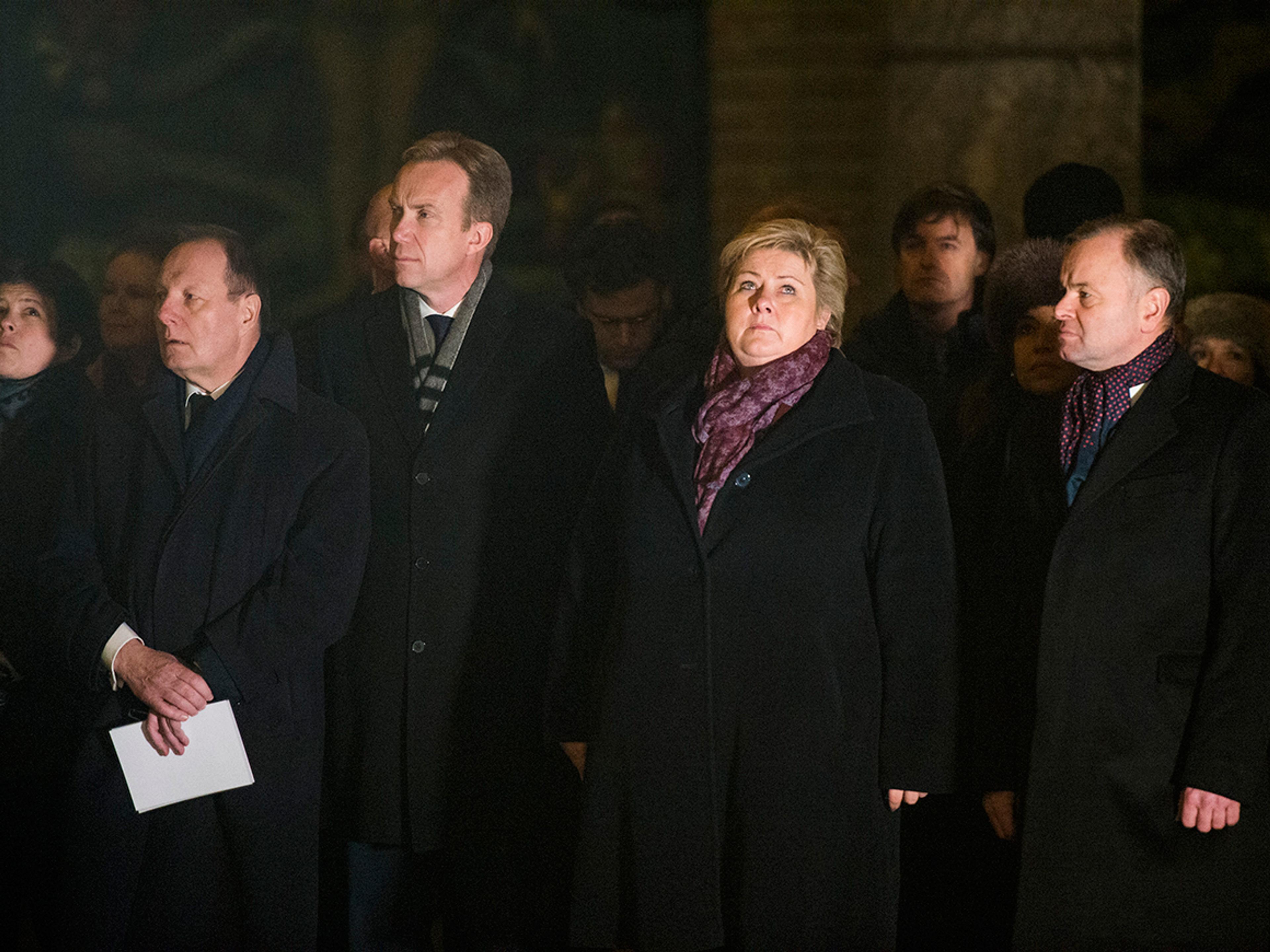 Både statsminister Erna Solberg og den franske ambassadøren holdt taler til minne om ofrene fra de grufulle terrorangrepene i Paris sist fredag kveld. Stortingspresident Olemic Thommesen, utenriksminister Børge Brende og de parlamentariske lederne på Stortinget var også til stede i borggården, sammen med representanter for det diplomatiske korps.