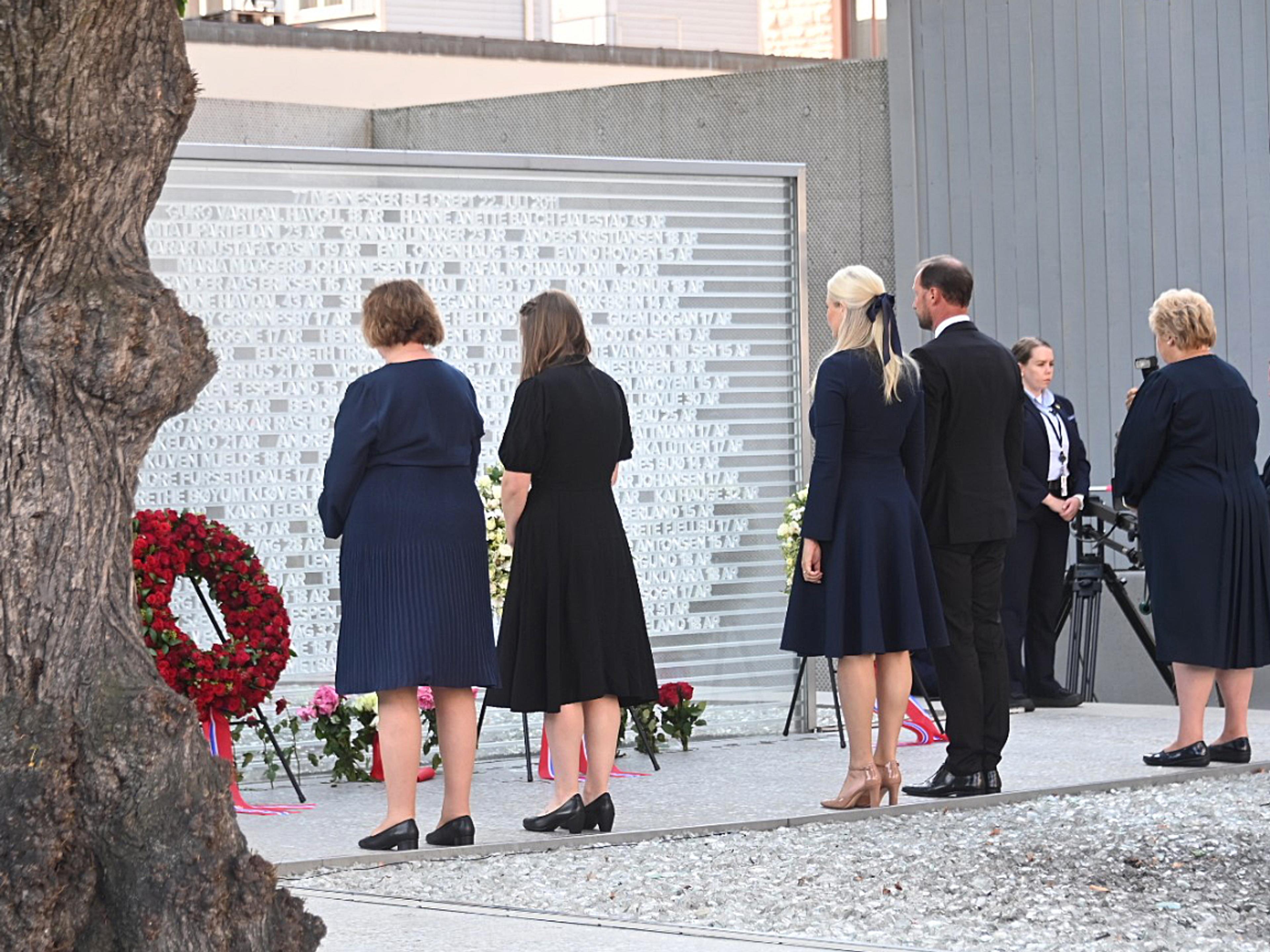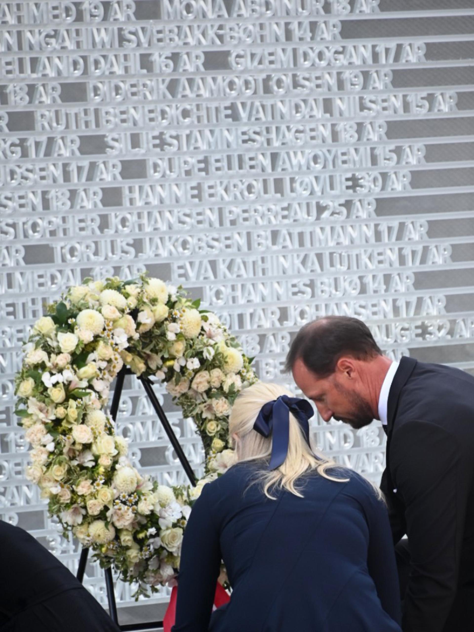 Fire kranser ble plassert ved minnesmerket over de døde. Statsministeren, Deres Kongelige Høyheter Kronprinsen og Kronprinsessen, Astrid Hoem og Lisbeth Røyneland rettet båndene på hver sin krans før ett minutts stillhet ble avløst av Magnus Aannestad Oseth som framførte «Til ungdommen» på Trompet.