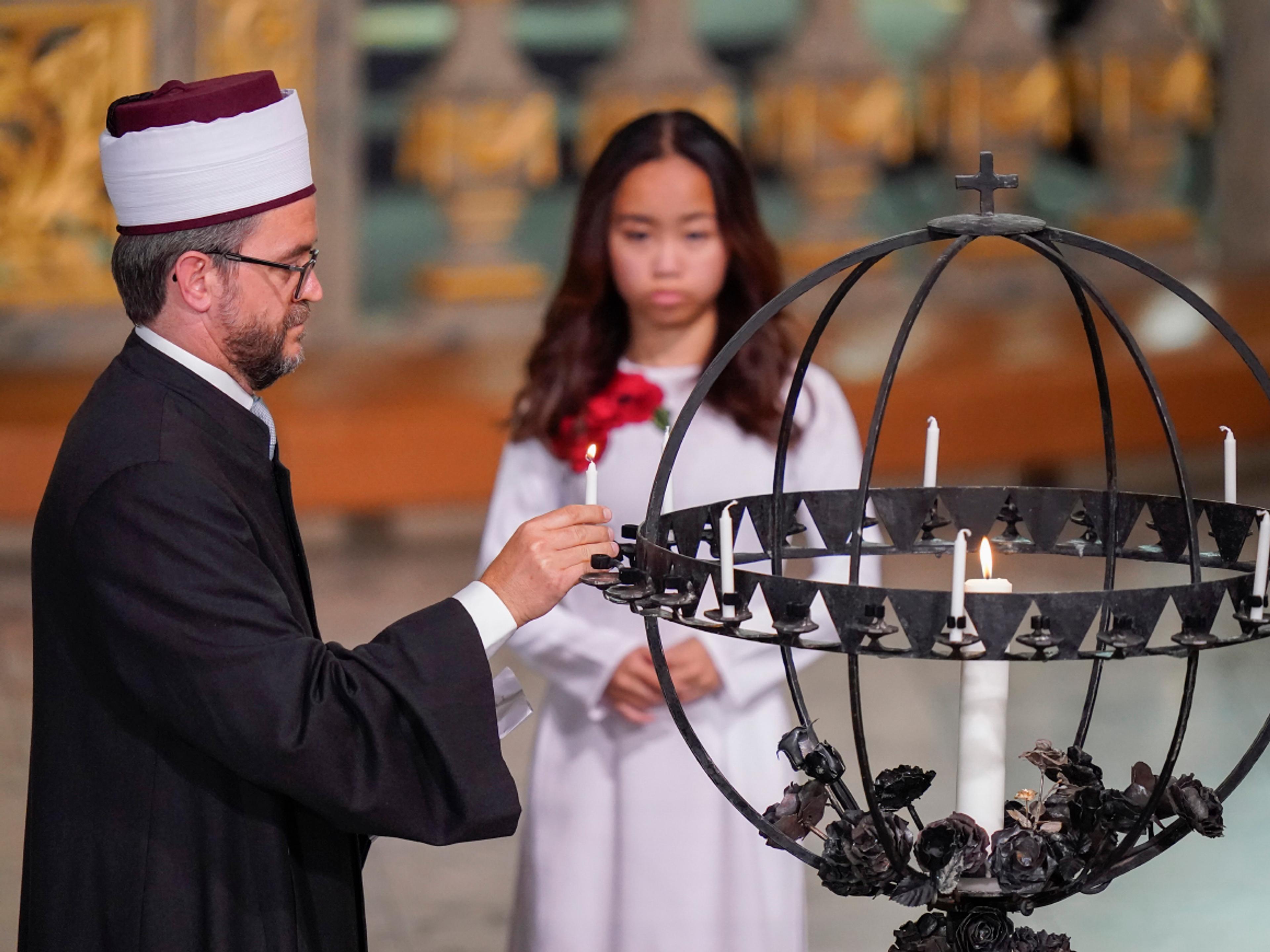 - Vi samles her med ulik tro og livssyn. Vi er alle først mennesker, og deretter muslim, kristen, buddhist, sikh eller annet. Nå er vi her sammen. For å minnes, og tenne lys i solidaritet med ofrene og alle berørte.