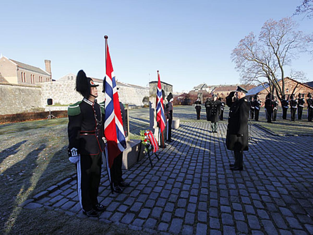 Høytideligheten startet i Minnelunden på Akershus, der stortingspresident Dag Terje Andersen, forsvarsminister Grete Faremo og forsvarssjef Harald Sunde var blant dem som tok i mot Kongen.