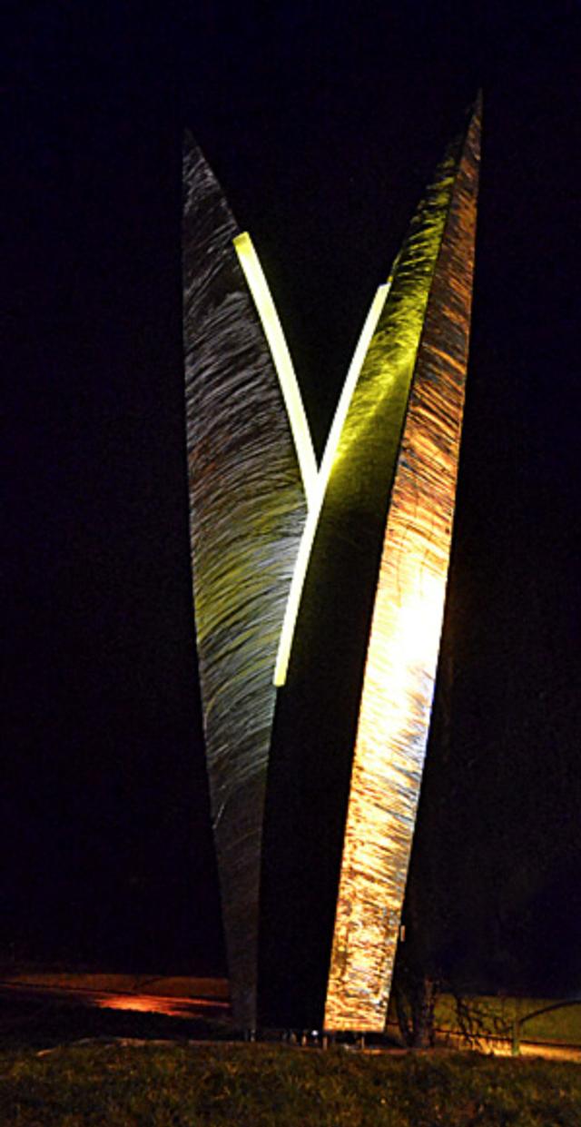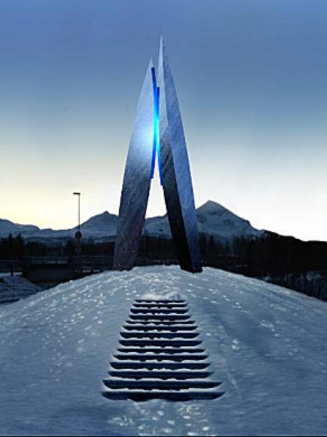 Skulpturen er plassert lett synlig for dem som reiser langs E6. Det er lys langs kantene som møtes, i tillegg til at ståloverflaten reflekterer lys fra spotlights på bakken og andre lyskilder i området, sånn som gatelys, billys og liknende.