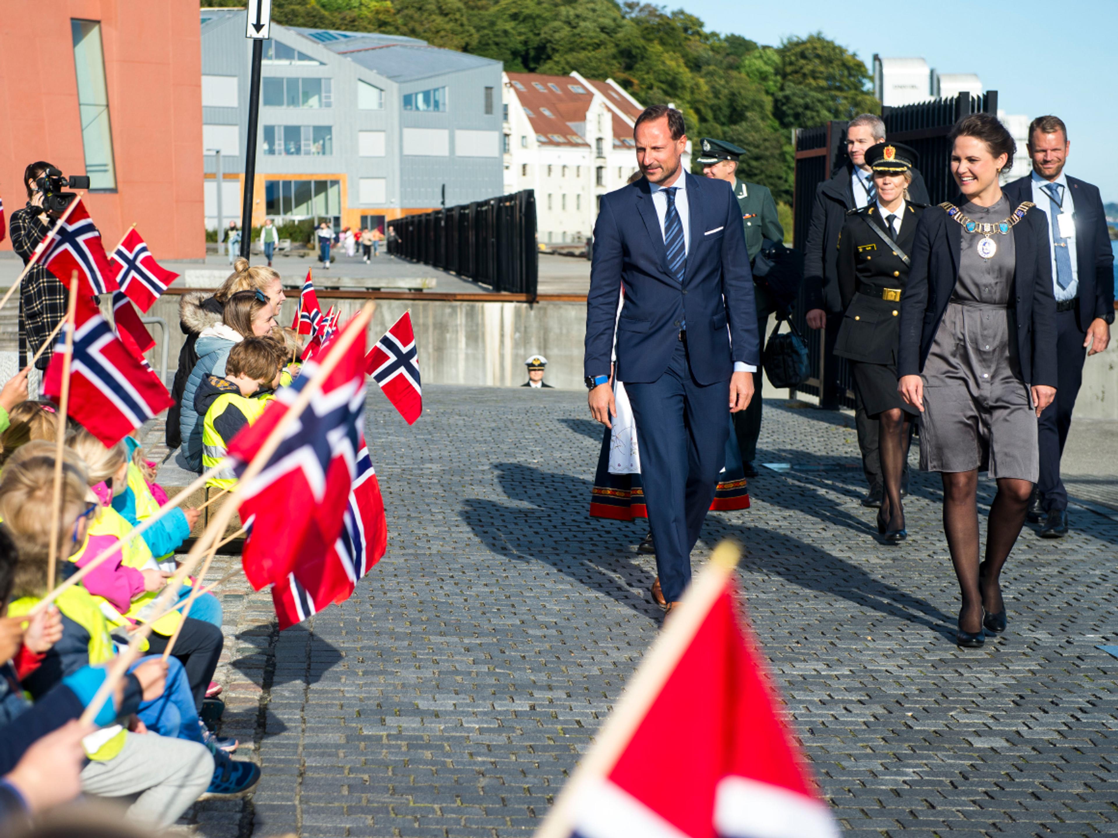 Ledsaget av fylkesmann og ordfører spaserte Kronprinsen langs Strandkaien til Rosenkildehuset der representanter for Næringsforeningen i Stavangerregionen var samlet.