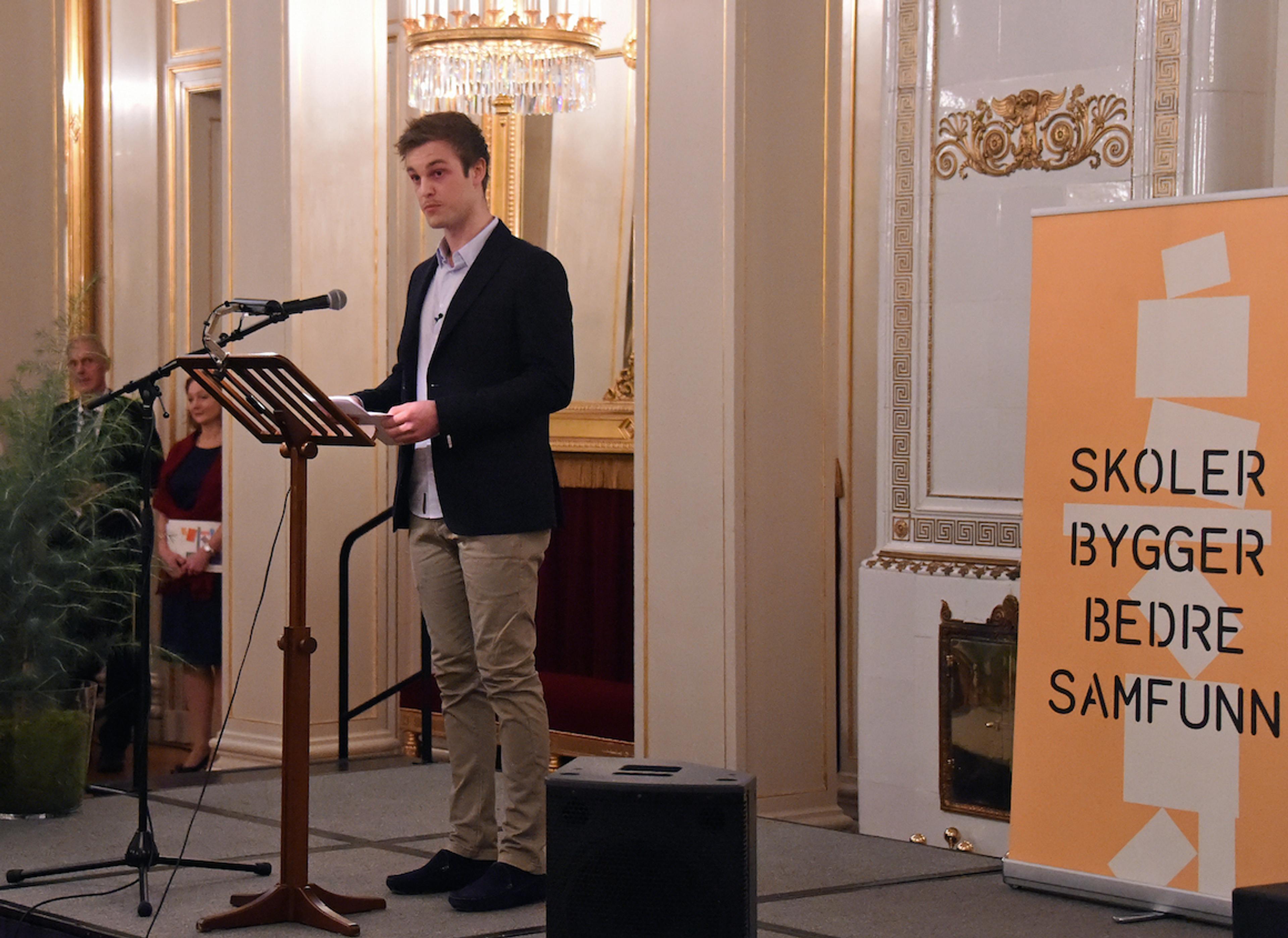 Tidlegare elevrådsleiar Sondre Horst ved Thor Heyerdahl videregående skole og rektor Geir Navarsete heldt talar om kva prisen betyr sett høvesvis frå elevene og skoleleiinga sin ståstad.