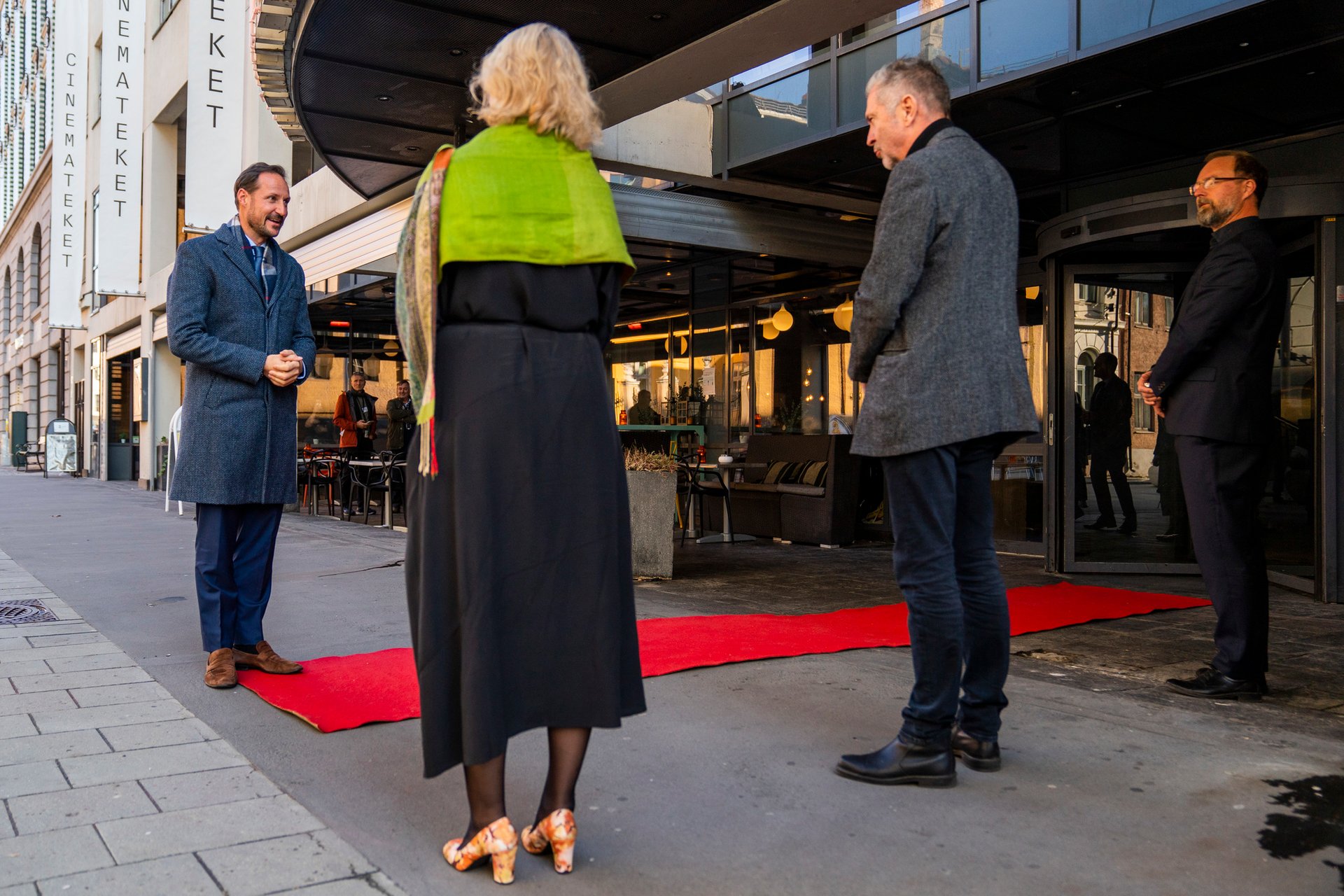 Utenfor Filmens Hus i Oslo ble Kronprinsregenten tatt imot av Agnethe Sophie Buus Jensen fra Norsk Filmdistributørers Forening, Guttorm Pettersen fra bransjeorganisasjonen Film og Kino, og Marton Sundland som er produsent på den nye, norske filmen «Den største forbrytelsen».