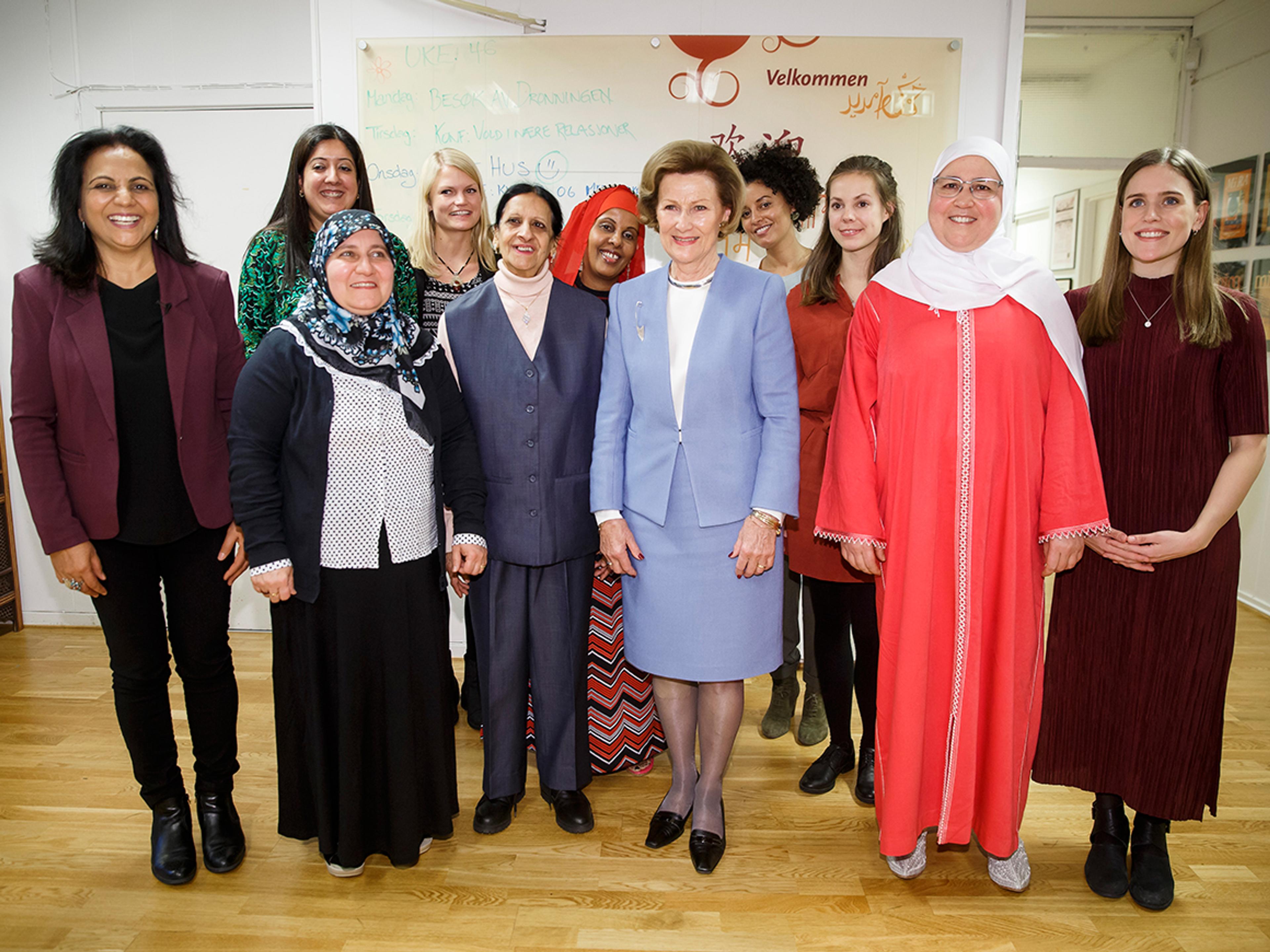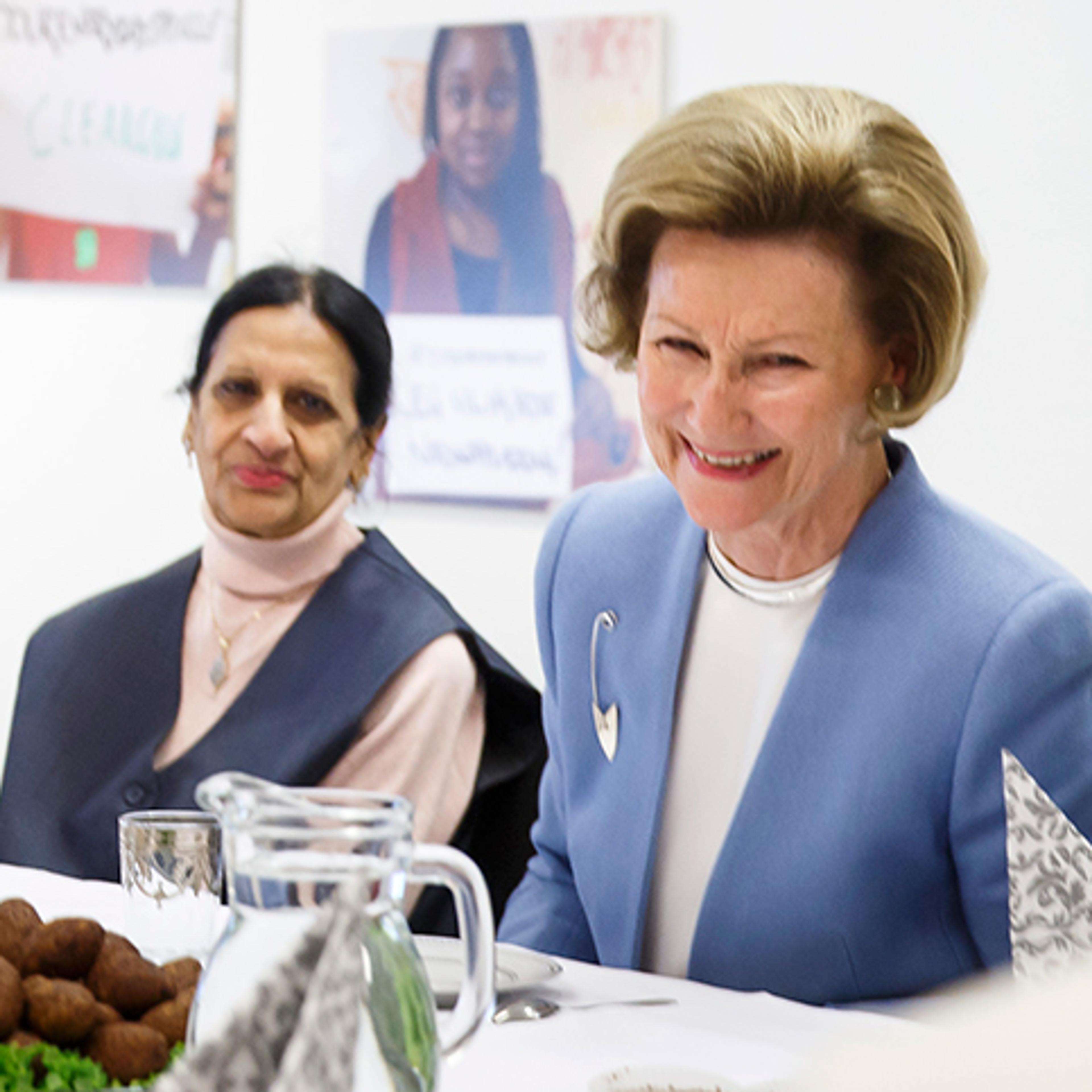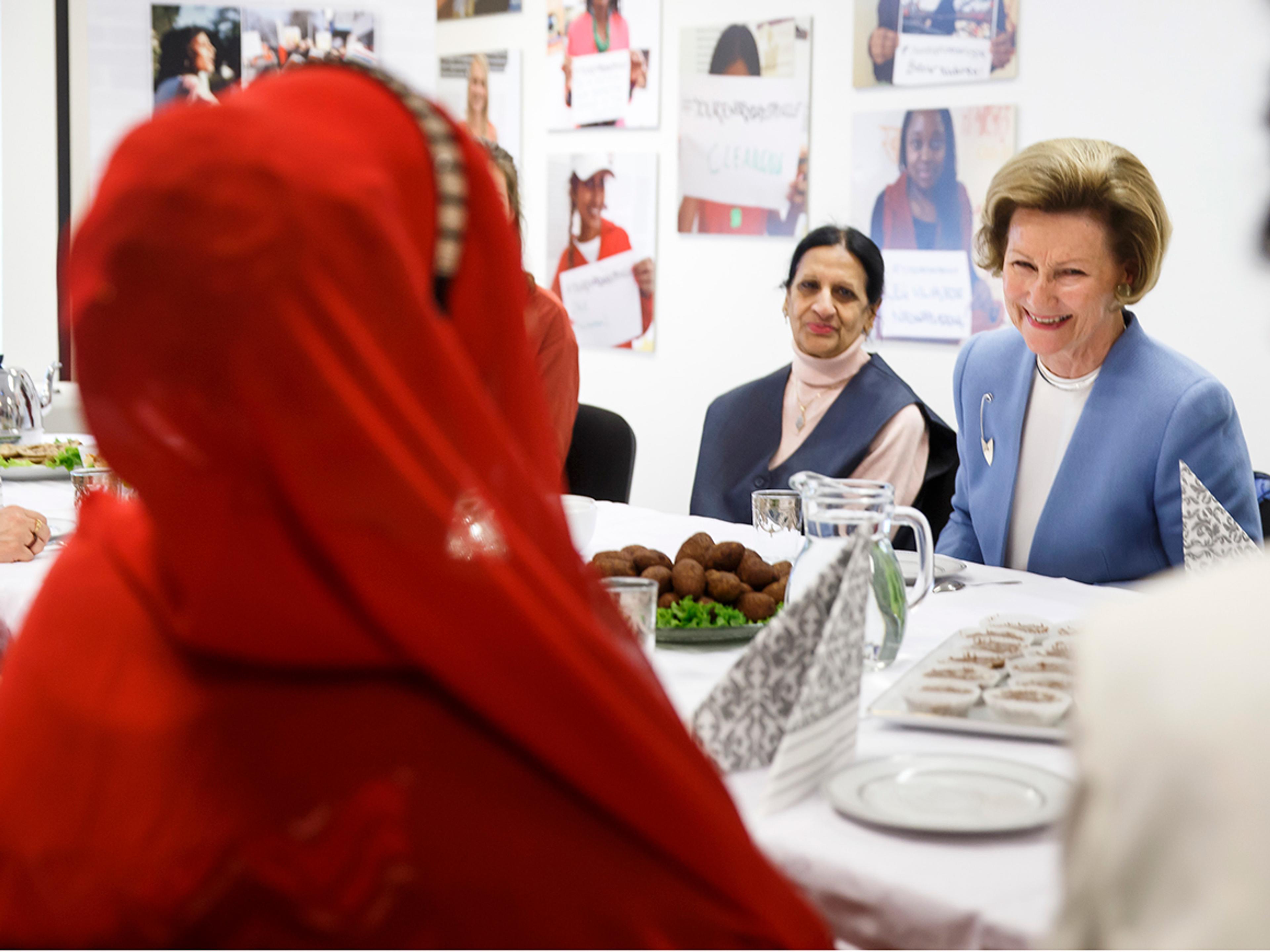 Dronning Sonja fekk møte kvinner med bakgrunn frå fleire nasjonalitetar til samtale. Over eit bord dekt med munngodt frå ulike land og med heimelaga mynte-te i koppen fekk Dronninga høyre om kvinnenes erfaringar, håpa og draumane deira og møtet deira med Noreg.