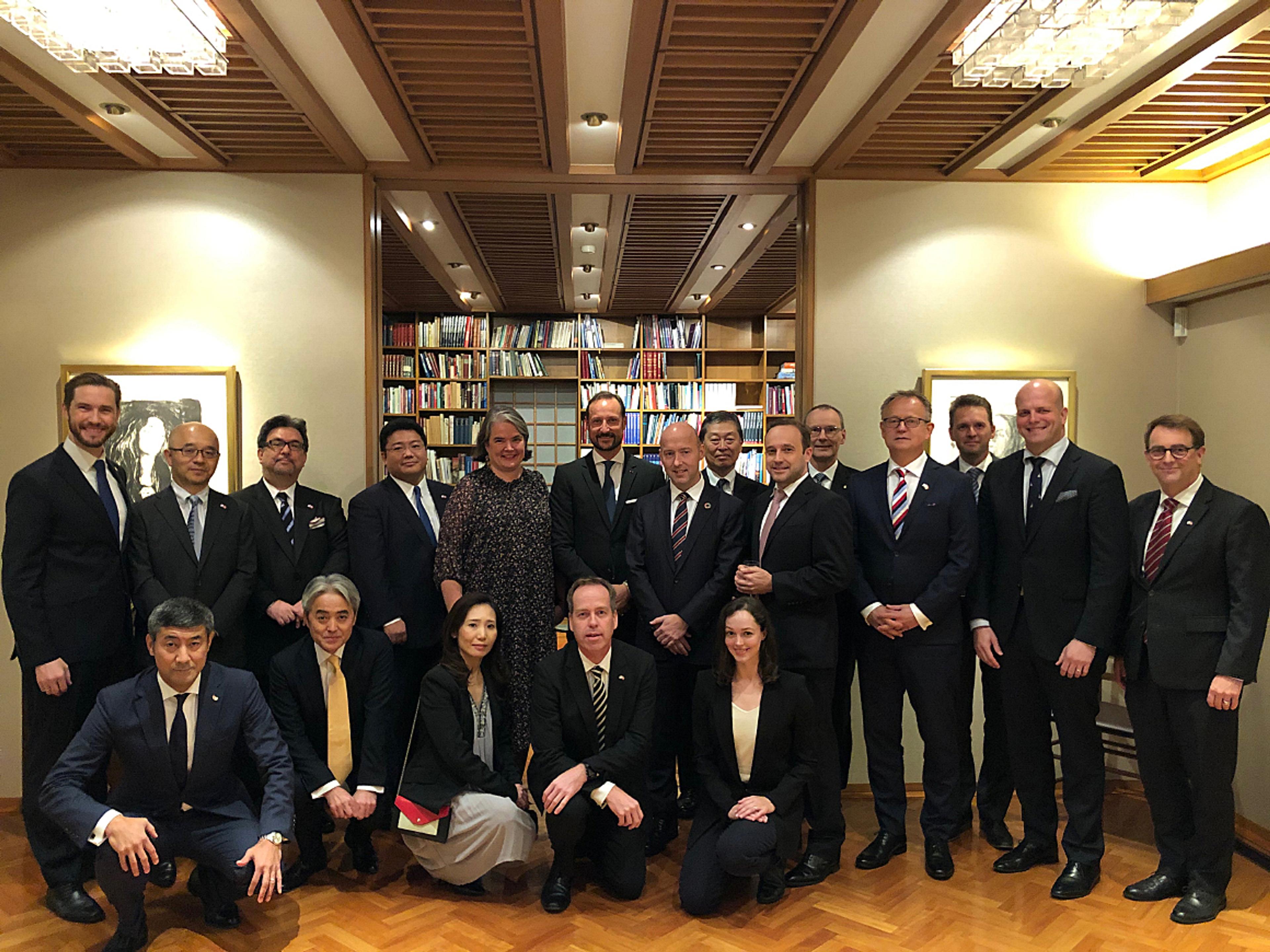 Den Høgvørde Kronprinsen møtte japanske og norske næringslivsleiarar under ei mottaking i Tokyo i dag. Kronprinsen er i Japan i høve tronskifteseremonien i morgon.