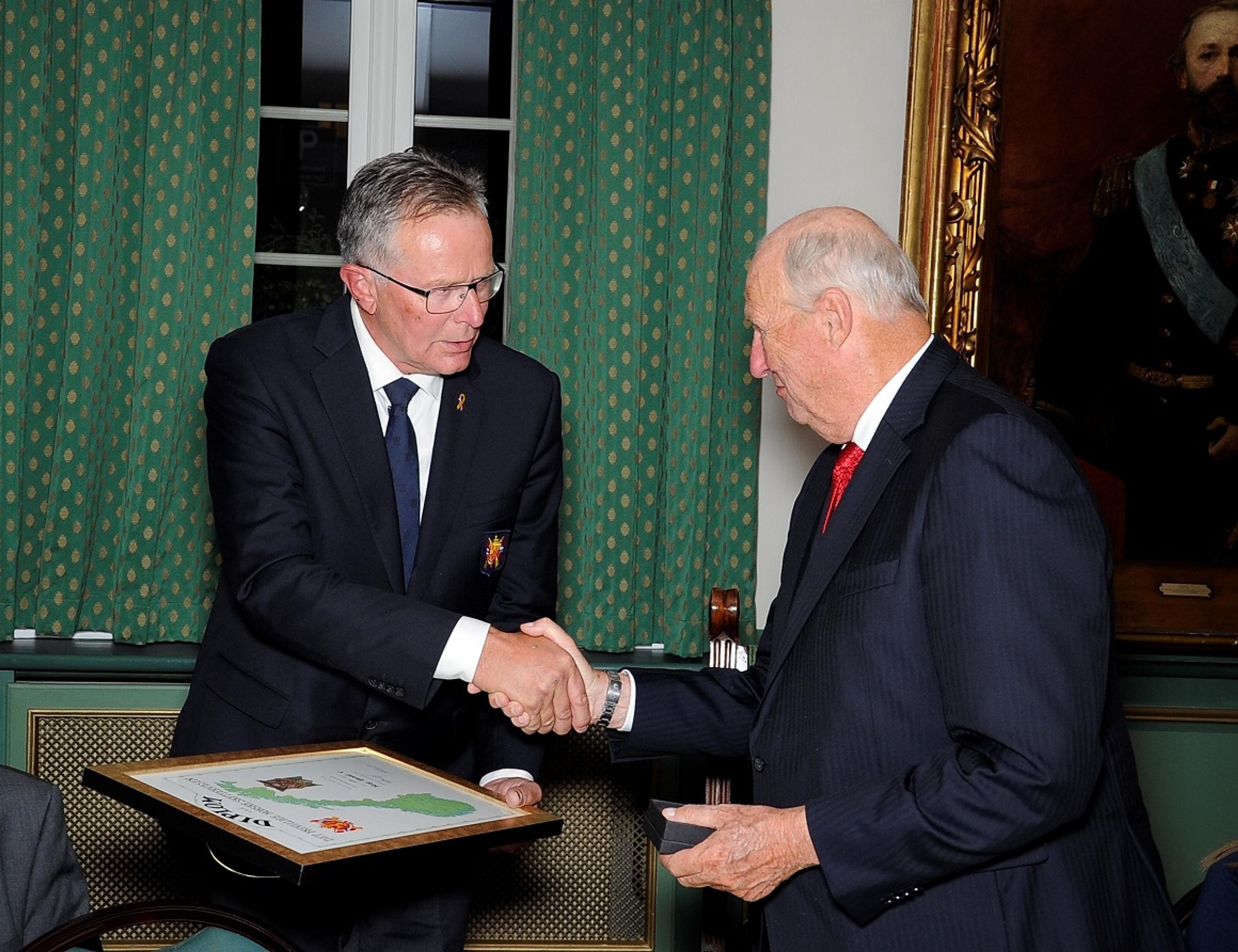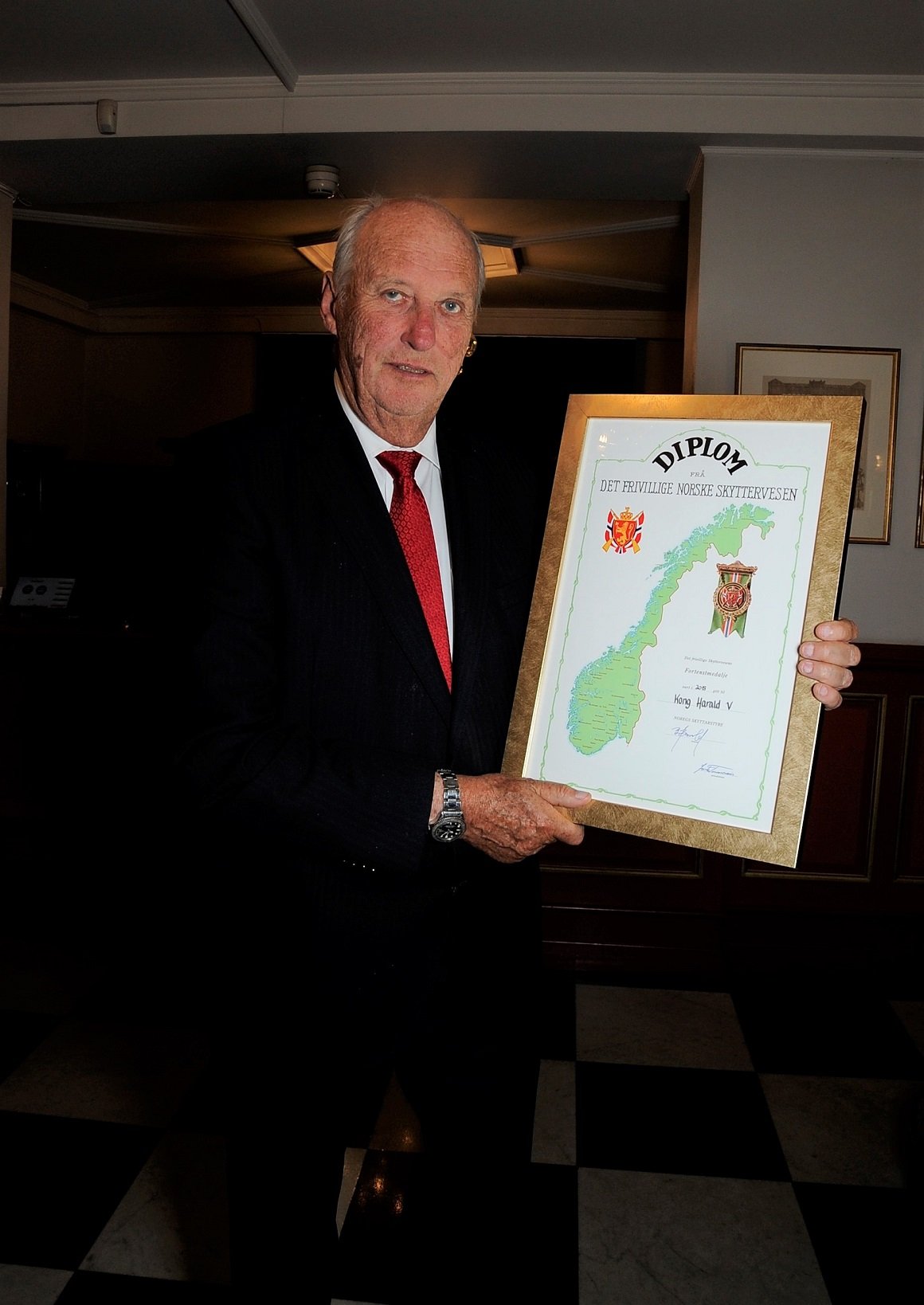 Kongen ble tildelt fortjenstmedaljen under Det frivillige Skyttervesens festmiddag i Oslo Militære Samfund. Medaljen ble overrakt Hans Majestet av organisasjonens president Bernt I.F. Brovold.