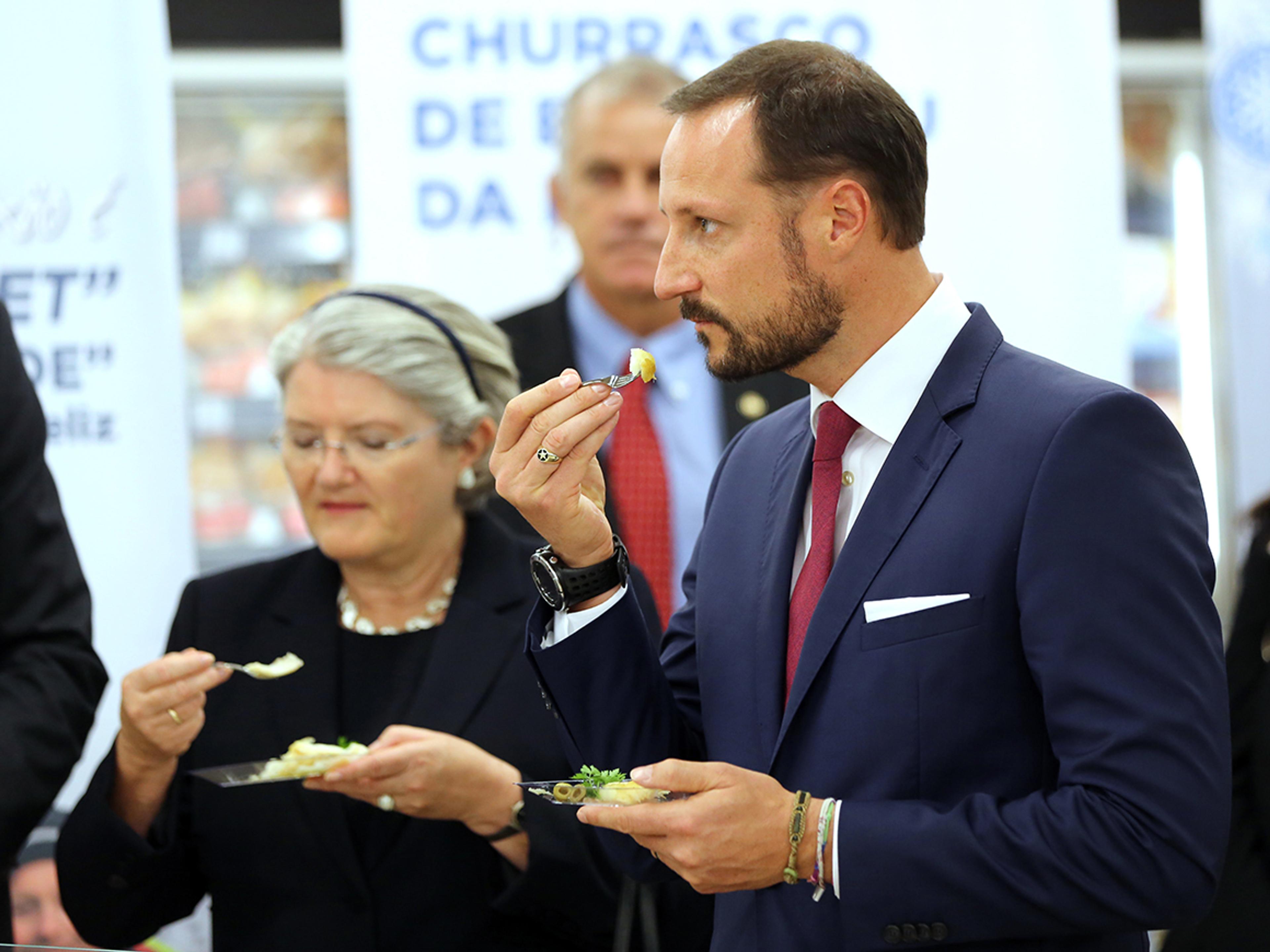 Kronprinsen kom også inn på vår eldste handelsrelasjon. I mer enn 170 år har Norge solgt klippfisk til Brasil og kjøpt kaffe tilbake, og fra åpningen av seminaret dro Kronprins Haakon for å bistå i promoteringen av nettopp norsk fisk.