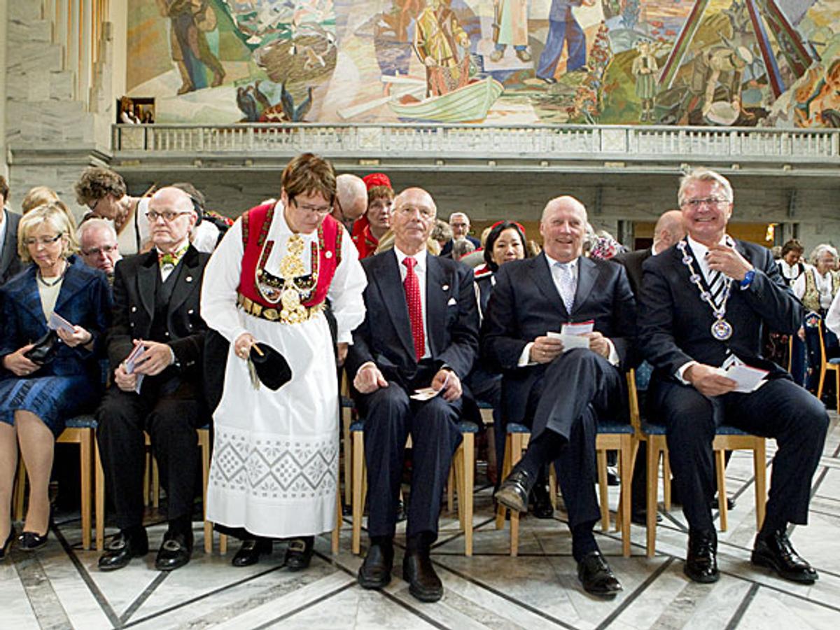 900 festkledde festmøtedeltakarar vart ønskte velkommen til Rådhushallen av Oslo-ordførar Fabian Stang.