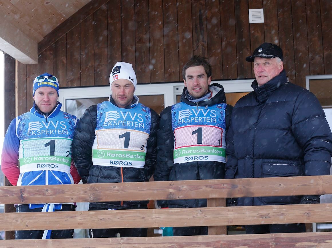Senere på dagen kunne Kong Harald ta i mot Petter Northug på Kongetribunen igjen - denne gangen etter seier for Strindheim i mennenes stafett sammen med Lars Ove Aunli og Tomas Northug.