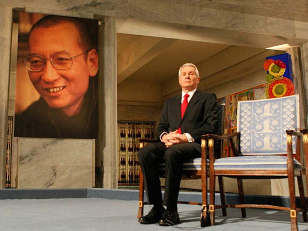 Nobelkomiteens leder, Torbjørn Jagland, talte og redegjorde for valget av Liu Xiaobo som mottaker av årets fredspris. Jagland avsluttet med en symbolsk overlevering av prisen ved å plassere medaljen og diplomet i den tomme stolen der Liu Xiaobo skulle ha sittet.