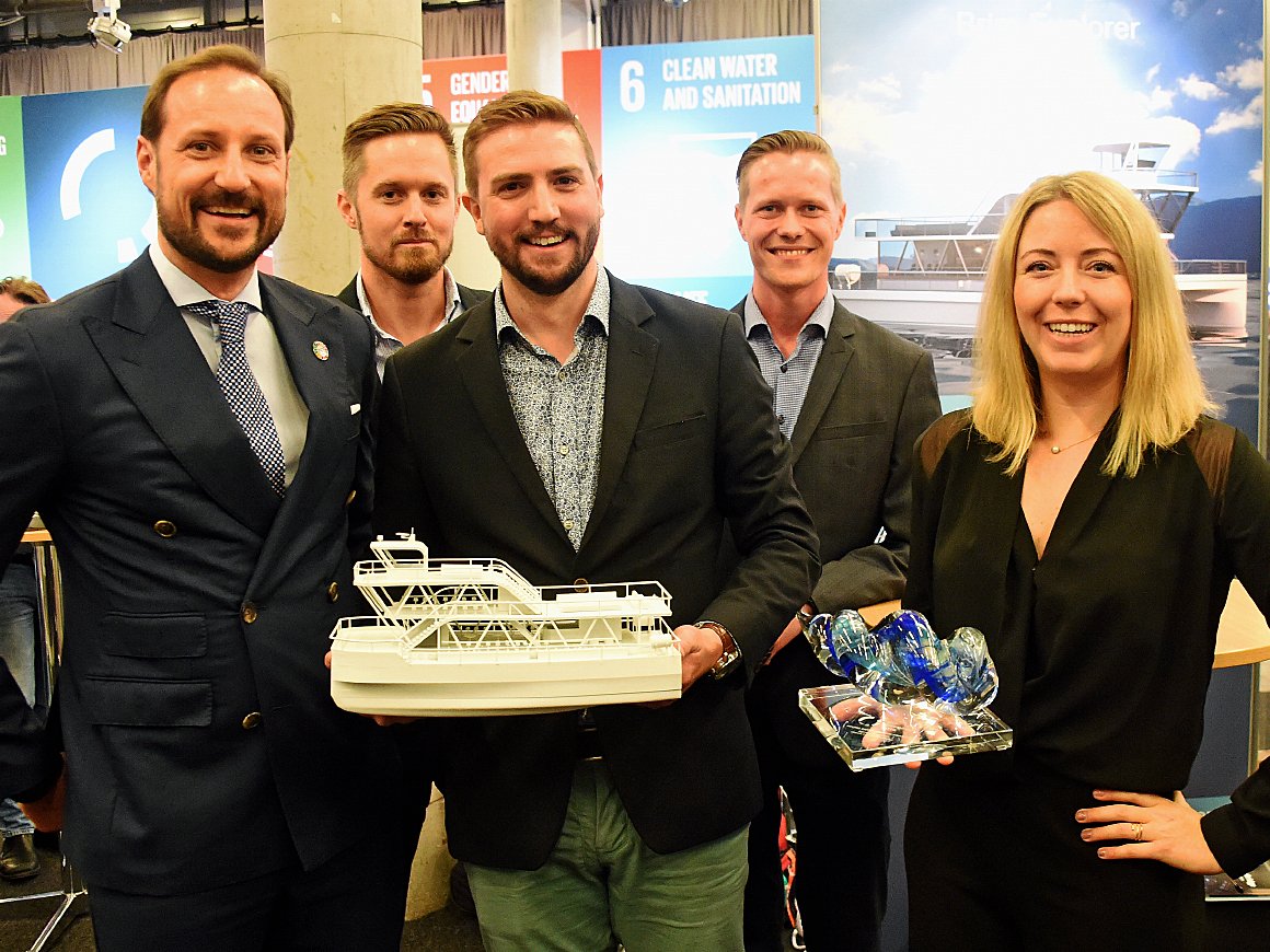 Ved åpningsseremonien i Oslo rådhus i går kveld ble Nor-Shippings Young Entrepreneur Award 2019 delt ut. Årets pris gikk til Agnes Árnadóttir og Espen Larsen-Hakkebo som har etablert oppstarteren Brim. Selskapet står bak katamaranen som ikke bare er en ordinær turistbåt, men også en tech- og læringsplattform - og dertil utslippsfri så vel som støyfri. Ved hjelp av moderne sensorteknologi skal Brim samle inn data som blant annet kan bidra til å løse utfordringen med plast i havet. Kronprinsen gratulerte vinnerne og fikk vite mer om prosjektet da han besøkte standen til de to.
