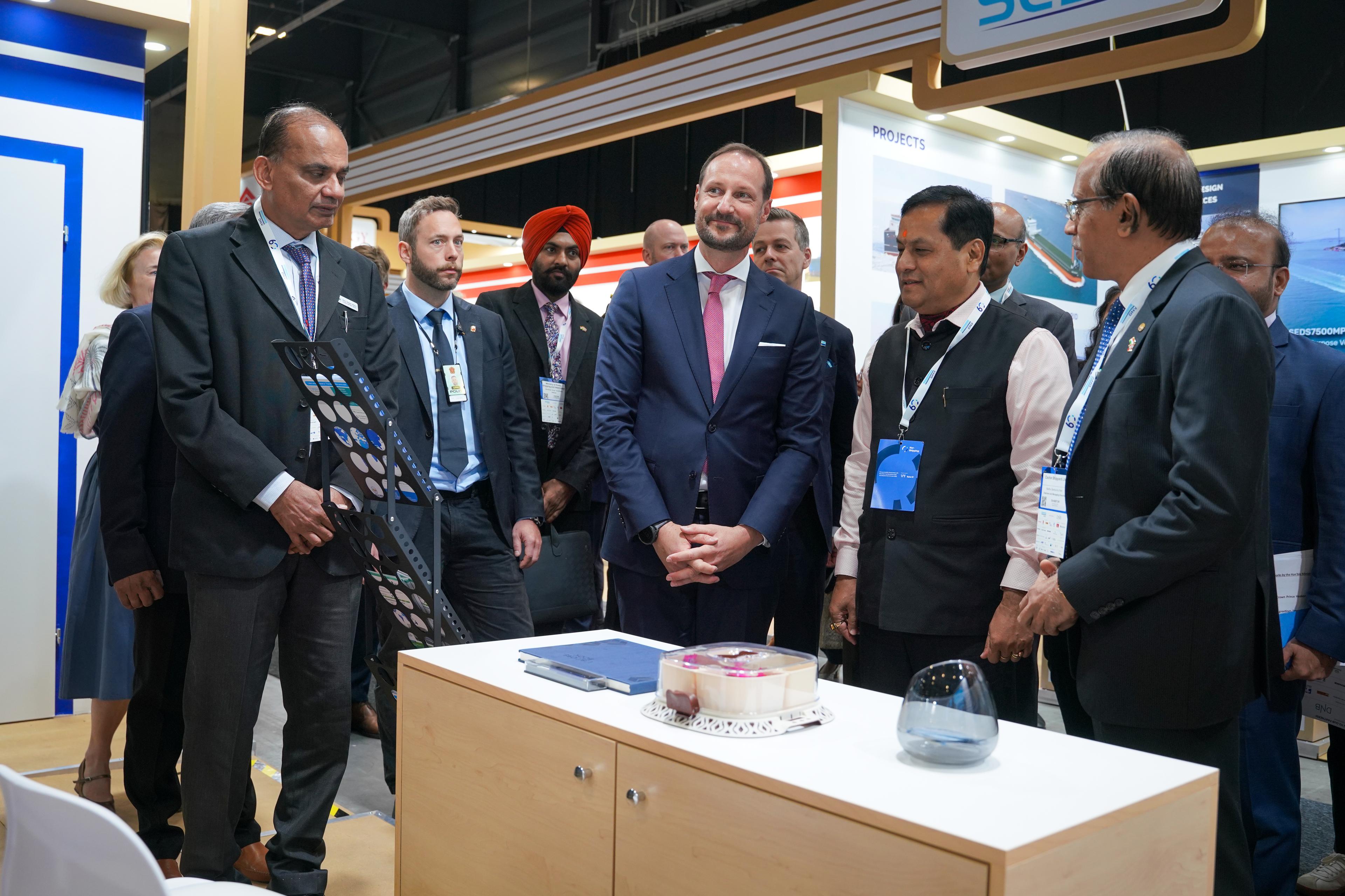 Rundt 1000 utstillere fra over 50 land er på plass på messeområdet i Nova spektrum under messen Under omvisningen besøkte Kronprinsen Indias paviljong, Det Norske Veritas og Kjeller Innovasjon, og fikk høre mer om hvordan de jobber med shipping, bærekraftige løsninger og innovasjon.