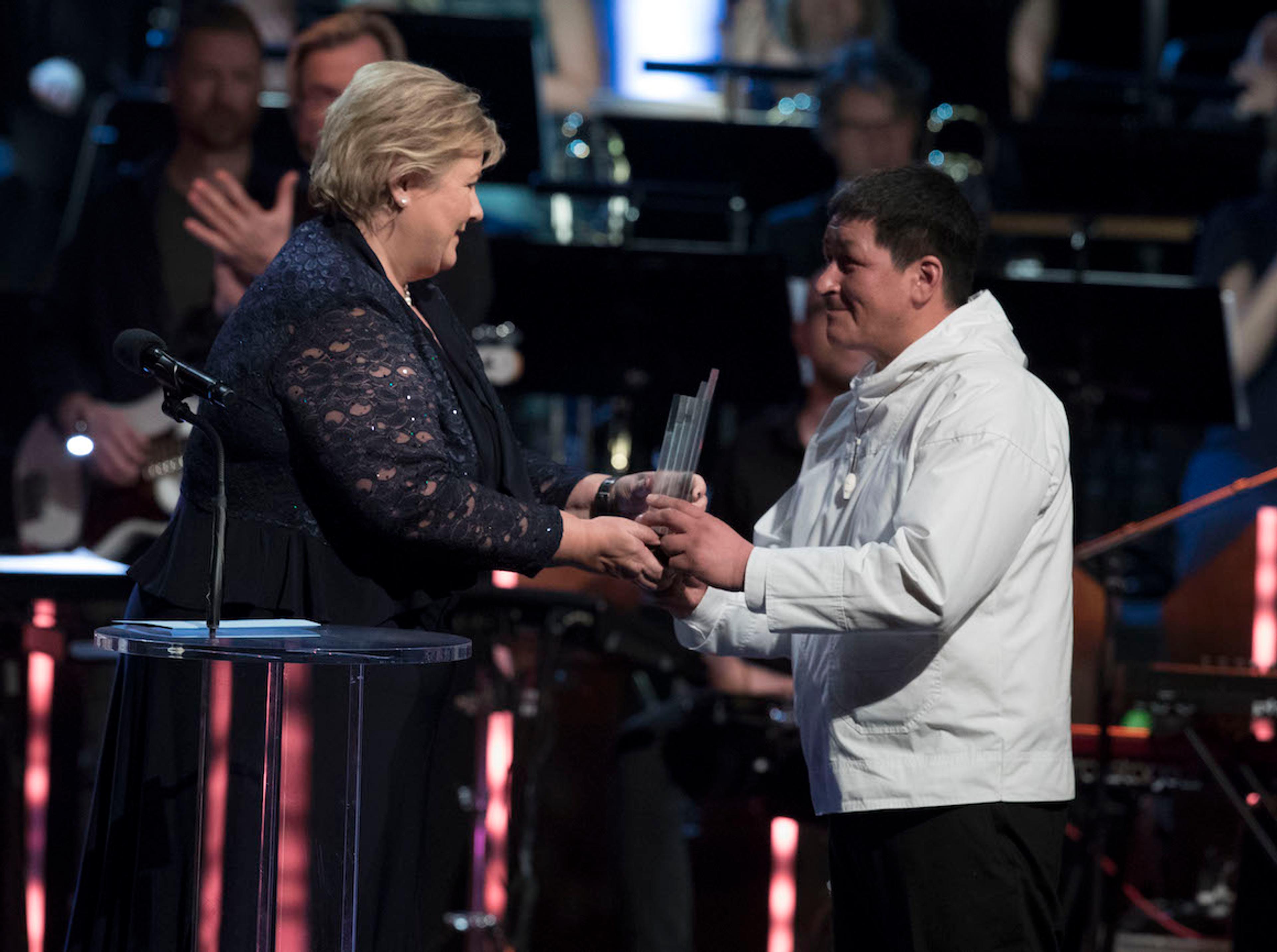 Også statsminister Erna Solberg var blant prisoverrekkjarane i kveld. Ho overrekte Miljøprisen til Naturressursrådet i Attu på Grønland for innsatsen deira for å dokumentere og formidle lokalbefolkningas kunnskap og erfaring om havmiljøet.