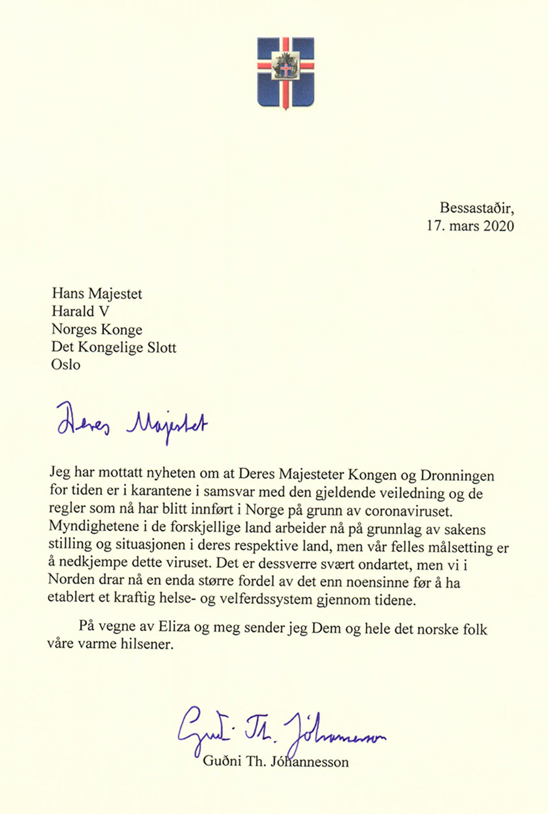 Islands president, Hans Eksellense herr Guðni Th. Jóhannesson, sendte brev til Kong Harald da Kongeparet var i karantene etter sitt statsbesøk til Jordan i begynnelsen av mars.