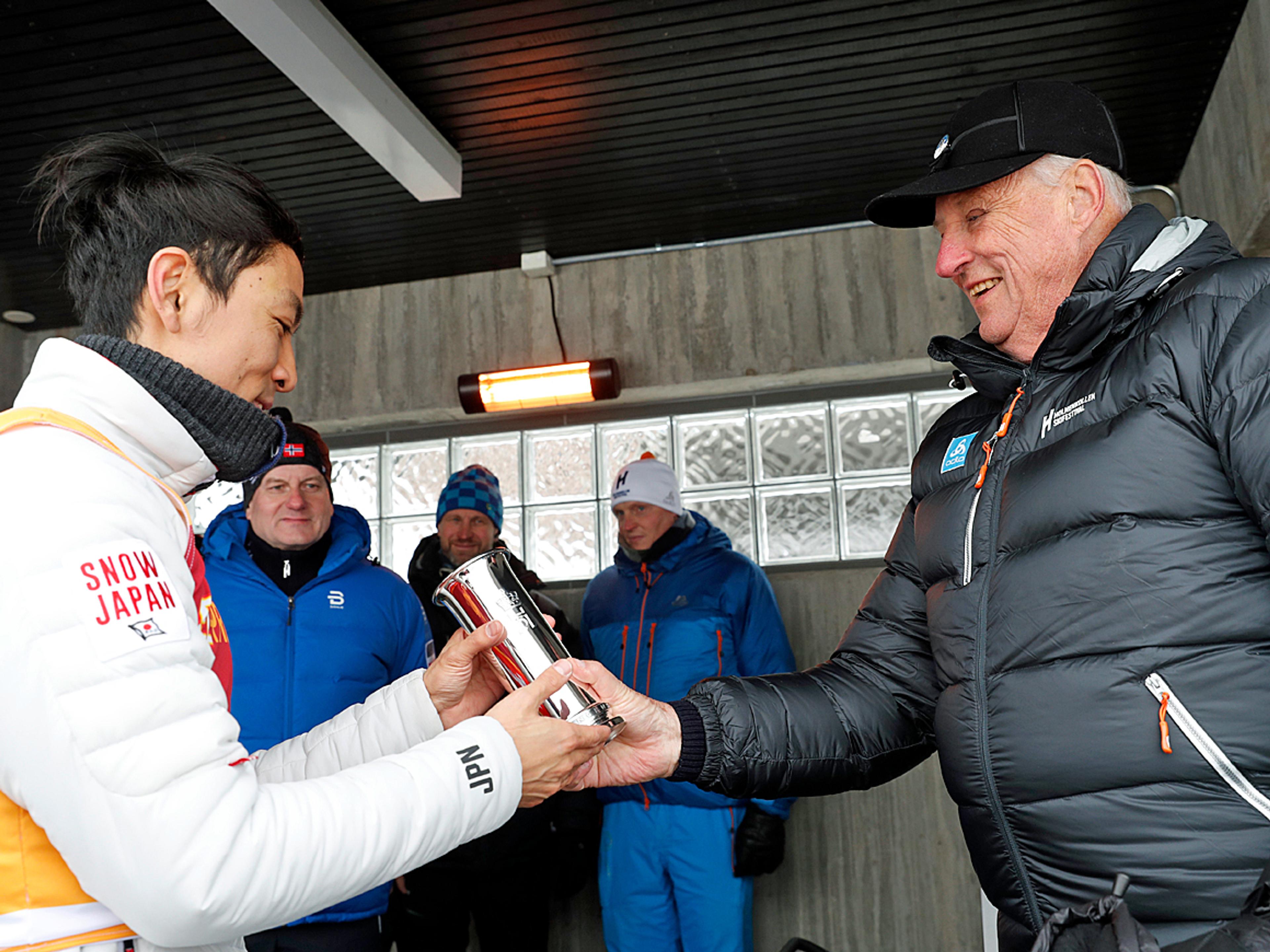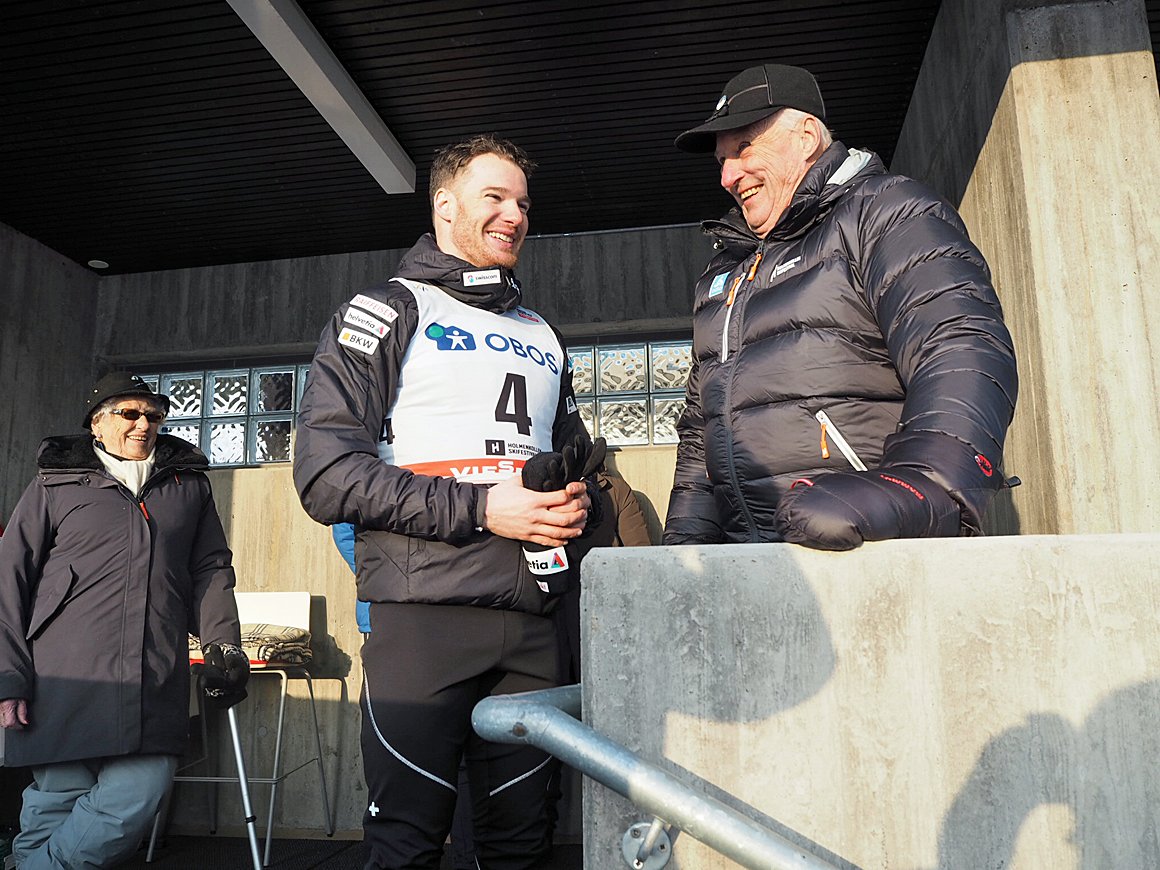 Kong Harald og Prinsesse Astrid tilbrakte også lørdagen i Holmenkollen under kombinert og mennenes femmil. Tradisjonen tro tok Kongen og Prinsessen imot vinnerne, japanske Akito Watabe og sveitseren Dario Cologna, på Kongetribunen.