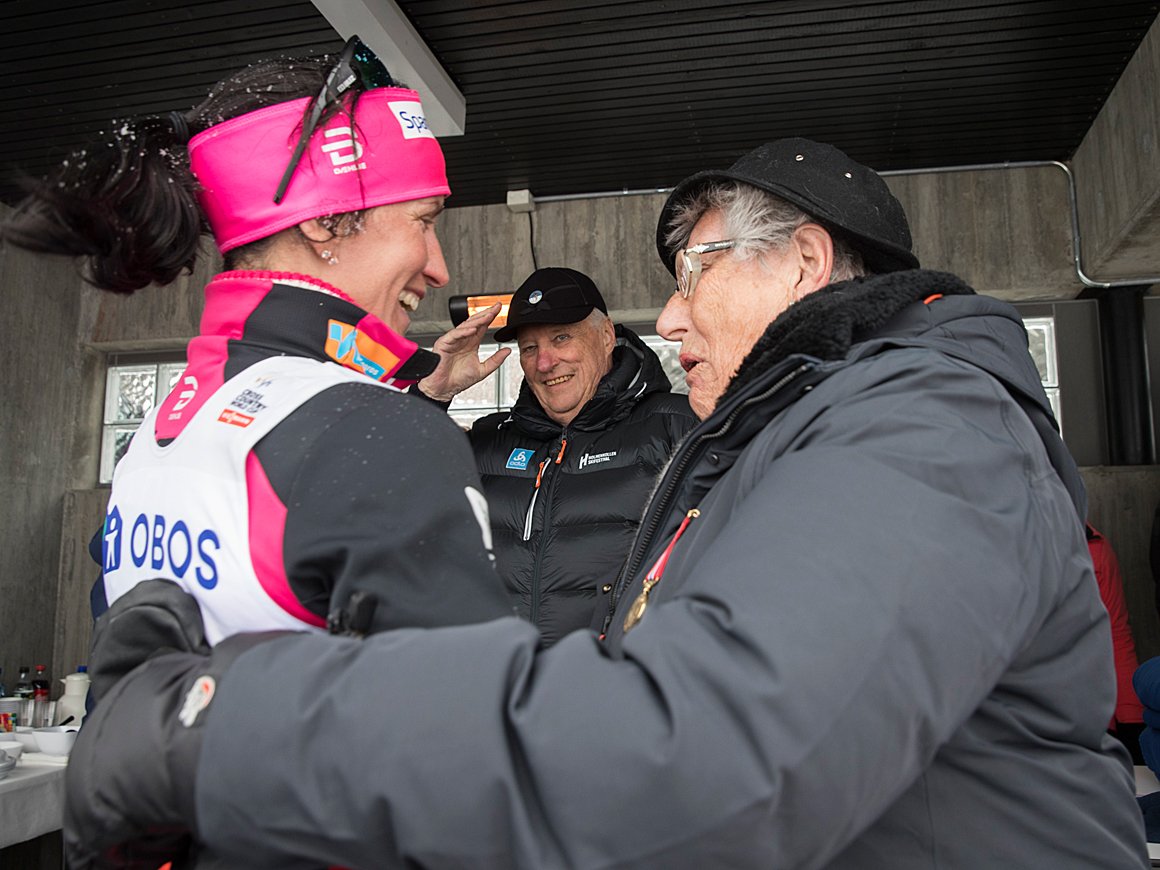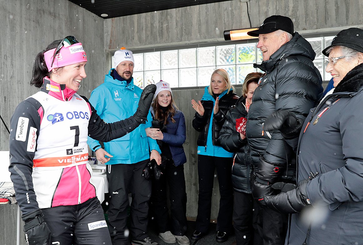 På tribunen sto Kongeparet, Kronprinsfamilien og Prinsesse Astrid for å gratulere Bjørgen med enda en seier i Kollen – den sjuende totalt.