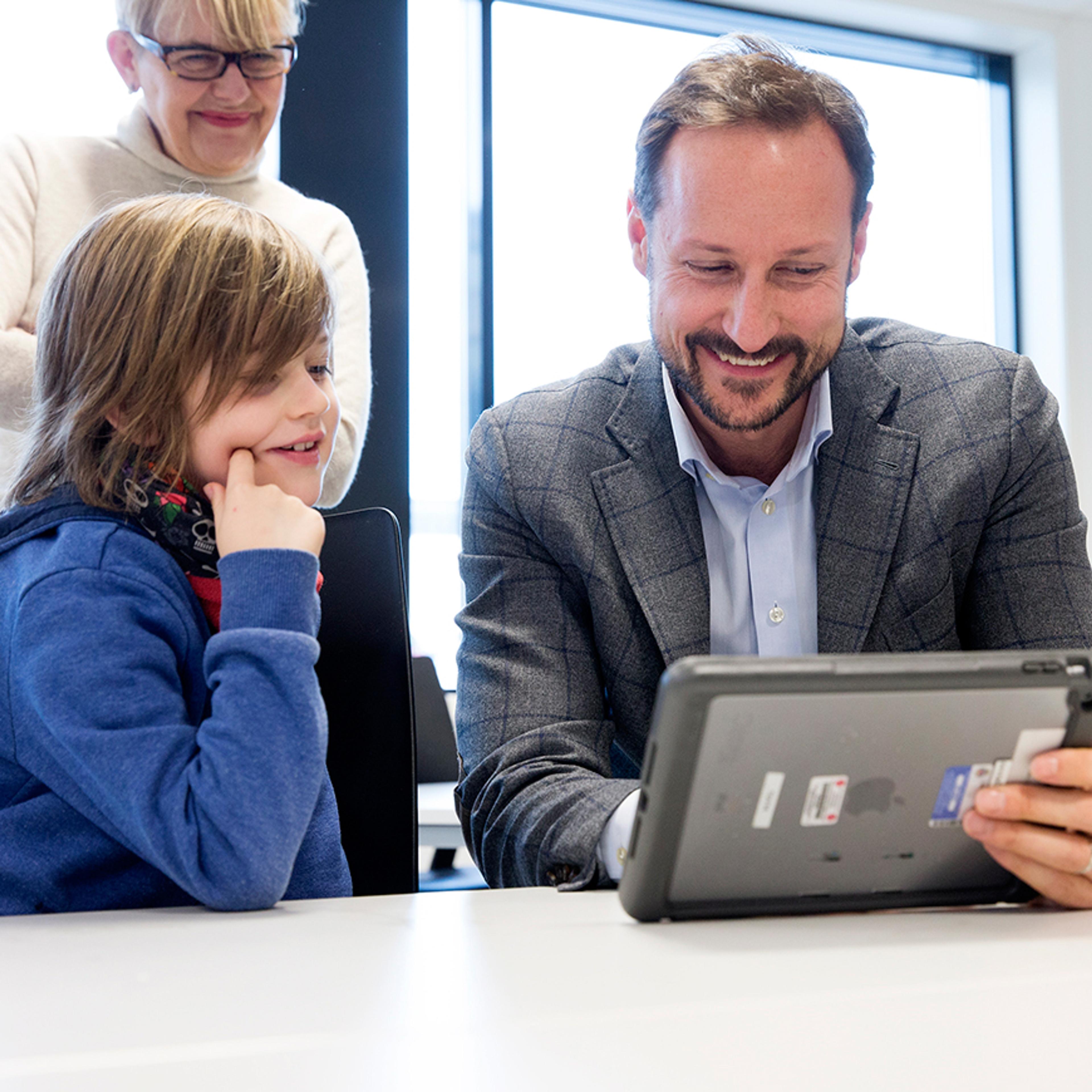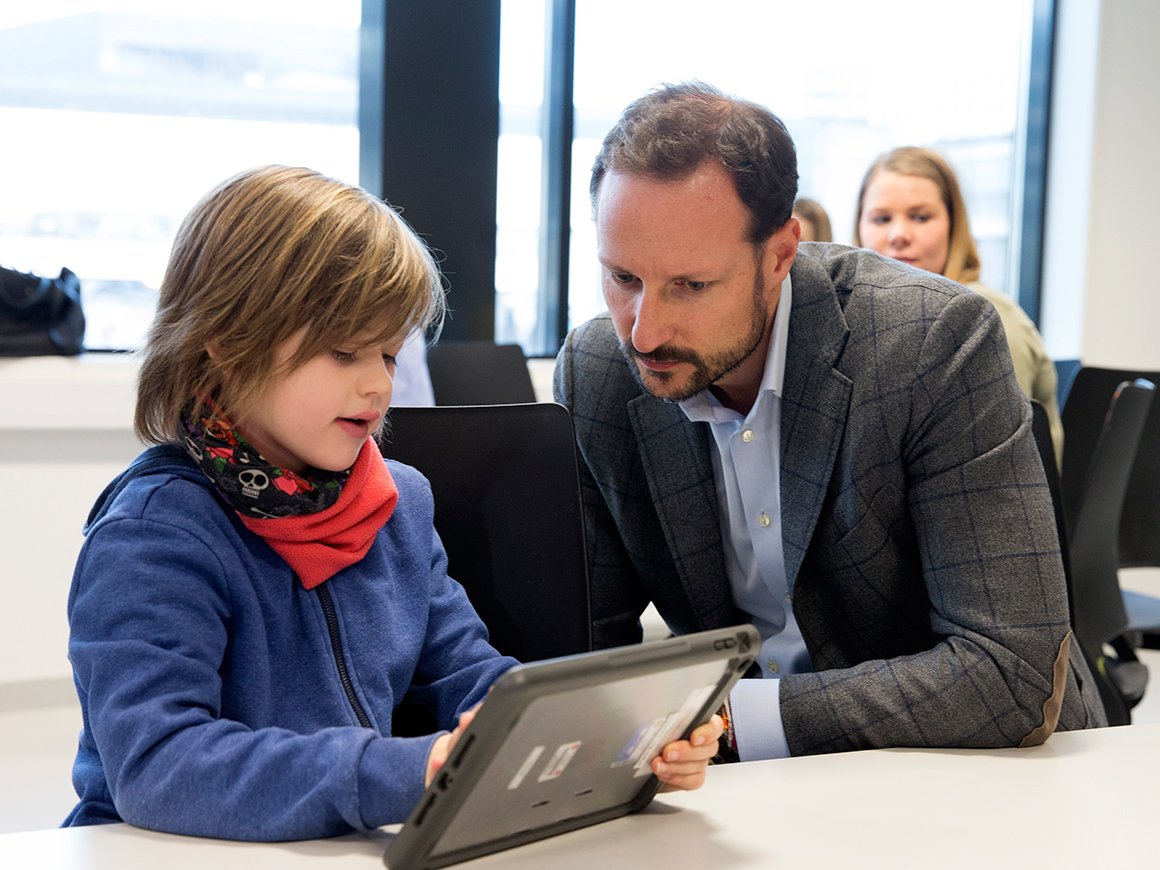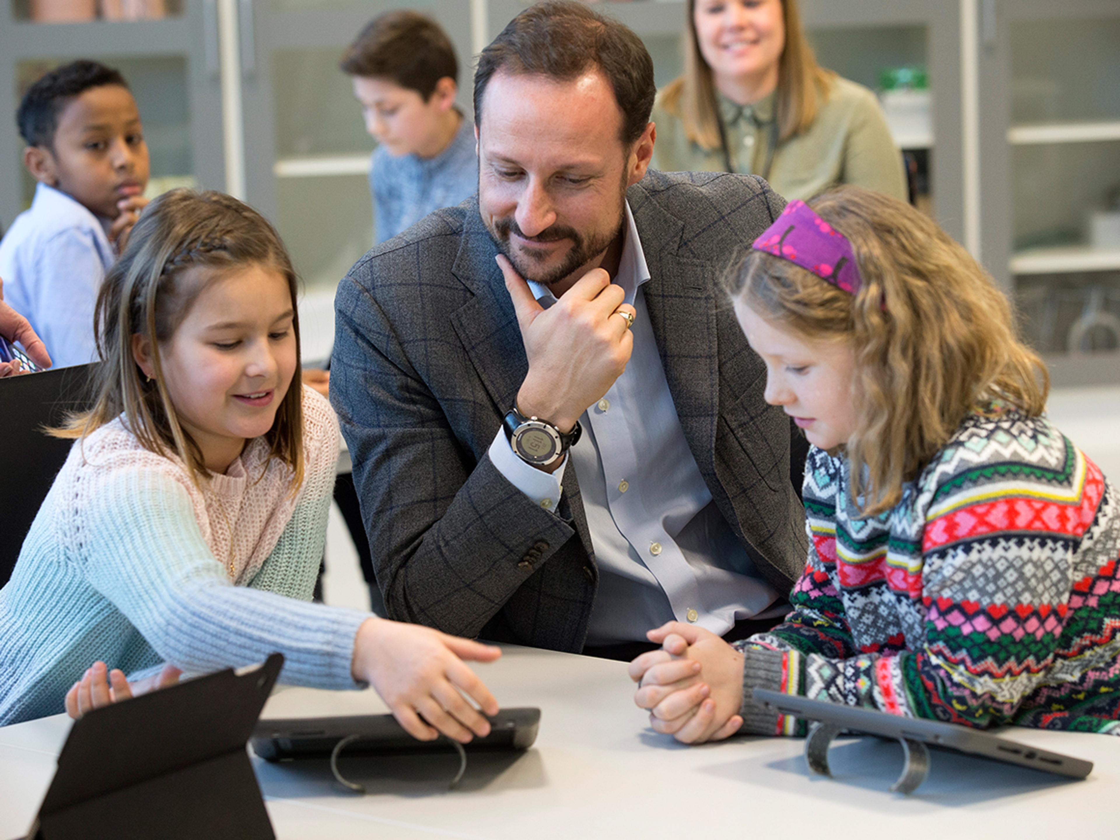 I dag var H.K.H. Kronprinsen på skolebenken for å lære meir om norsk læringsteknologi. Elevane på Teglverket skole bruker teknologien kvar dag og hadde mykje å lære bort.