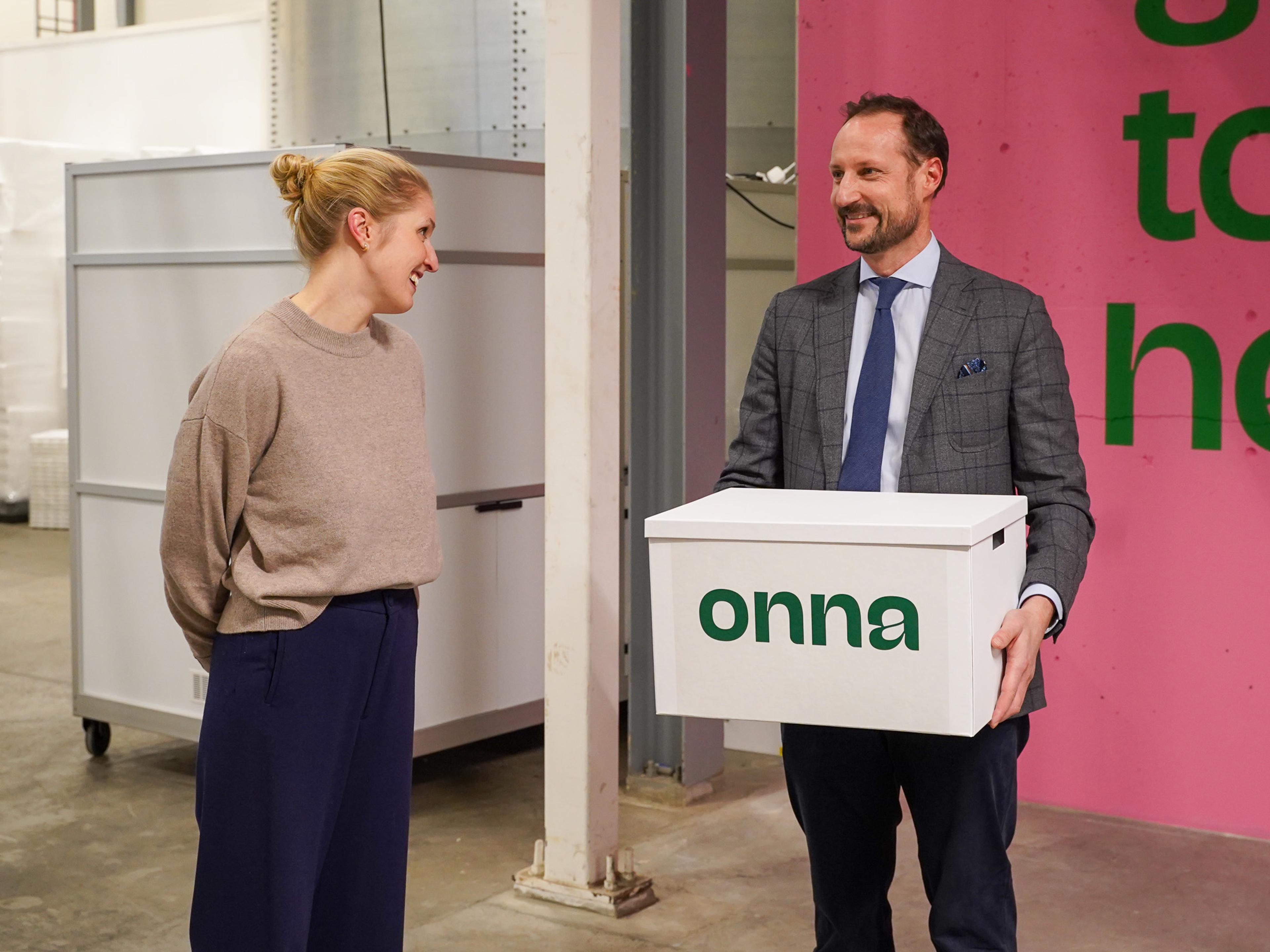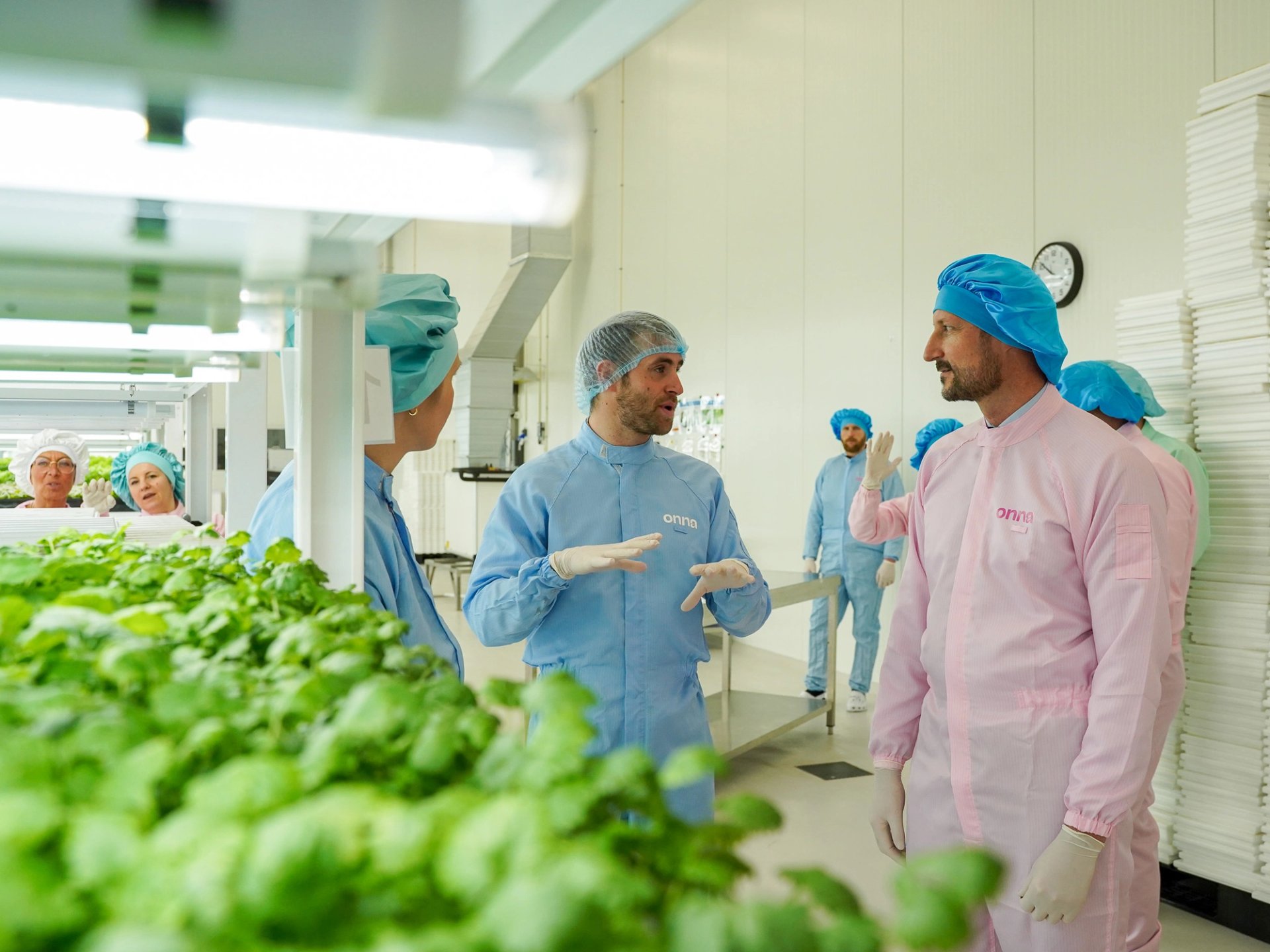 Fra Langhus gikk turen videre til Onna Greens på Vanem i Moss. Her produseres salat og urter innendørs – i høyden, uten jord, i et kontrollert miljø og helt uten plantevernmidler. Kronprinsen fikk selv prøve seg som bonde og smake på friske og ferske salatprodukter.