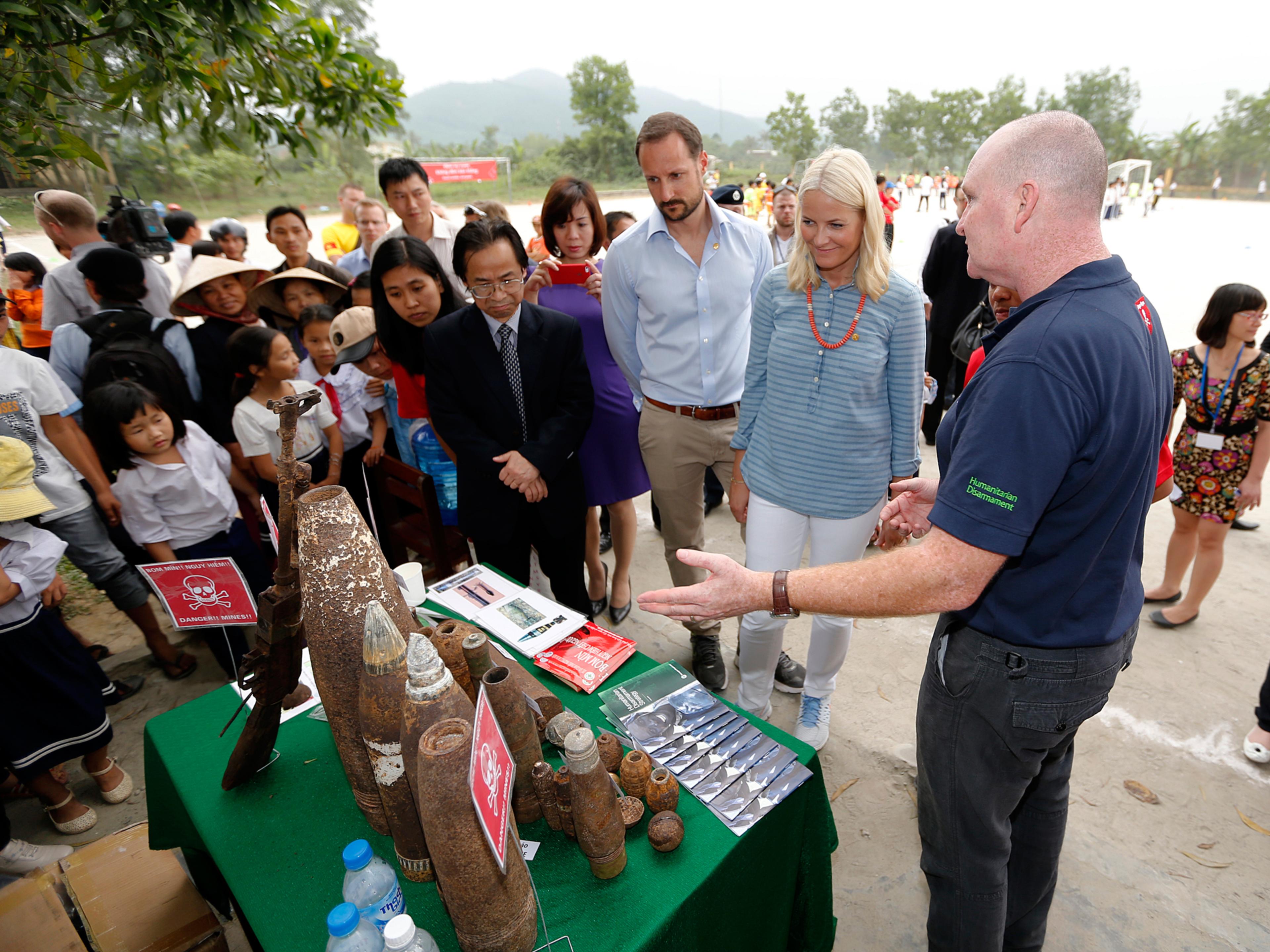 Kronprinsparet fikk en orientering om arbeidet Folkehjelpa gjør i Vietnam. De er aktive i flere deler av landet, med kartlegging, merking og fjerning av miner. Minene detoneres under kontrollerte forhold, slik at veier og jordbruksarealer igjen blir trygge. Kronprinsen og Kronprinsessen fikk selv detonere en klasebombe under dagens demonstrasjon.