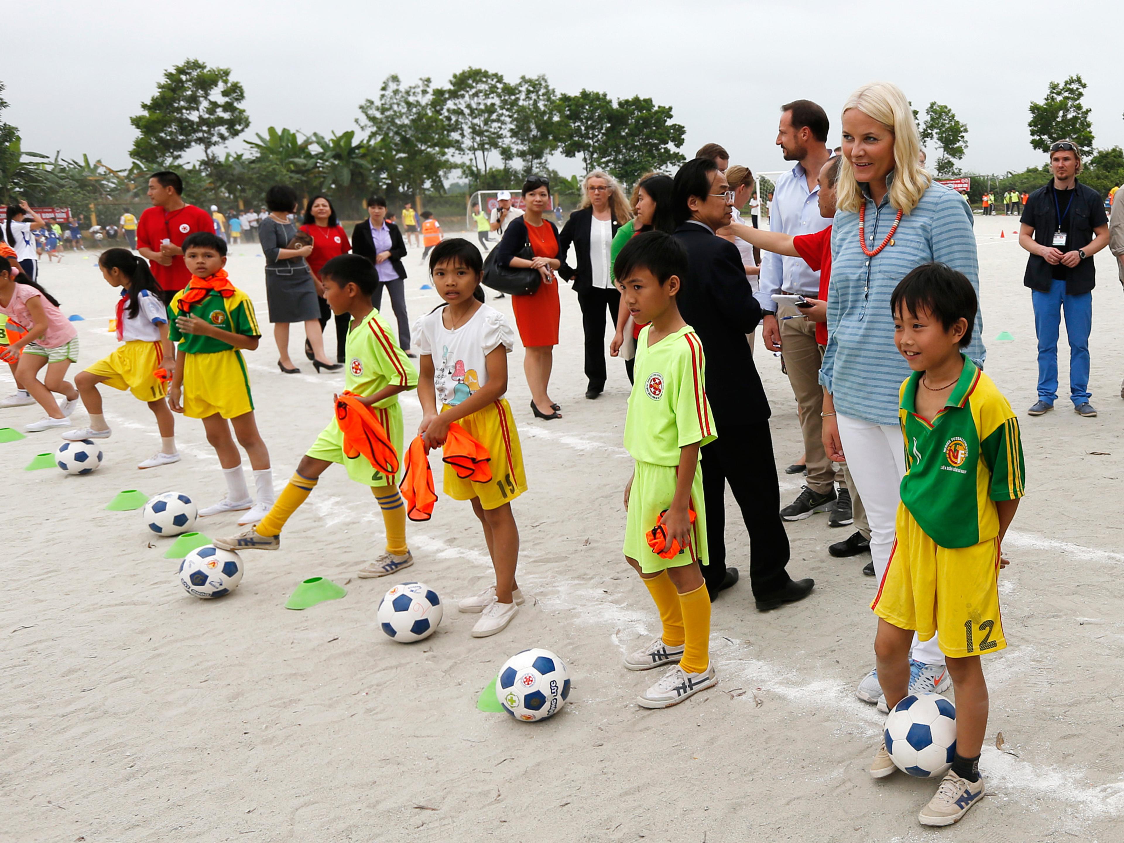 I dag var det fotballkamp på Huong An, og Kronprinsparet fikk æren av kick off. De fikk også snakke med barn, foreldre og lærere om prosjektet.